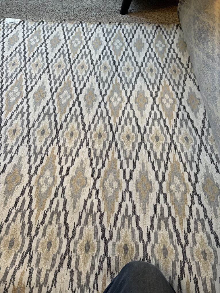 Selling a full 20+ yard roll of brand new outdoor fabric, perfect for upholstery, cushions, pillows, curtains, or any patio project. Features a stylish neutral Ikat diamond pattern in cream, tan, and gray tones — versatile and modern.\