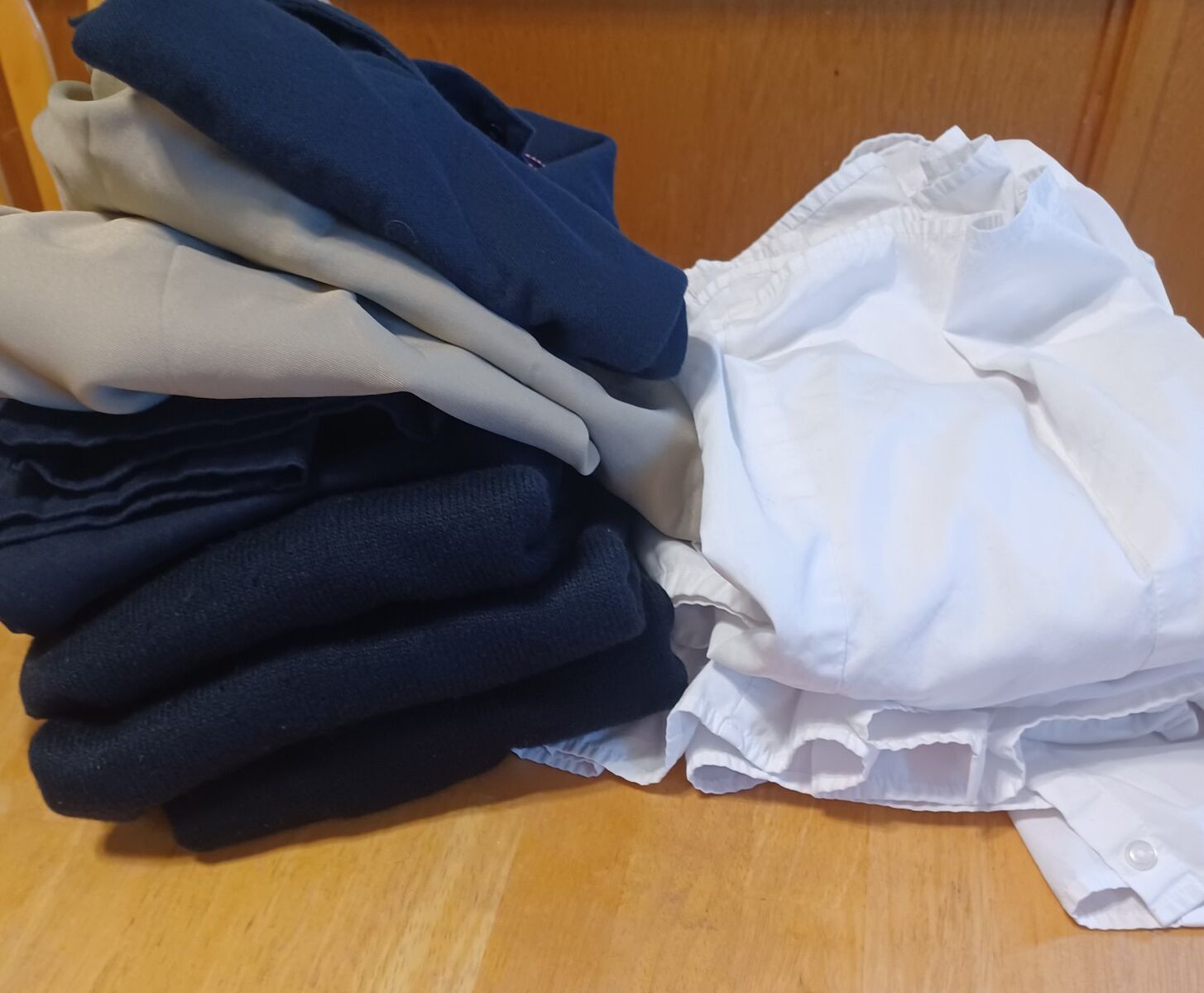 bundle contains: 3 Navy blue vests (2-18/20 size, 1 medium size) 2 - tan skirts (size 14) 1 - navy blue pants (size 16) 3- white collared shirts (size 16) 2 - white collared shirts (size 18) 1 - navy blue polo shirt (size 14/16) 1 - gray skirt (size 5/6)