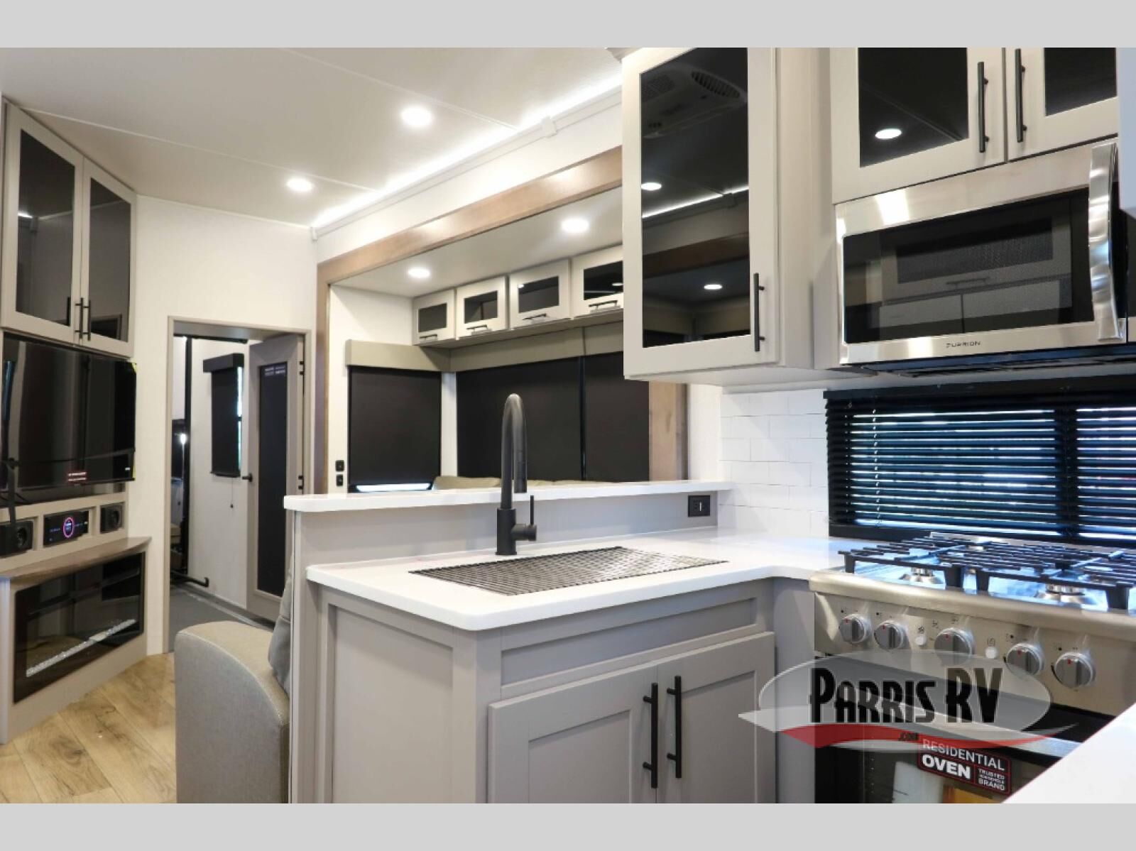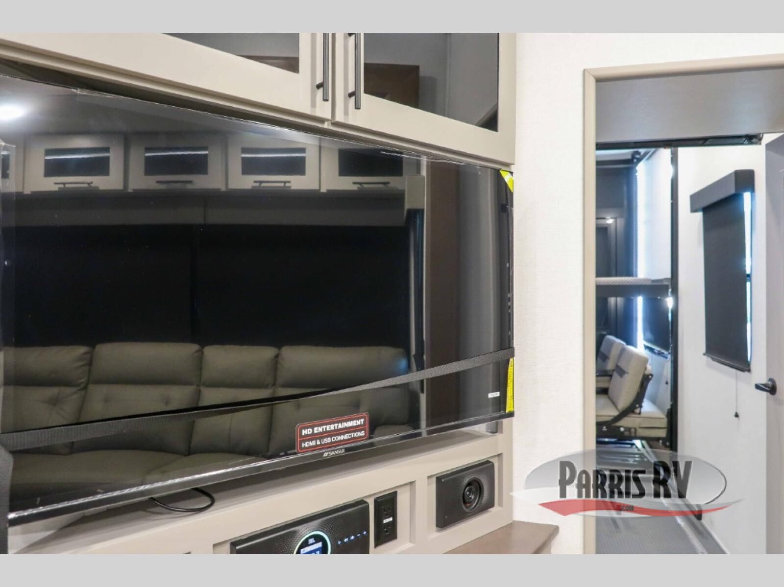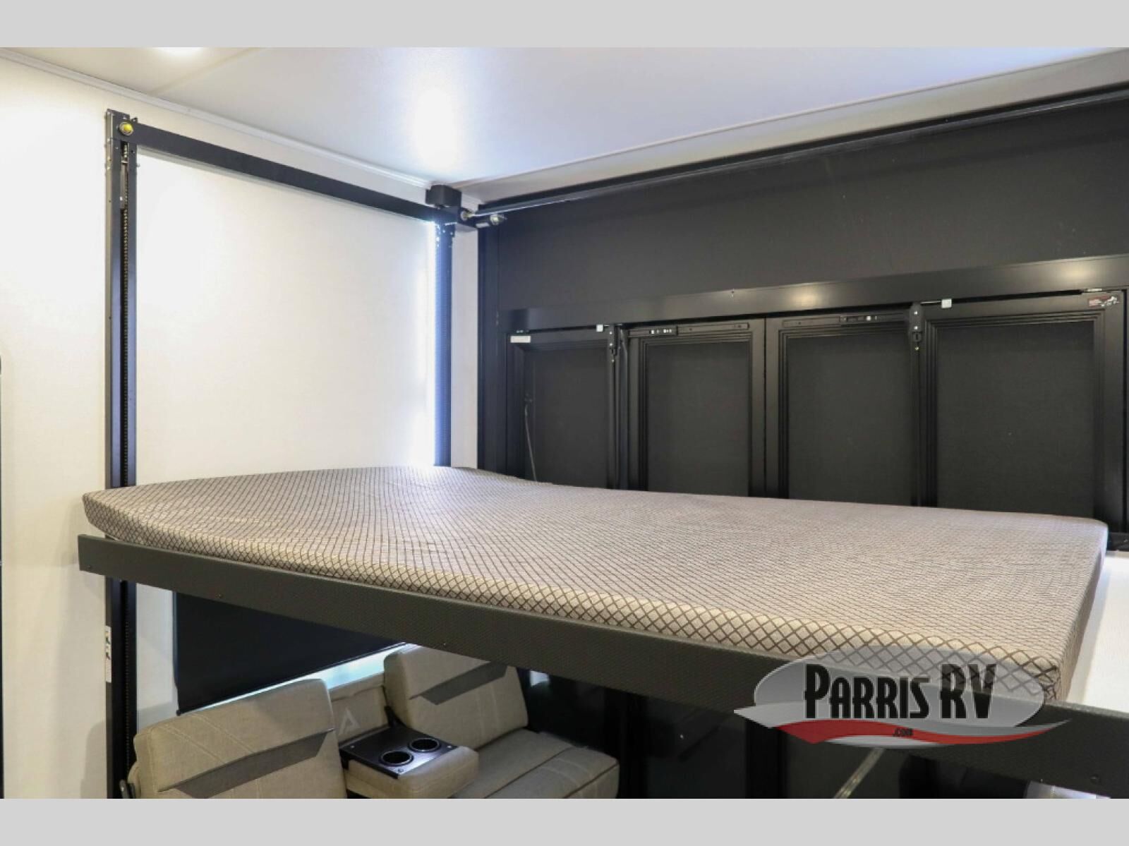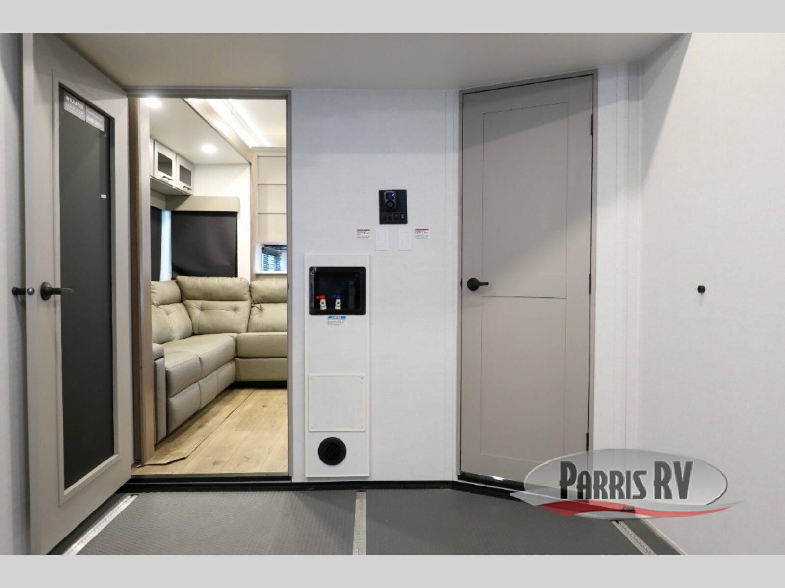 The whole gang will love camping in this toy hauler with a 14' garage for your toys and gear. Once you have arrived at your destination, you can set up the HappiJac roll-over sofas with a queen bed above them, and also a loft which opens to the garage area as well. A half bath is also available off the garage which is an added convenience for those sleeping in this converted area, and for those coming in off the trail so that they do not have to track all through the main unit to use the bathroom. The chef can prepare great meals for their hungry crew with the fully equipped kitchen including a four burner cooktop, a stainless steel 12V refrigerator, large sink, and plenty of countertop prep space. The rest of the gang can be relaxing on the large L-shaped sofa slide watching the 50" HDTV and enjoying the fireplace, or playing a game of cards at the dining table with four chairs. The front private bedroom features a king bed slide for more interior space, a flip top dresser for all of your belongings, and a front wardrobe with washer and dryer prep, plus it has an entrance into the dual entry bathroom!
