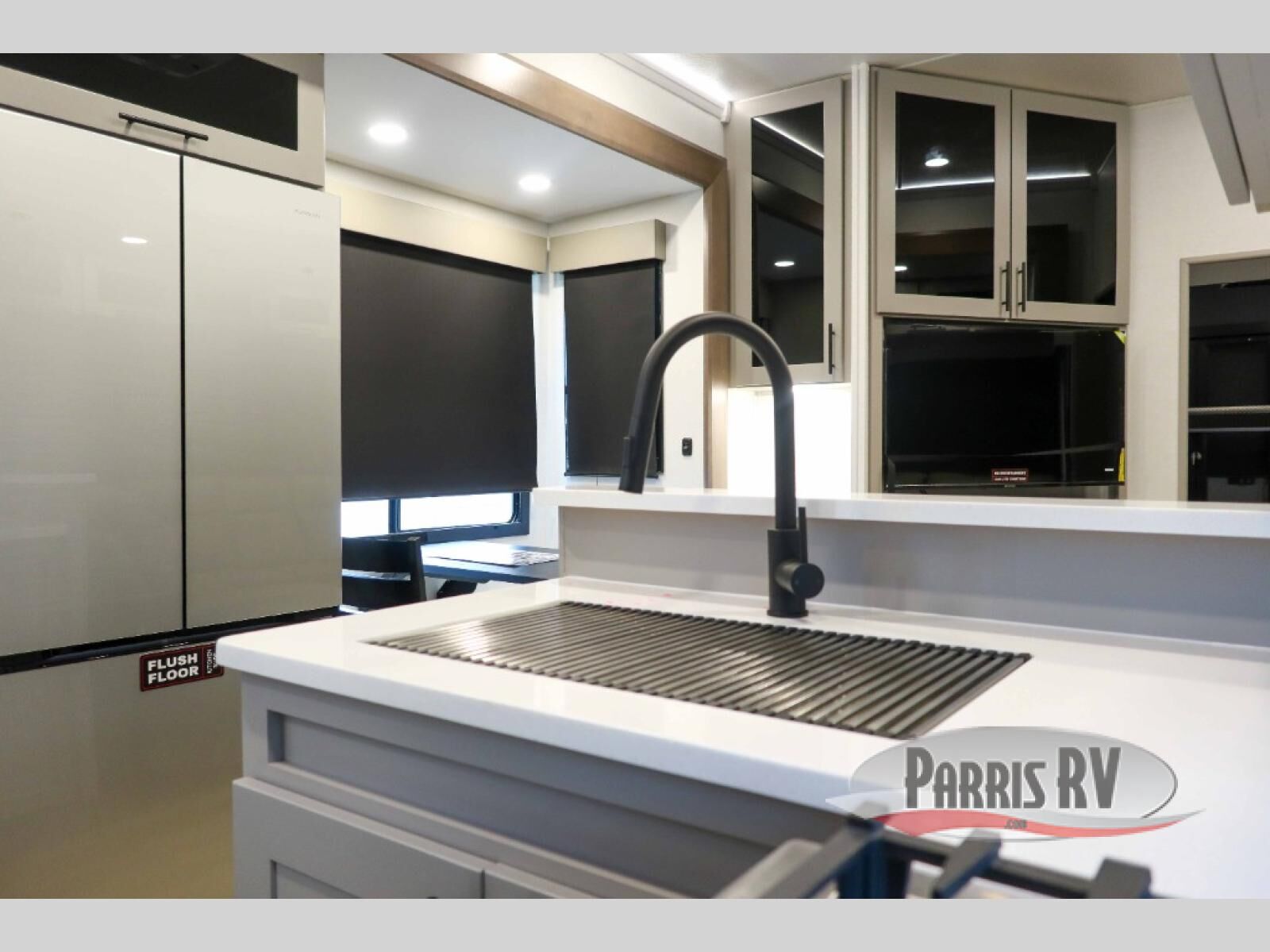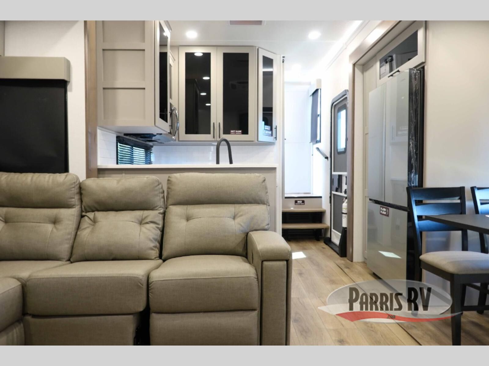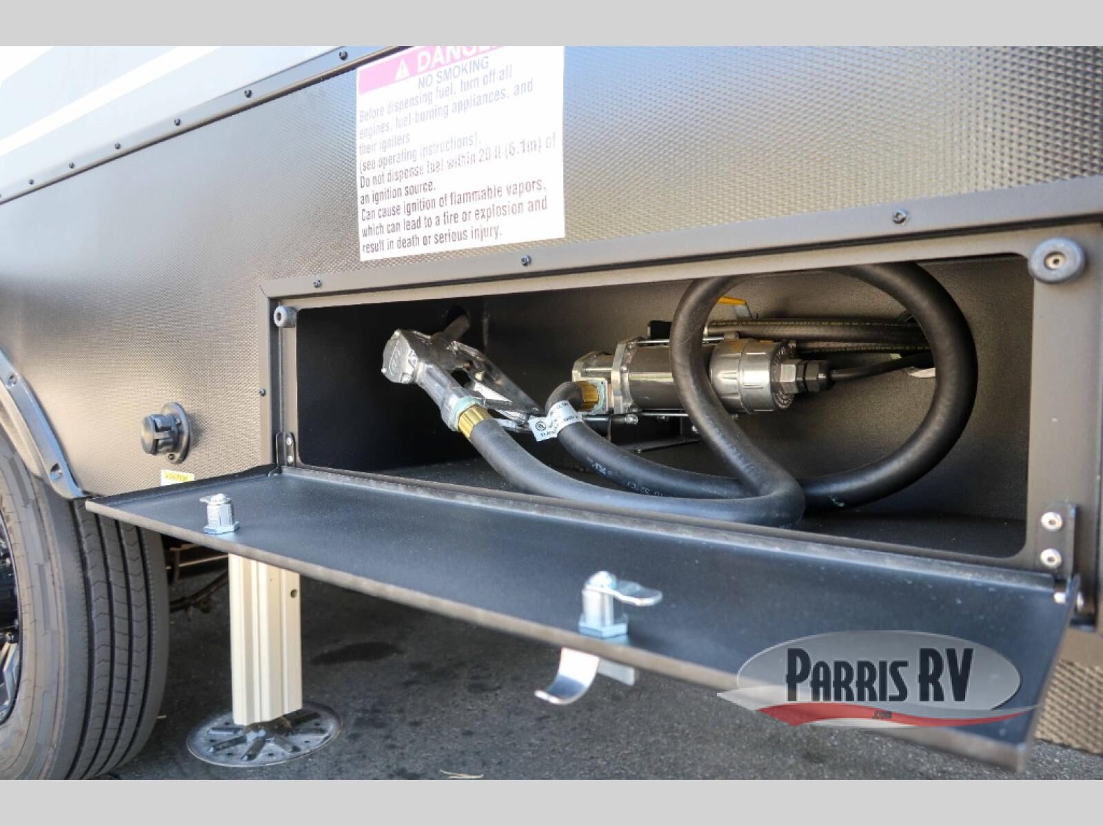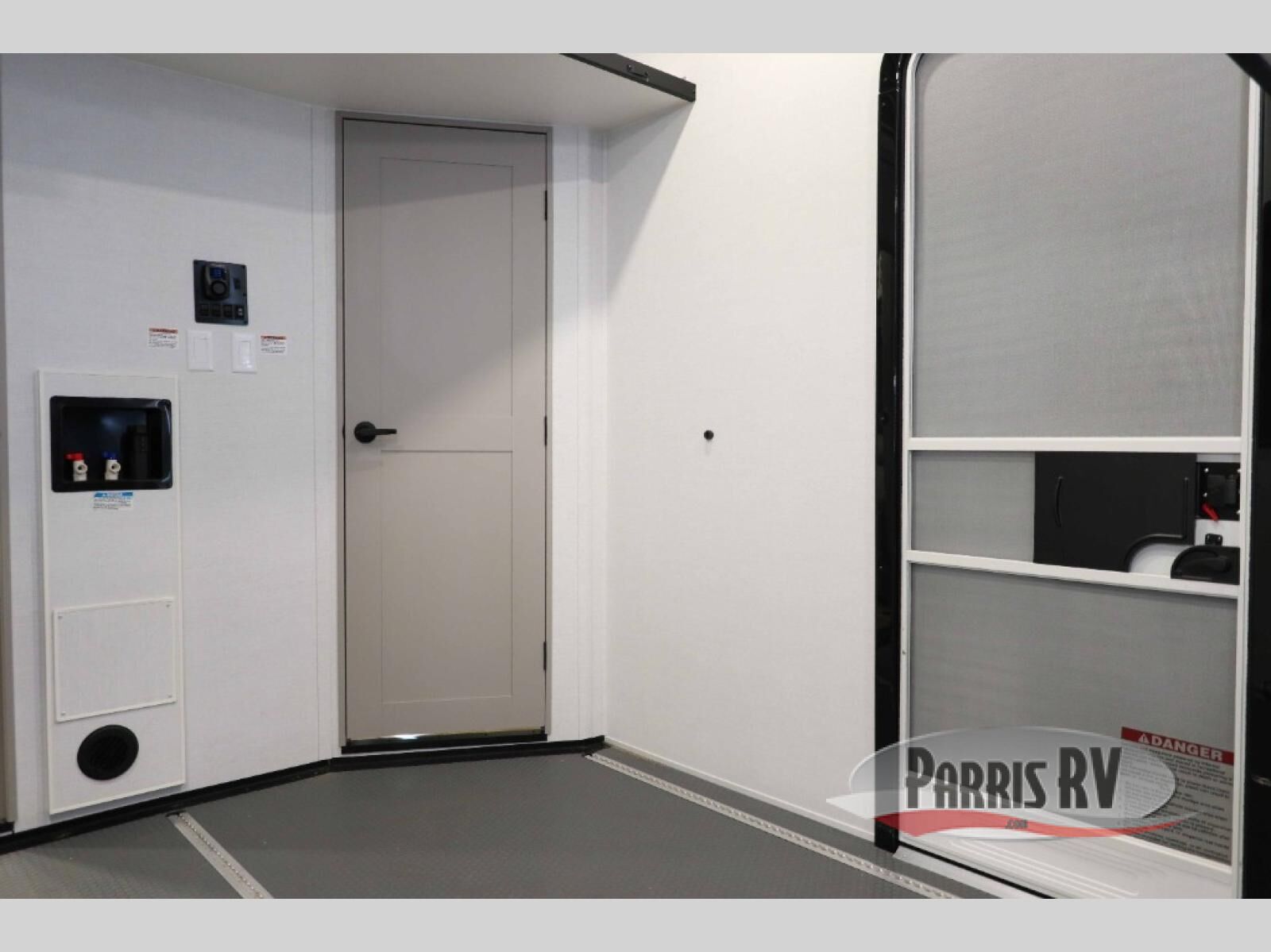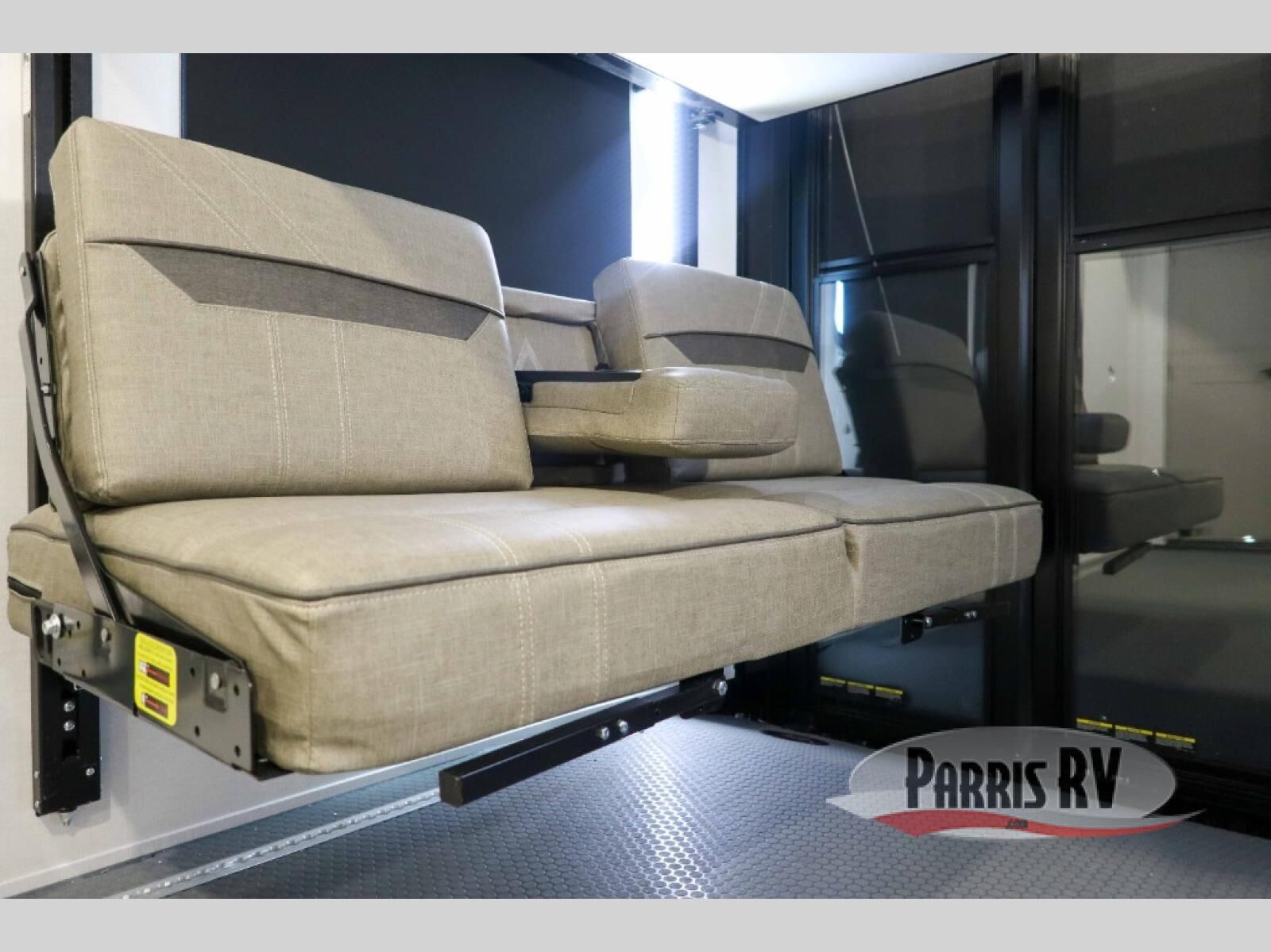 The whole gang will love camping in this toy hauler with a 14' garage for your toys and gear. Once you have arrived at your destination, you can set up the HappiJac roll-over sofas with a queen bed above them, and also a loft which opens to the garage area as well. A half bath is also available off the garage which is an added convenience for those sleeping in this converted area, and for those coming in off the trail so that they do not have to track all through the main unit to use the bathroom. The chef can prepare great meals for their hungry crew with the fully equipped kitchen including a four burner cooktop, a stainless steel 12V refrigerator, large sink, and plenty of countertop prep space. The rest of the gang can be relaxing on the large L-shaped sofa slide watching the 50" HDTV and enjoying the fireplace, or playing a game of cards at the dining table with four chairs. The front private bedroom features a king bed slide for more interior space, a flip top dresser for all of your belongings, and a front wardrobe with washer and dryer prep, plus it has an entrance into the dual entry bathroom!