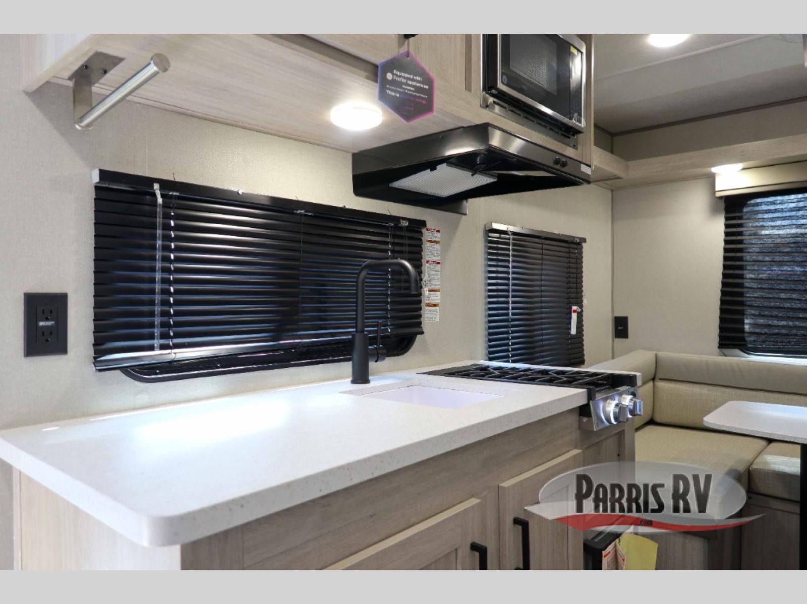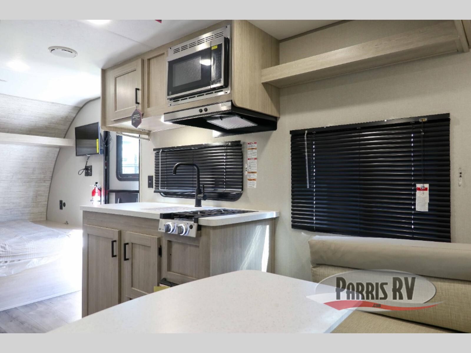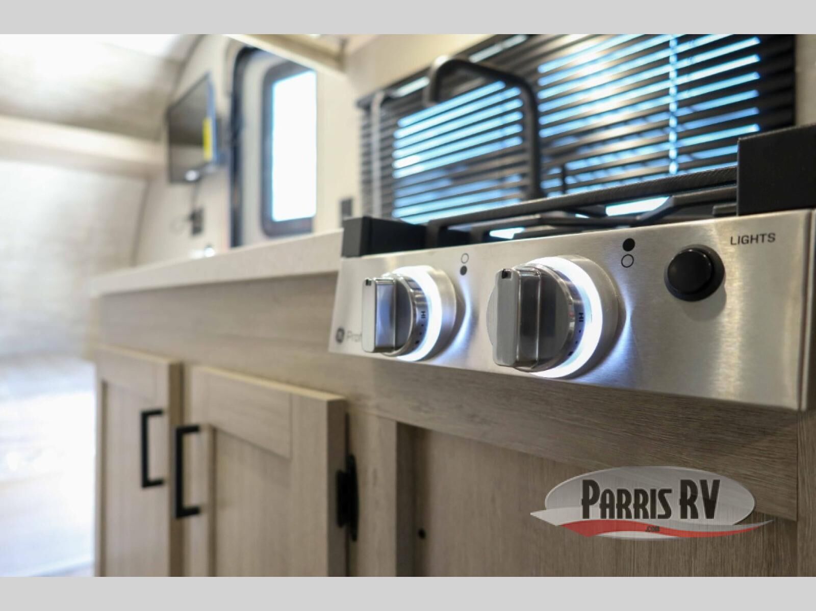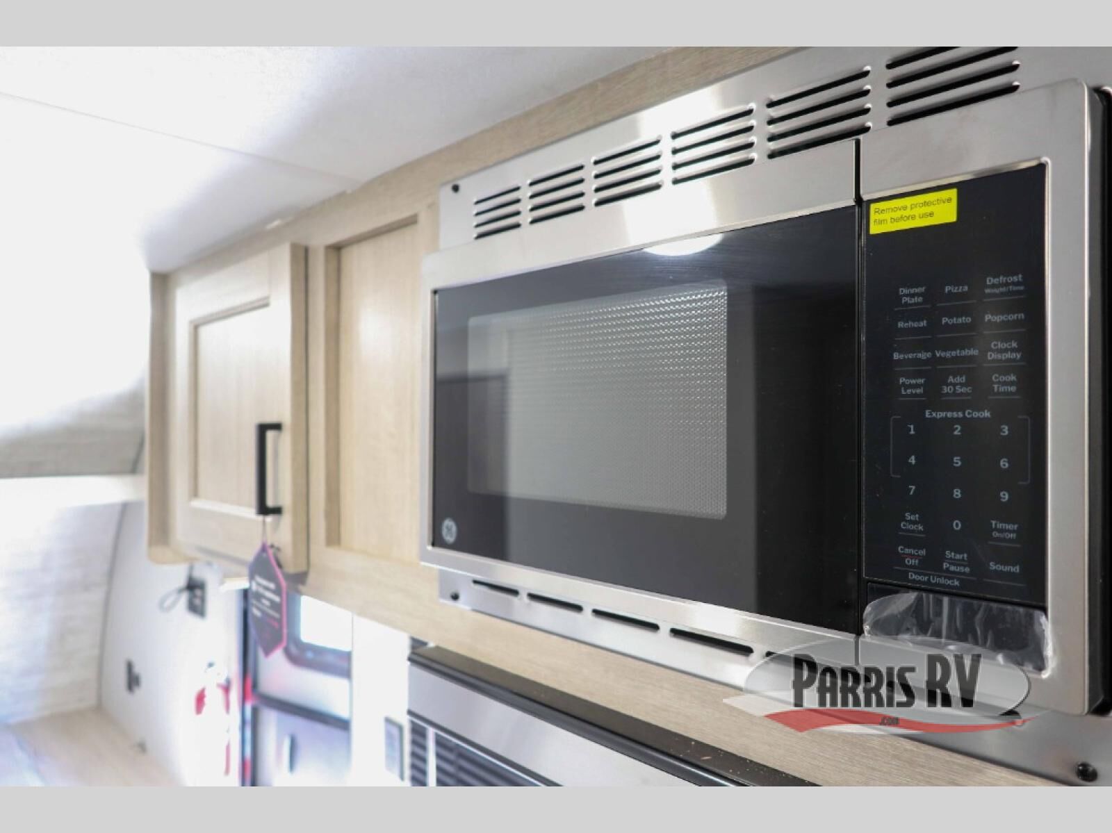 The perfect unit for a cozy weekend retreat for two or three! There is a queen bed up front with overhead storage and more at the foot of the bed to keep your things tidy. The rear of the unit offers a U-shaped dinette with an end table on one end and a handy overhead shelf which is a great spot for meals, watching TV or playing cards and games. A mid-coach bath includes a 36" x 30" shower and toilet with foot flush, plus a storage shelf for necessities. This model also includes a GE two burner cooktop, a GE stainless microwave oven, plus a 3.3 cu. ft. 12V refrigerator to keep food fresh!