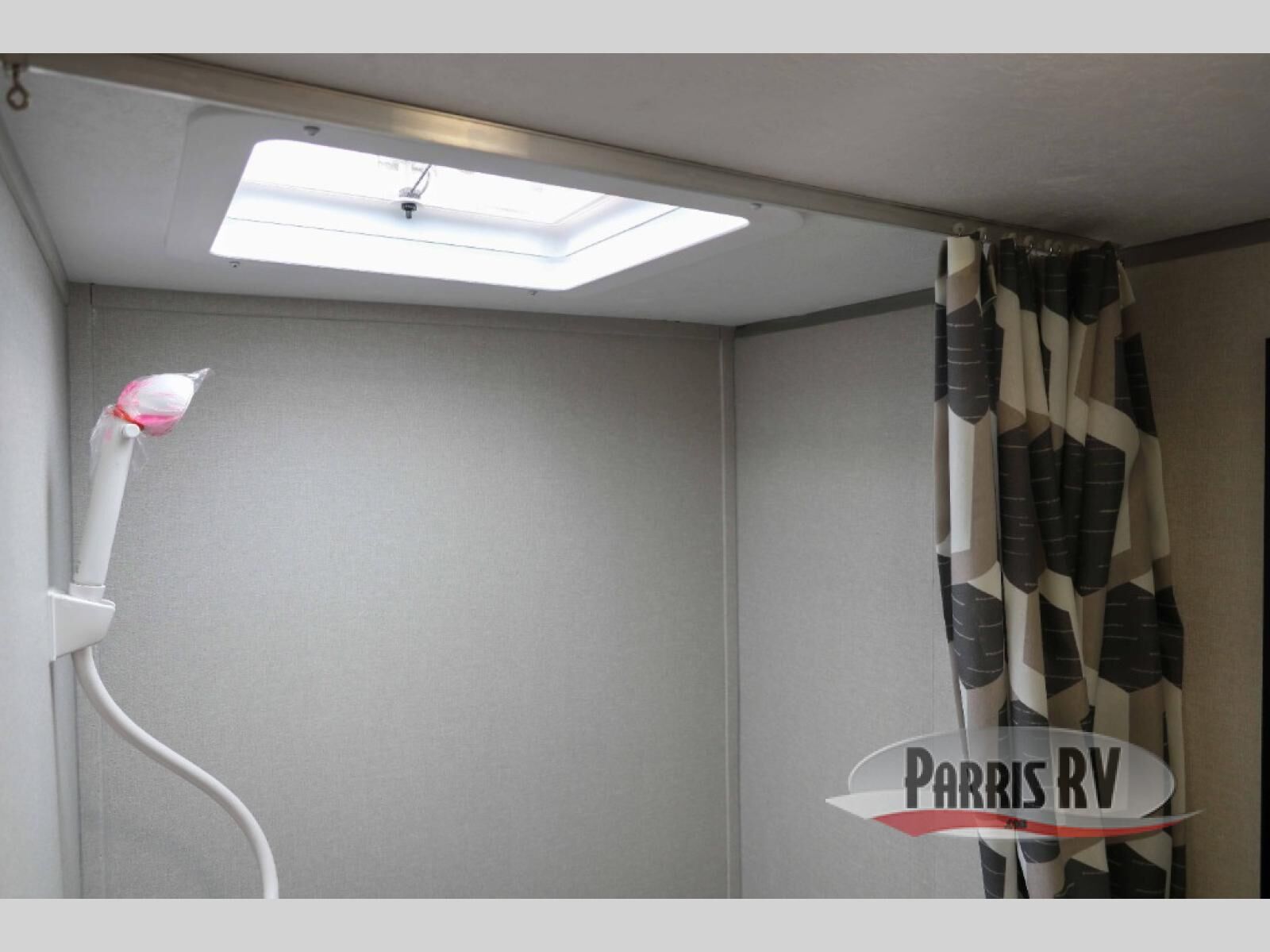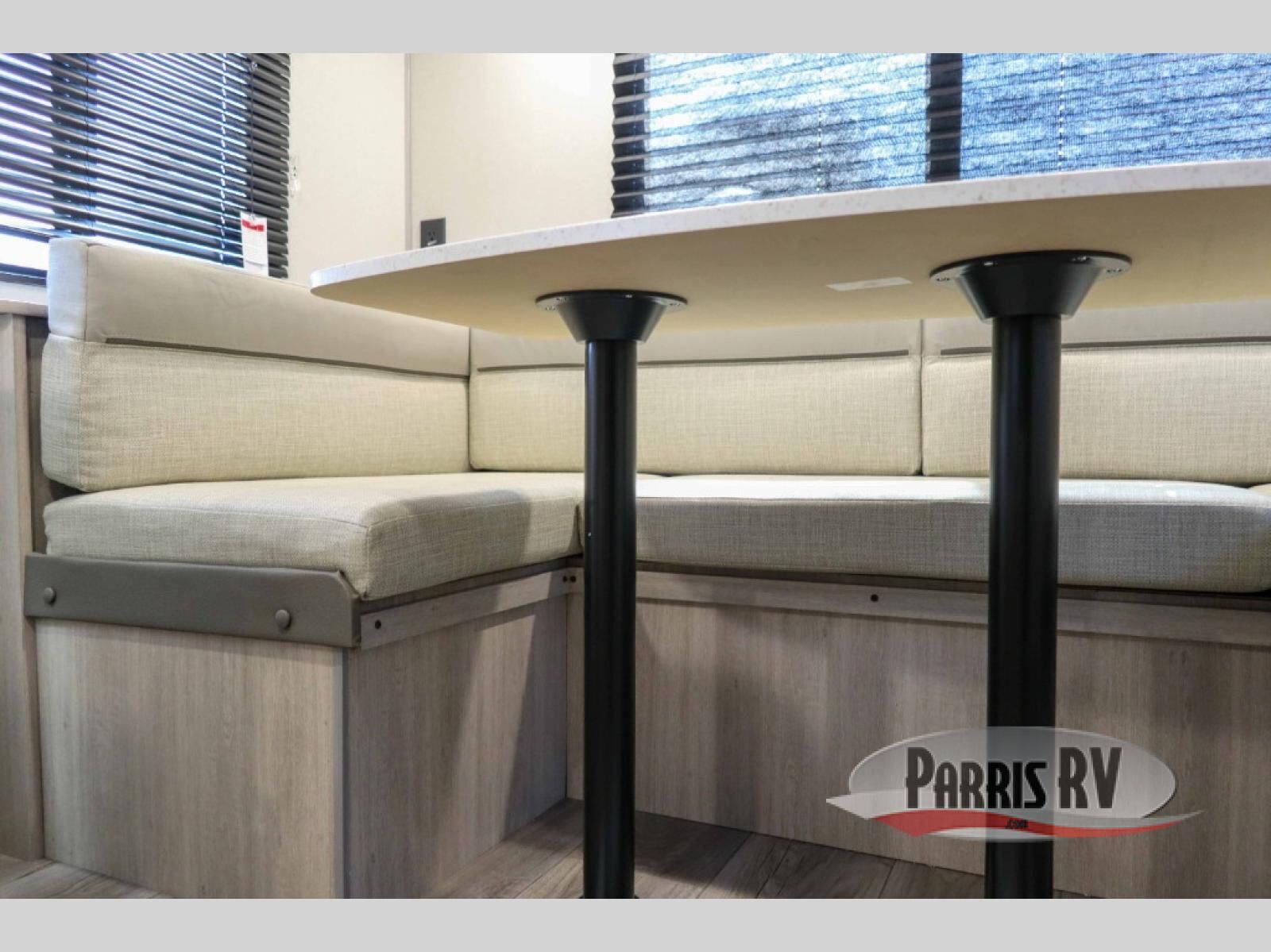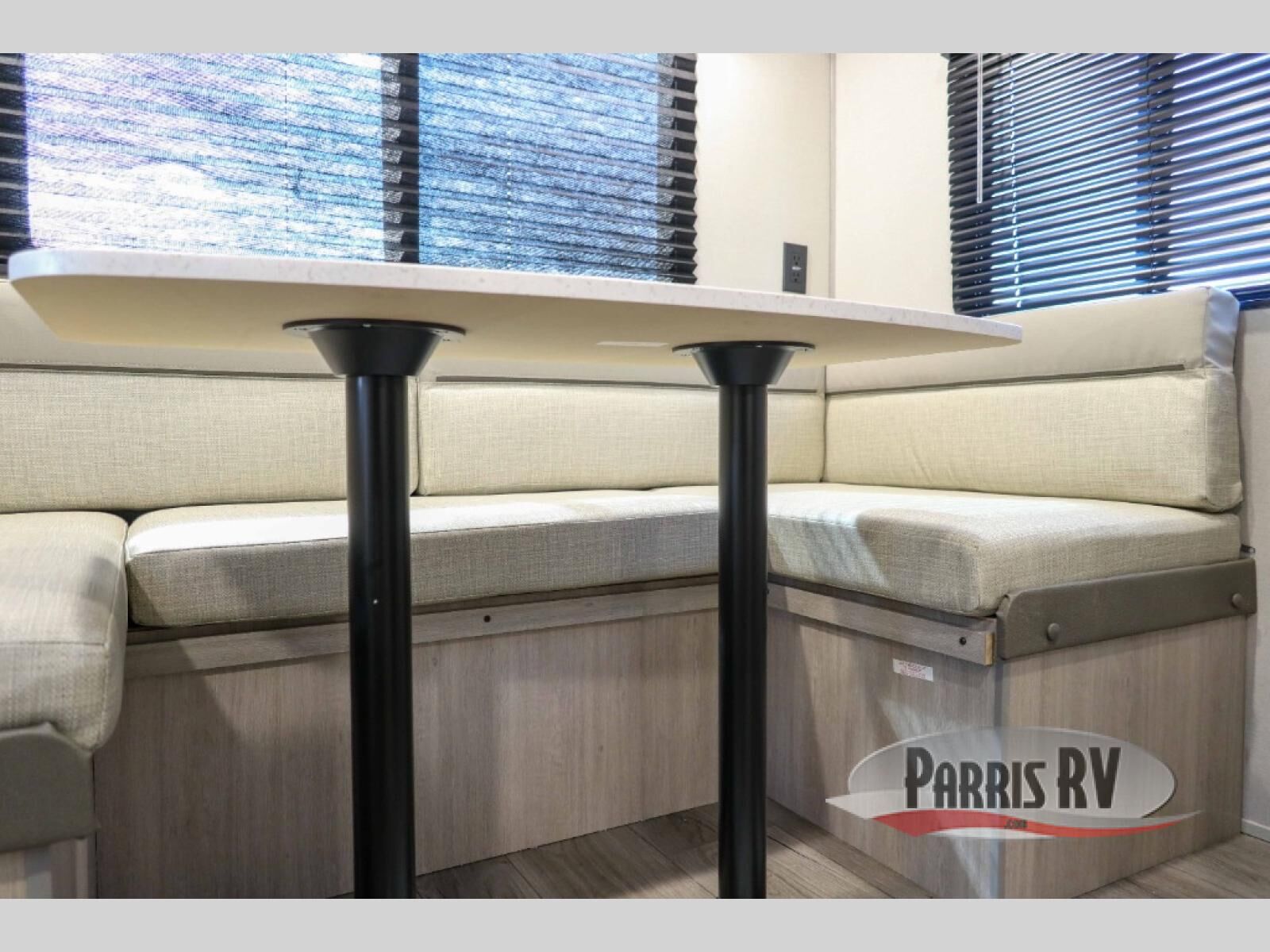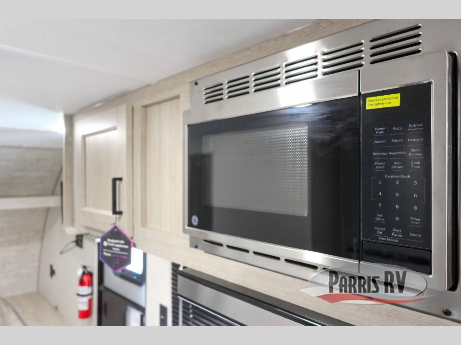 The perfect unit for a cozy weekend retreat for two or three! There is a queen bed up front with overhead storage and more at the foot of the bed to keep your things tidy. The rear of the unit offers a U-shaped dinette with an end table on one end and a handy overhead shelf which is a great spot for meals, watching TV or playing cards and games. A mid-coach bath includes a 36" x 30" shower and toilet with foot flush, plus a storage shelf for necessities. This model also includes a GE two burner cooktop, a GE stainless microwave oven, plus a 3.3 cu. ft. 12V refrigerator to keep food fresh!
