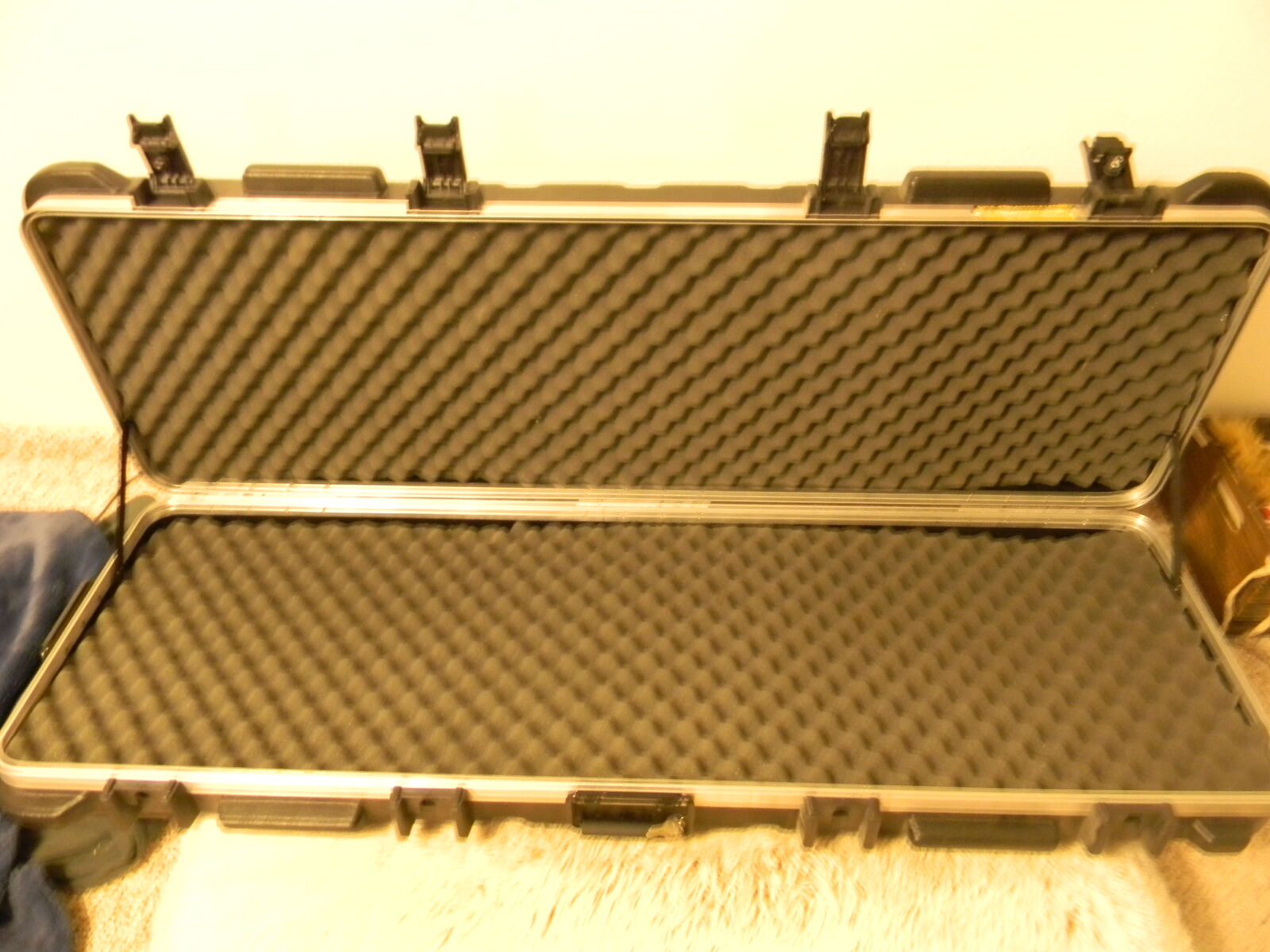 VenmoDOUBLE SIZE RIFLE CASE, WITH TSA LOCKING LATCHES, FOAM LINED, WHEEL ON THE END, HANDLE ON THE OTHER. A FEW SCRATCHES BUT IN GOOD CONDITION. CASE SIZE IS 52" x 16" LATCHES HAVE A KEY LOCK FEATURE.