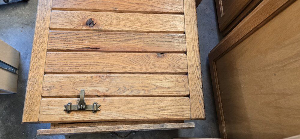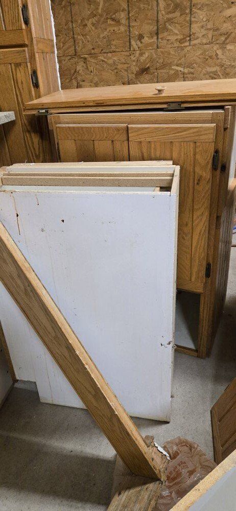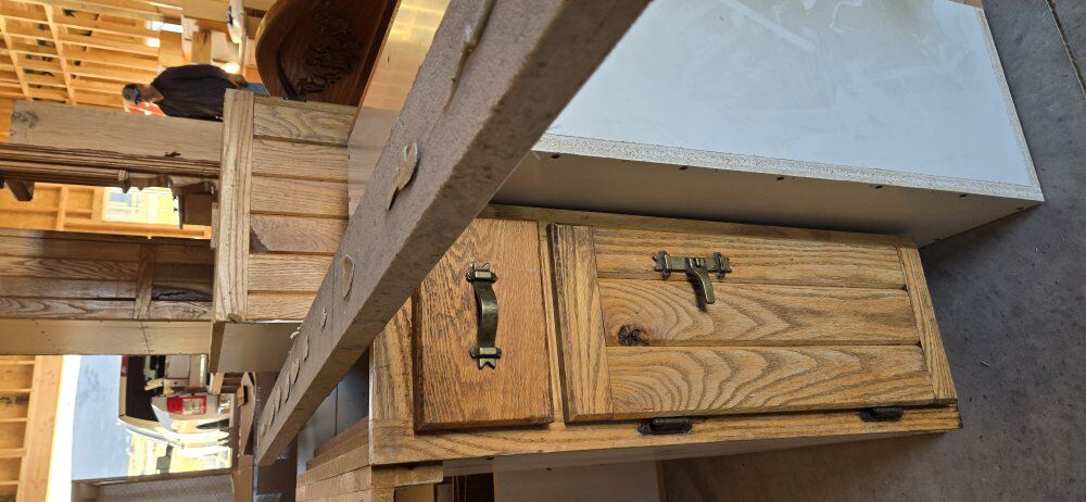 Solid wood Oak kitchen cabinets. Handmade!!Small kitchen or garage storage potential. Would work in a small cabin or tack room as well.