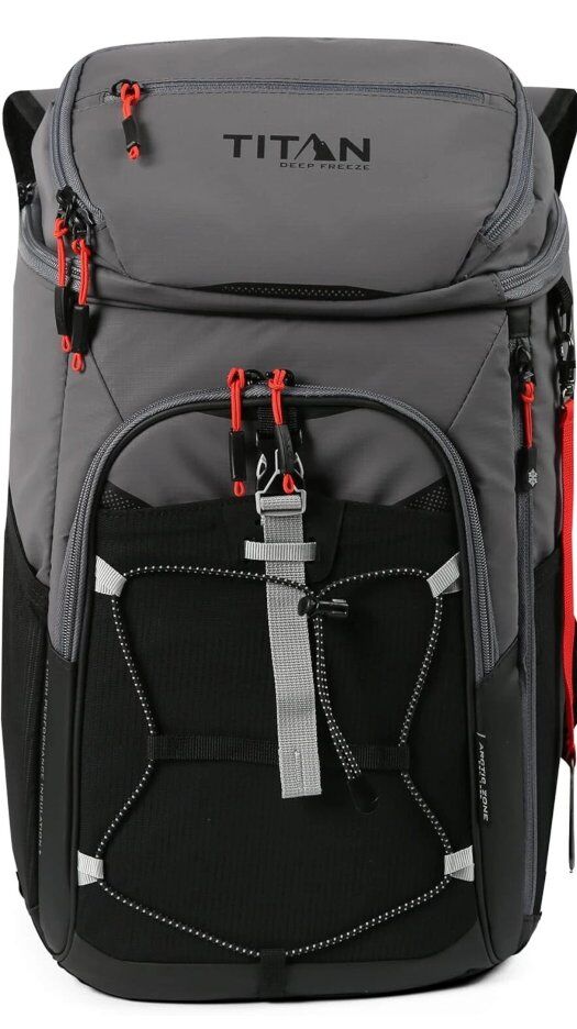 TITAN DEEP FREEZE BACKPACK COOLER: Three insulated compartments; Includes two mesh side pockets, exterior zippered pocket, and bottle opener; Keeps ice up to two days and holds up to 30 cans DEEP FREEZE PERFORMANCE INSULATION: Features Deep Freeze Performance Insulation with a radiant heat barrier and triple layer ColdBlock base for superior cooling; Perfect for storing food and drinks during travel, tailgates, picnics, and more MICROBAN PROTECTION: The interior lining has built-in Microban to help prevent the build-up of odors and stains; Makes the cooler easier to clean after camping or tailgating; Guaranteed to last the lifetime of the product; *Zipper is not leak proof DESIGNED FOR CONVENIENCE AND USABILITY: Includes two removable ice packs; Features adjustable, padded backpack straps, sternum strap, and a padded back with mesh panels for comfortable travel; Exterior material is tough and water and stain repellent EASY TO CLEAN: Our products are meant to last no matter how dirty they get; Most food residues on the interior and exterior of the backpack cooler can be wiped clean with mild soapy water and a damp cloth