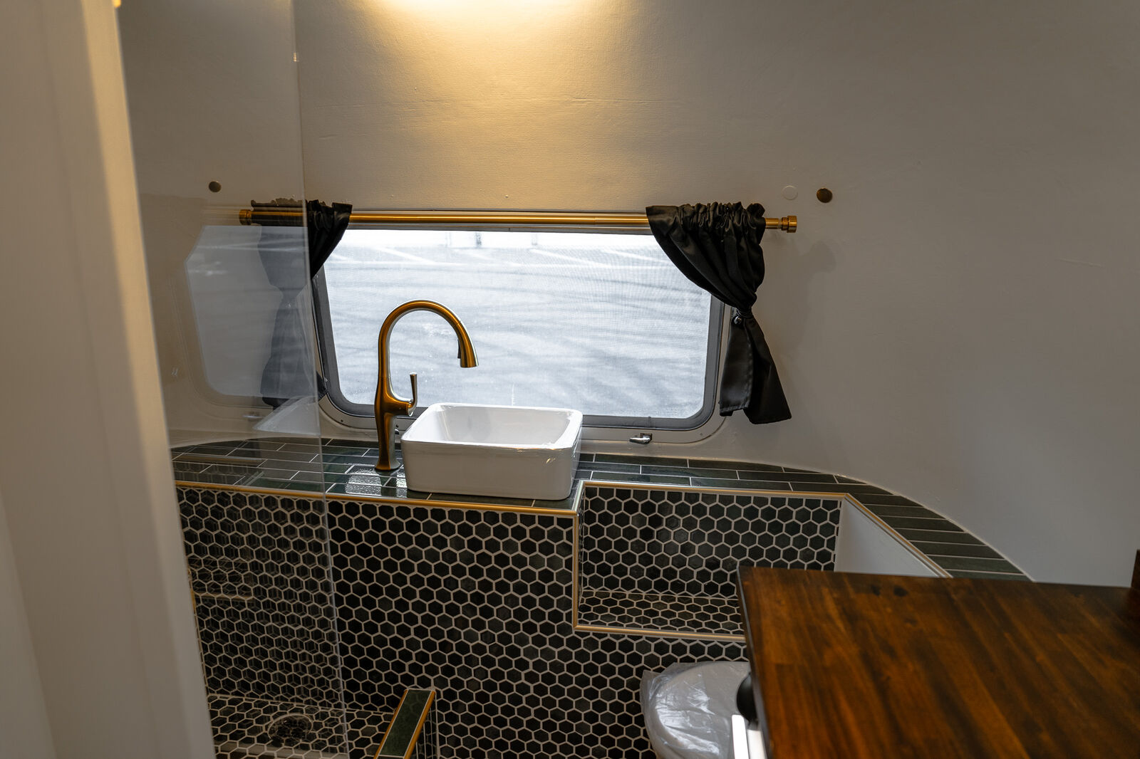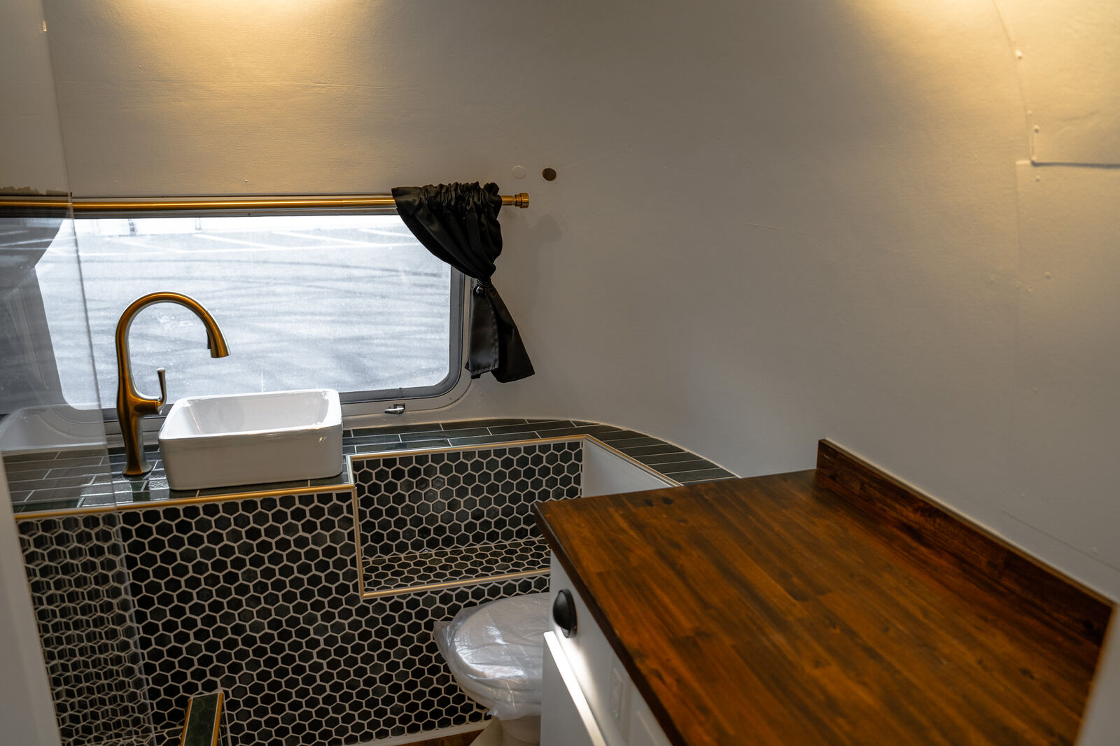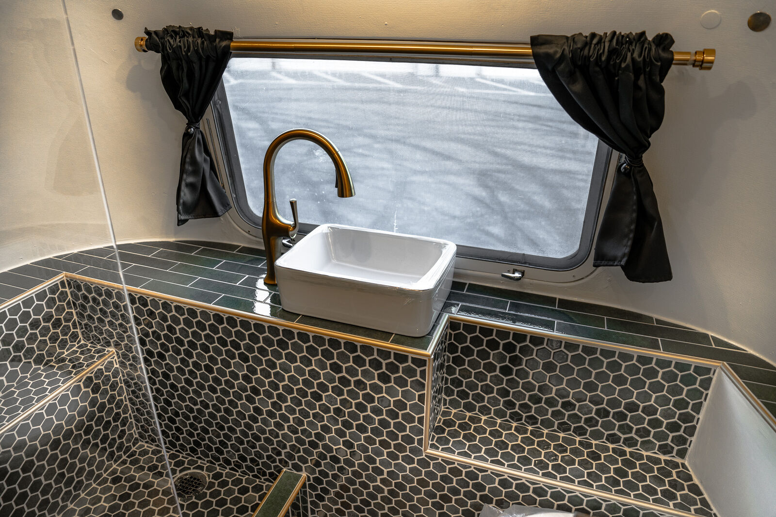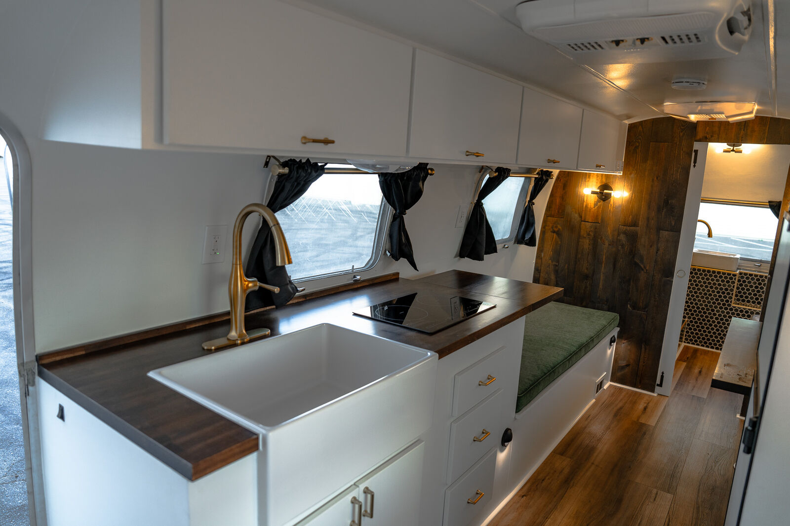 The living space includes a large light and bright open concept kitchen and dining area highlighted with cabinetry with ample storage, a large farmhouse sink, butcher block countertops, 12v/LP fridge, induction cooktop, 12v accent and deck lights, Maxxair fan, and modern fixtures. Soft ambient lighting elevates the space into a cozy, design-forward retreat. The sleeping area has a custom-made mattress to fit the curved front of the Airstream, under cabinet lighting, and overhead storage. Heating and cooling is handled by a Dometic Penguin II A/C with heat pump. The reimagined bathroom features custom cabinetry, large walk-in shower, porcelain Dometic 311 toilet and striking hexagon and gold trimmed tilework.
