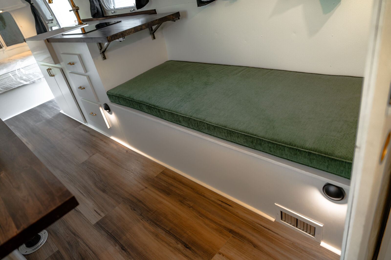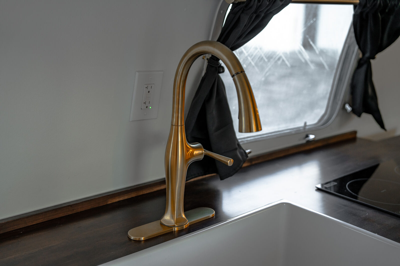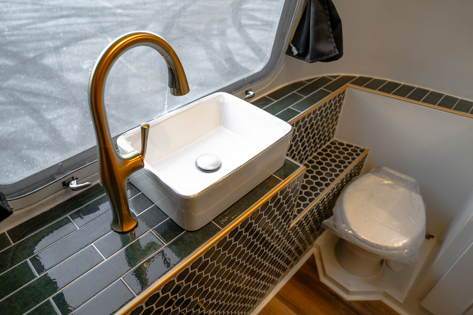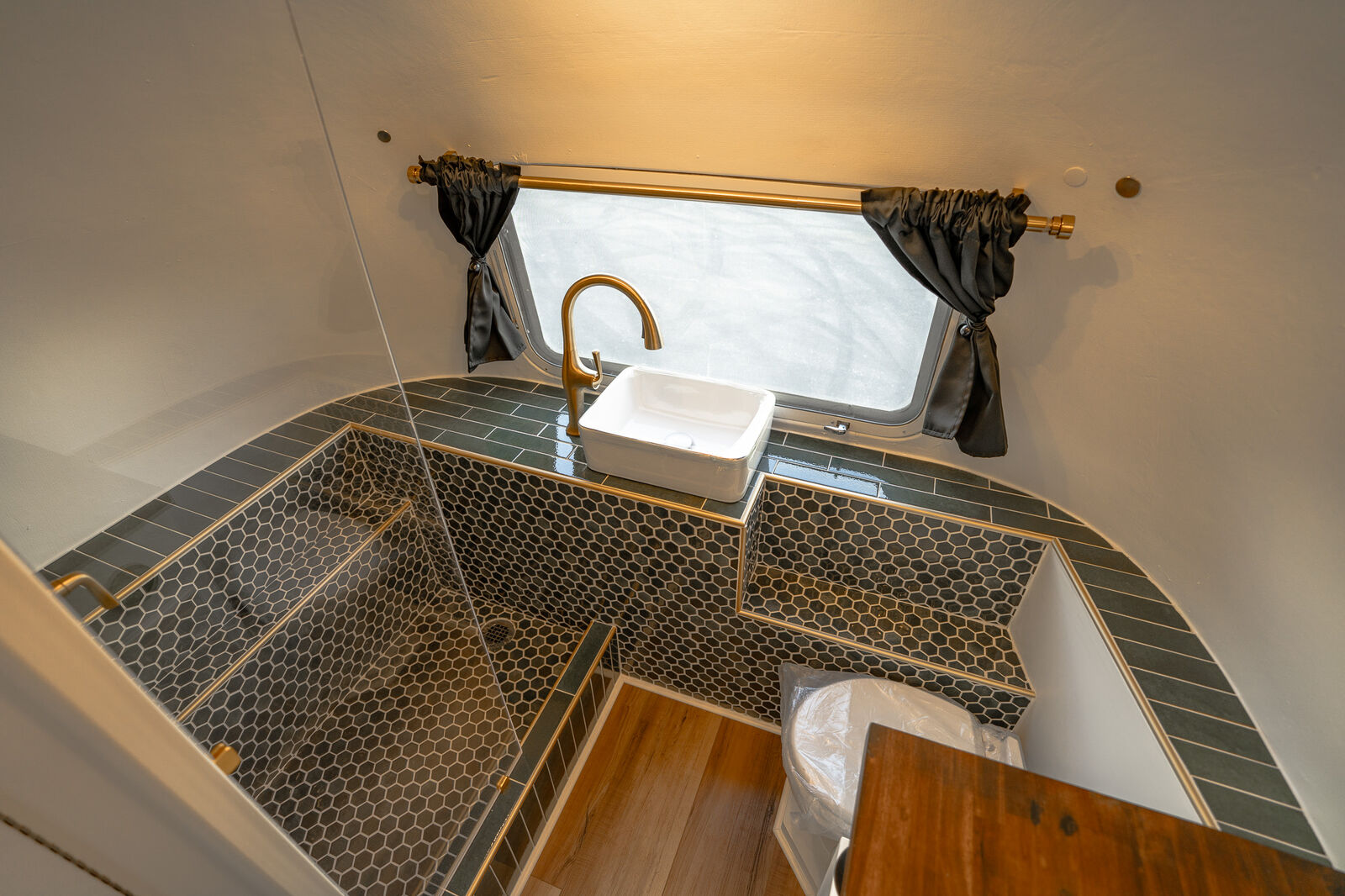 The living space includes a large light and bright open concept kitchen and dining area highlighted with cabinetry with ample storage, a large farmhouse sink, butcher block countertops, 12v/LP fridge, induction cooktop, 12v accent and deck lights, Maxxair fan, and modern fixtures. Soft ambient lighting elevates the space into a cozy, design-forward retreat. The sleeping area has a custom-made mattress to fit the curved front of the Airstream, under cabinet lighting, and overhead storage. Heating and cooling is handled by a Dometic Penguin II A/C with heat pump. The reimagined bathroom features custom cabinetry, large walk-in shower, porcelain Dometic 311 toilet and striking hexagon and gold trimmed tilework.