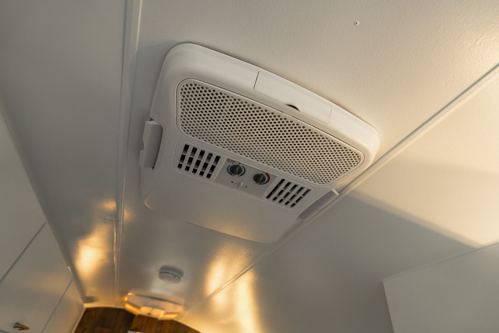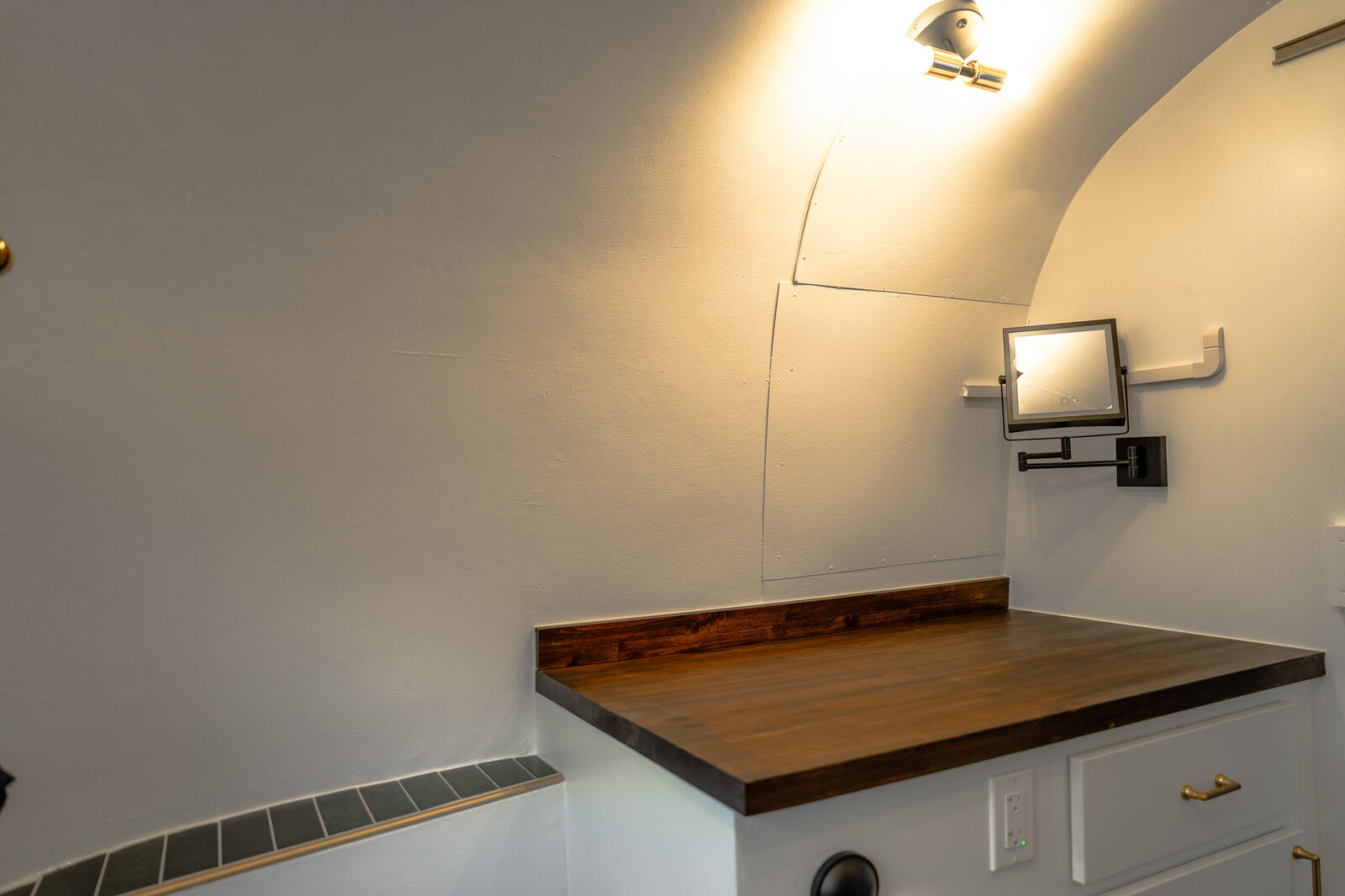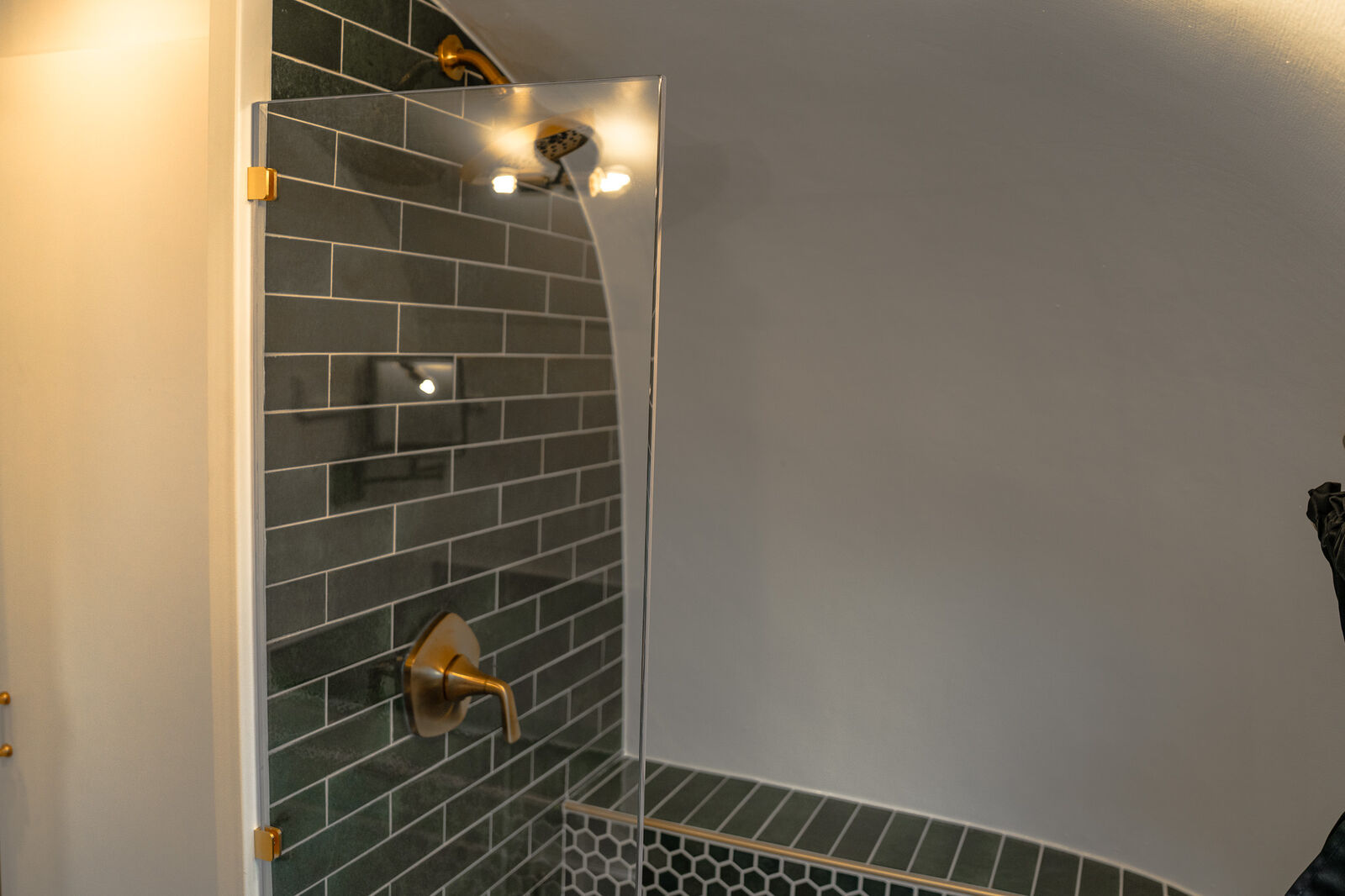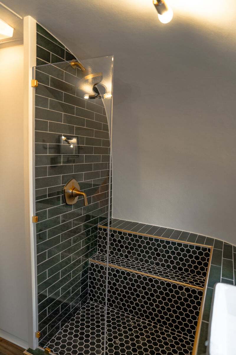 The living space includes a large light and bright open concept kitchen and dining area highlighted with cabinetry with ample storage, a large farmhouse sink, butcher block countertops, 12v/LP fridge, induction cooktop, 12v accent and deck lights, Maxxair fan, and modern fixtures. Soft ambient lighting elevates the space into a cozy, design-forward retreat. The sleeping area has a custom-made mattress to fit the curved front of the Airstream, under cabinet lighting, and overhead storage. Heating and cooling is handled by a Dometic Penguin II A/C with heat pump. The reimagined bathroom features custom cabinetry, large walk-in shower, porcelain Dometic 311 toilet and striking hexagon and gold trimmed tilework.