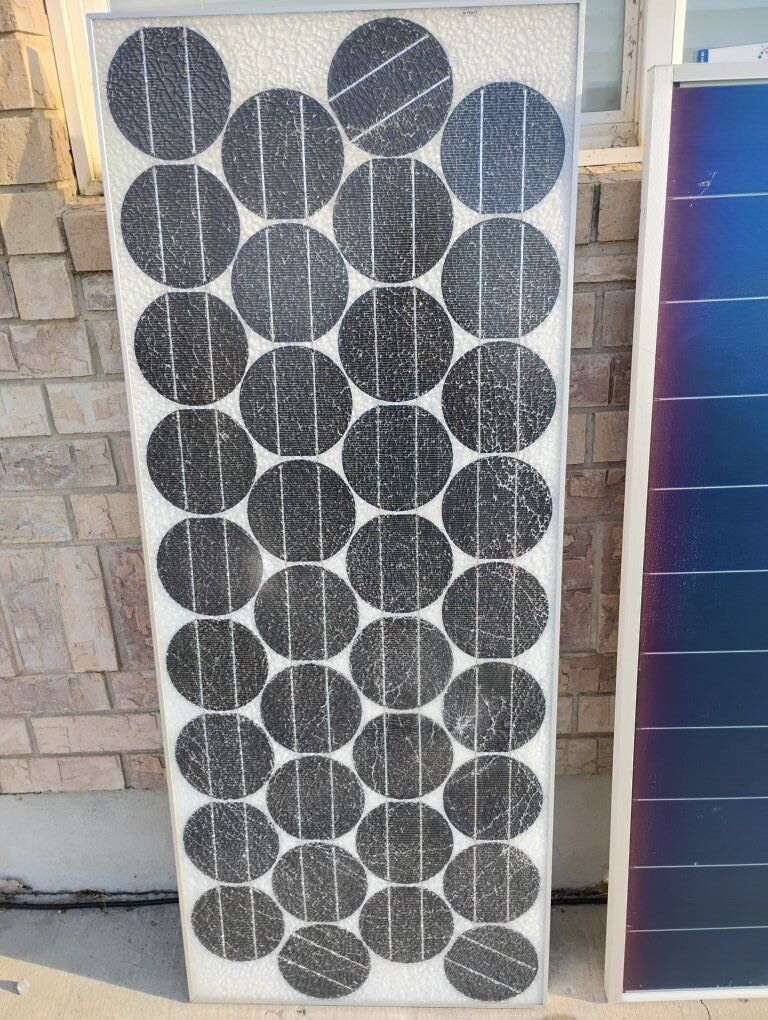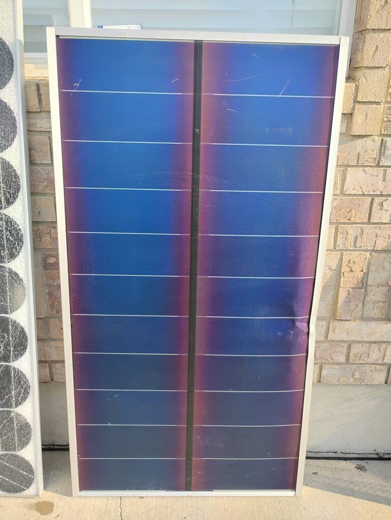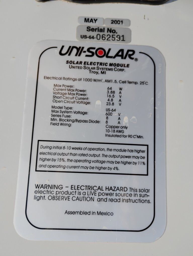 Venmo(Price reduced on 12/9) Up for sale are 2 solar panels, 2001 Uni-solar 64 Watts serial # 06259 and SunWise 85 Watts. Measuring 54" x 29.5" blue panel, 23" x 57" white panel.