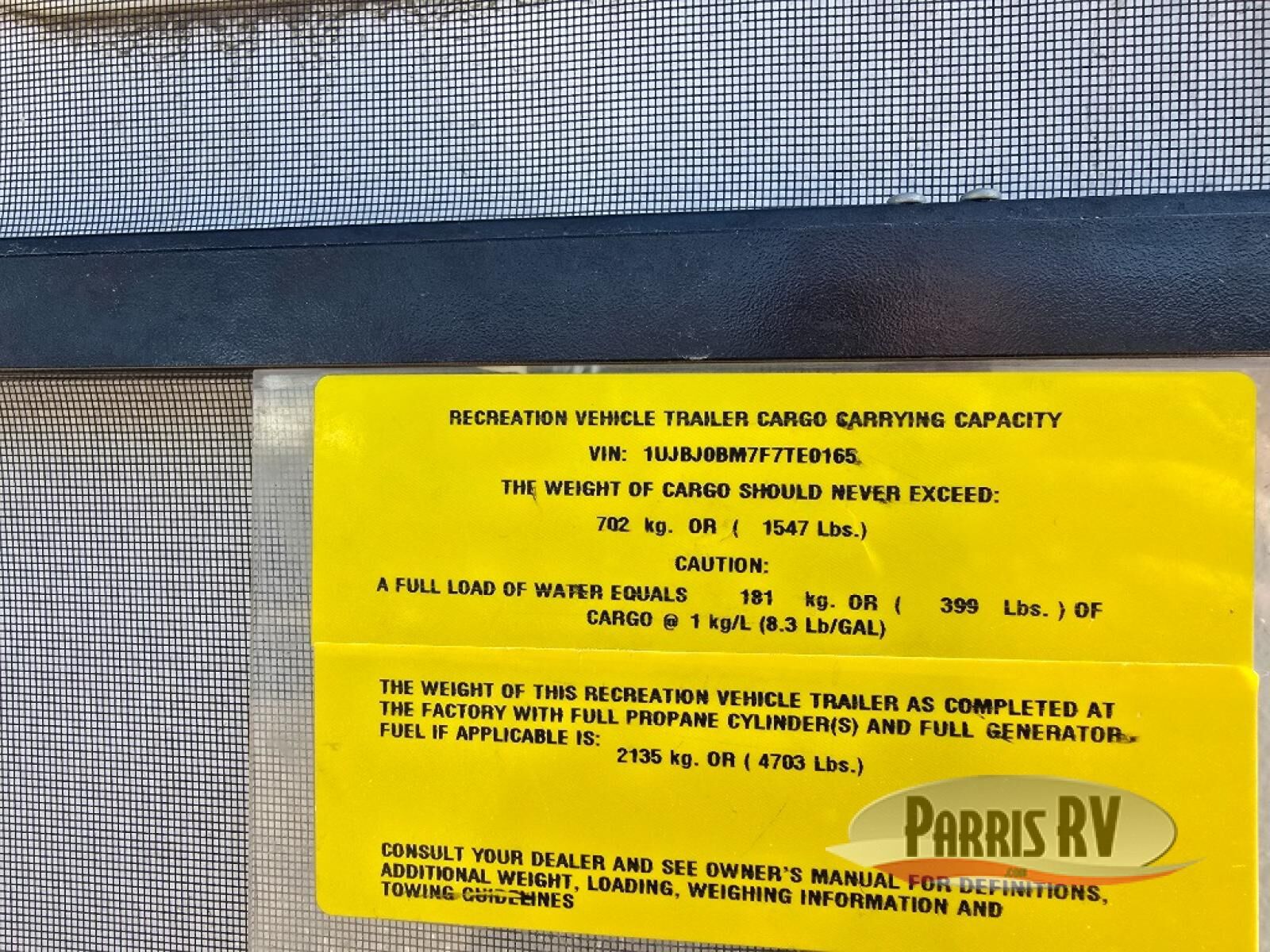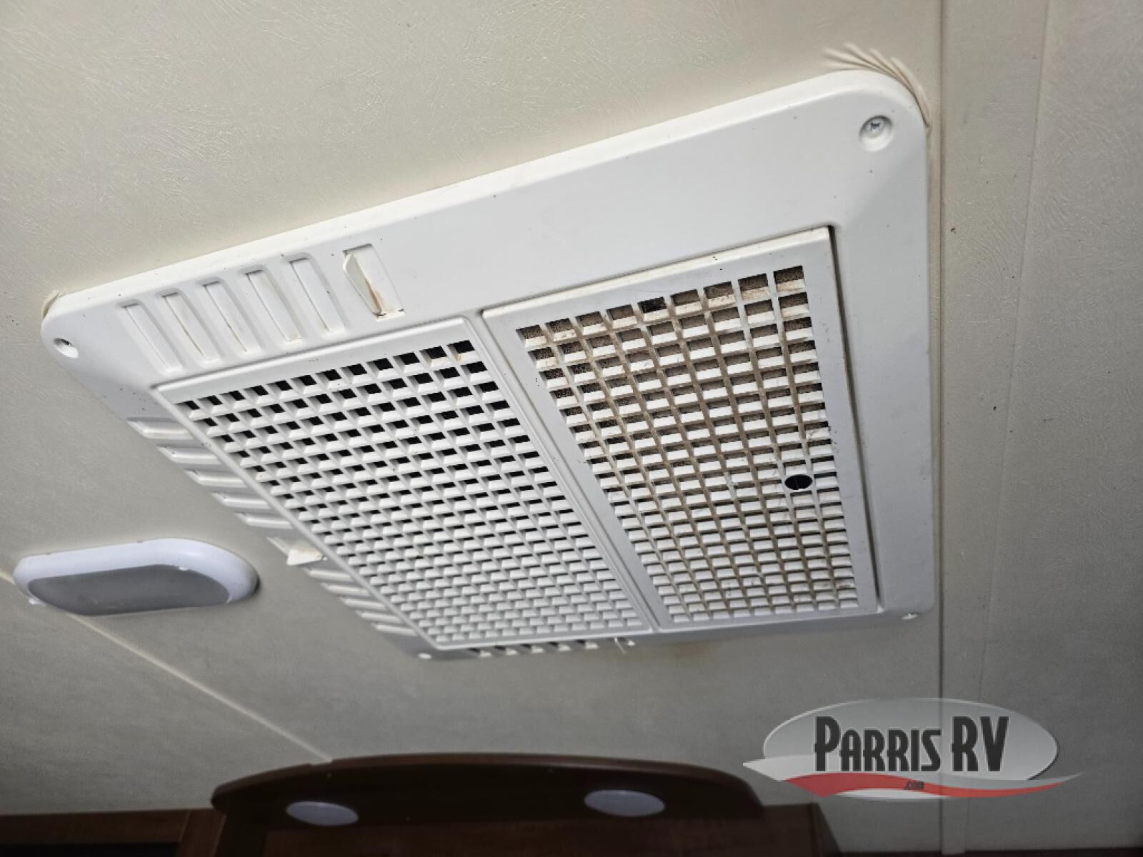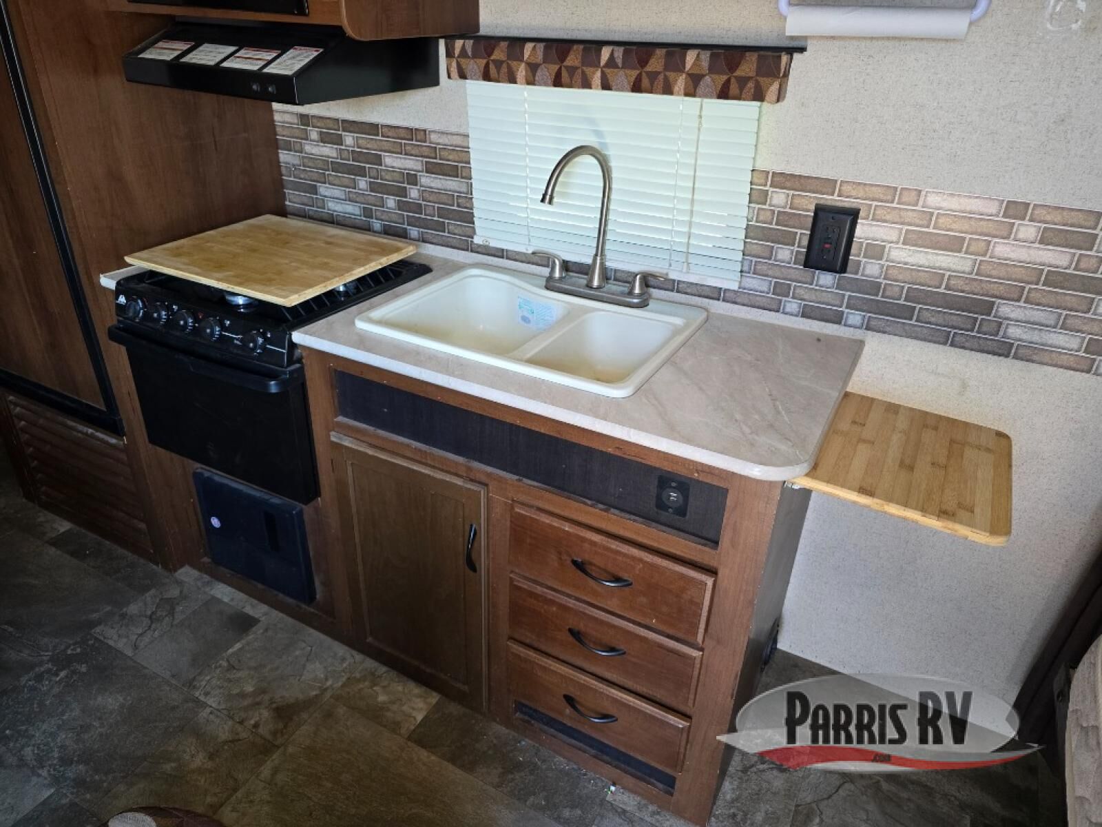 As you enter the travel trailer, to the left there is a u-dinette. Next to the dinette you will find a double bunk bed. The opposite side of the trailer has a double kitchen sink, three burner range, microwave, and refrigerator.