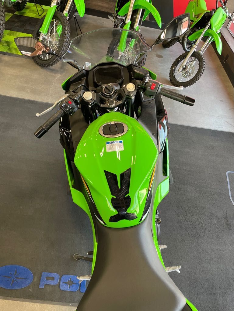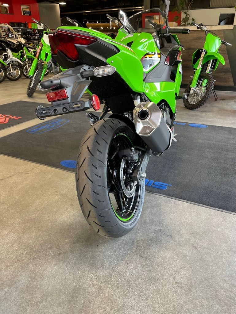 Engine Type: Parallel Twin Displacement: 27.5 cu. in. (451 cc) Bore and Stroke: Bore: 2.76 in. (70 mm); Stroke: 2.31 in. (58.6 mm) Cooling: Liquid Compression Ratio: 11.3:1 Fuel System: Gas Transmission: Manual Front Suspension: Telescopic Fork Rear Suspension: Twin Sided Swing Arm Front Brakes: Hydraulic Disc Rear Brakes: Hydraulic Disc Front Tire: Dunlop® Sportmax GPR-300: 110/70R17 M/C 54H Rear Tire: Dunlop® Sportmax GPR-300: 150/60R17 M/C 66H Wheelbase: 54.1 in. (1374 mm) Seat Height: 30.9 in. (784.9 mm) Rake: 24.7 Trail: 3.6 in. (91.4 mm) Fuel Capacity: 3.7 gal. (14 L) Dry Weight: 348.4 lb. (158 kg.) Speedometer: Standard Tachometer: Standard Odometer: Standard