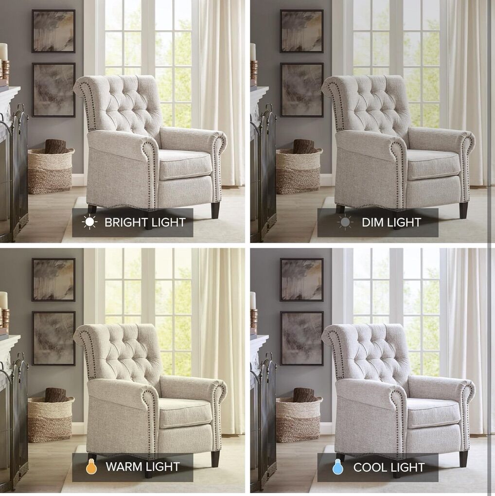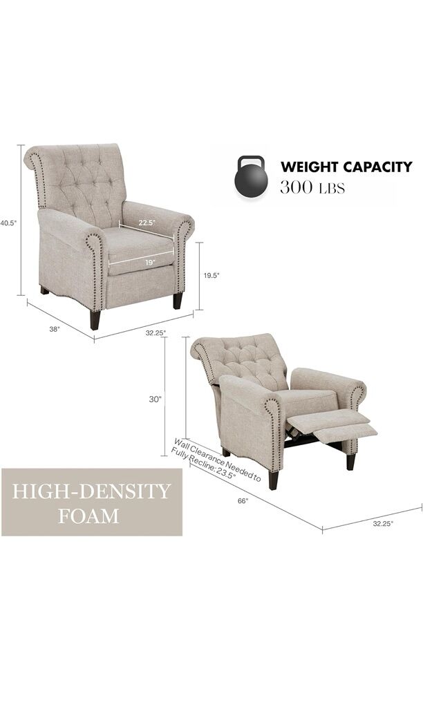Upgrade your space with this brand-new Madison Park Aidan Recliner Chair! This stylish and comfortable push-back recliner features elegant button tufting, bronze nailhead trim, and a soft cream polyester upholstery that blends beautifully with any decor.