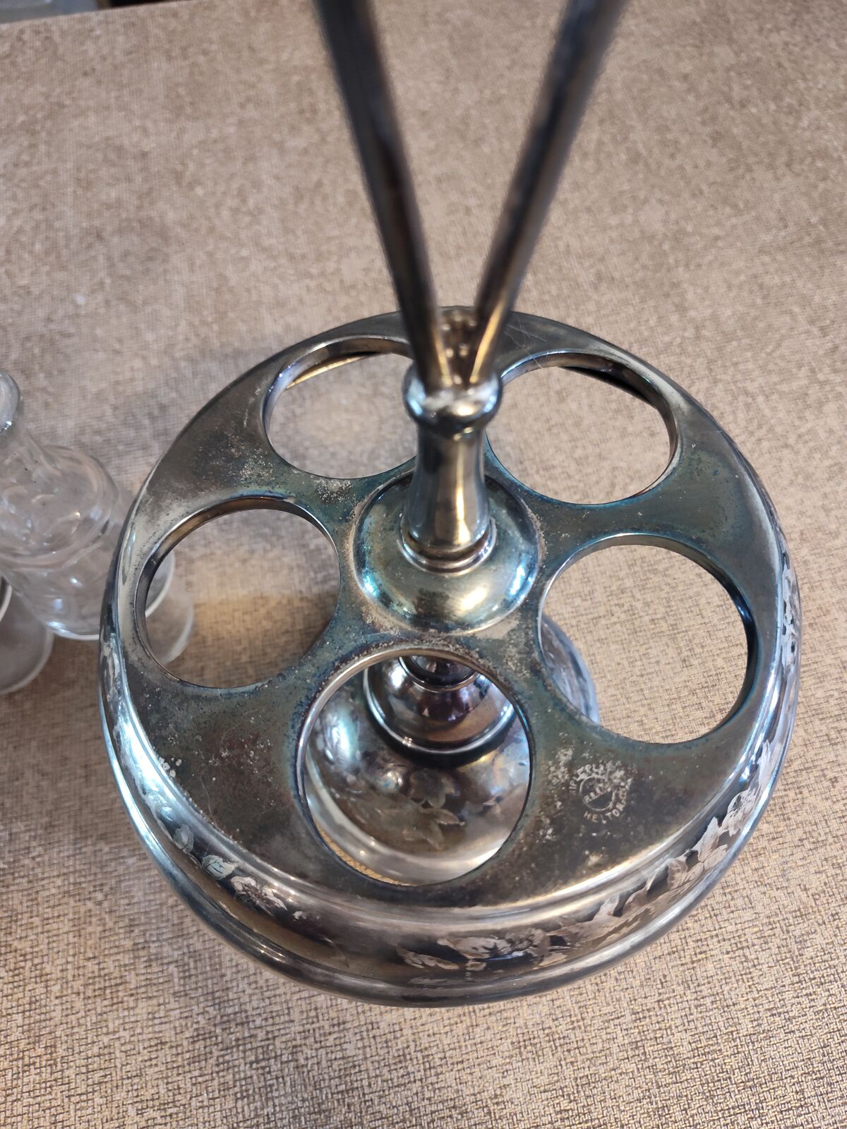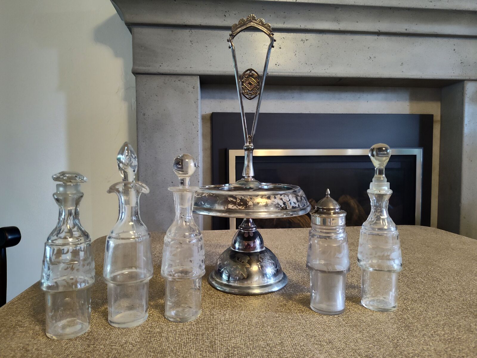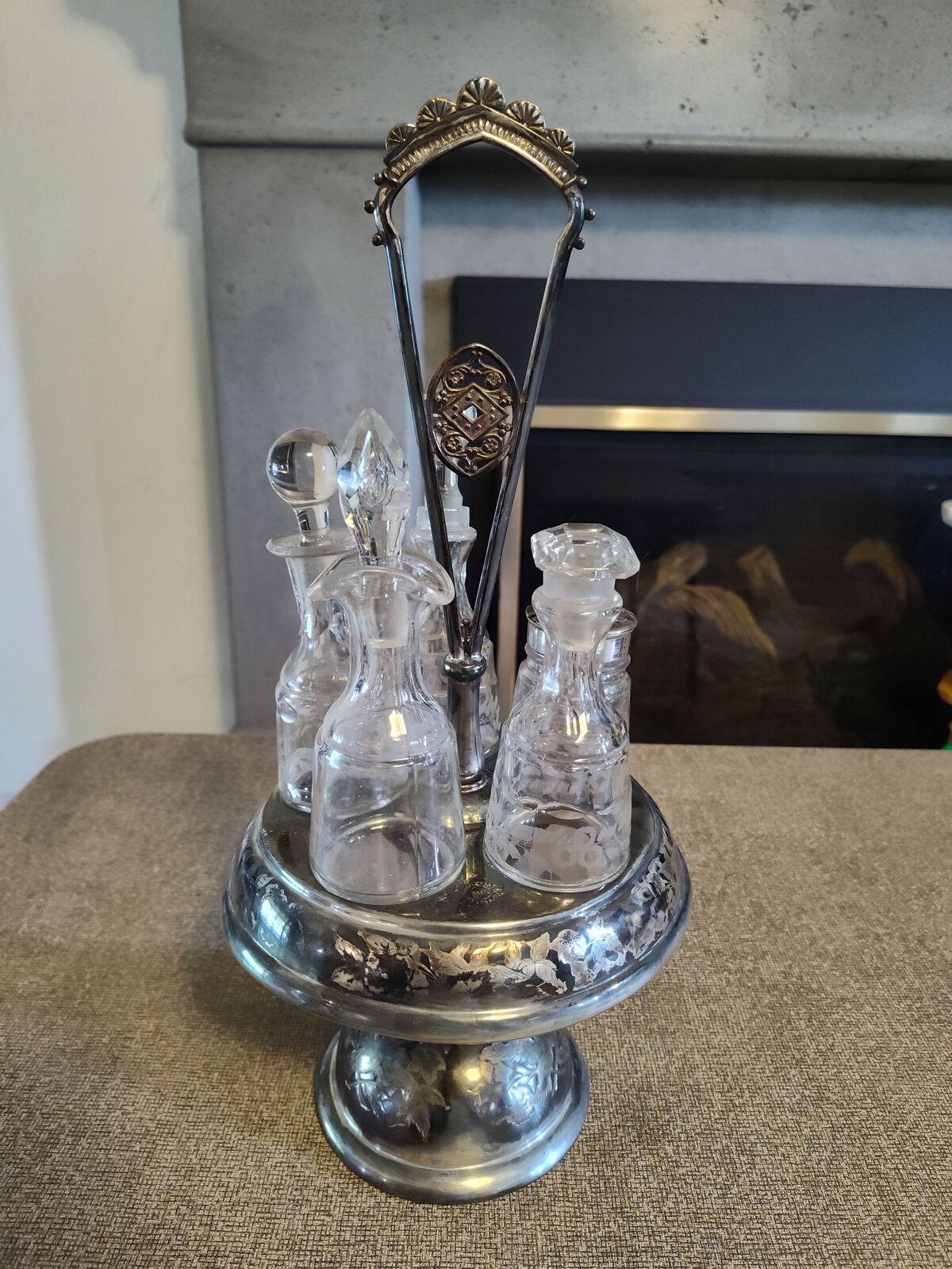 Victorian style design with silverplate detailing. The set includes various glass containers for condiments, each delicately etched for added elegance. Perfect for serving a variety of sauces or seasonings, this antique silverplate piece adds a touch of timeless charm to any dining table or kitchen decor.