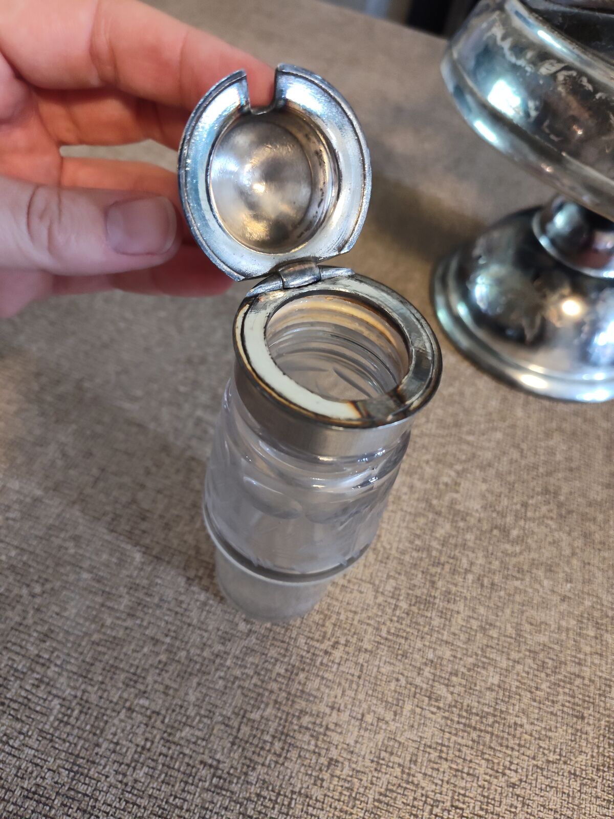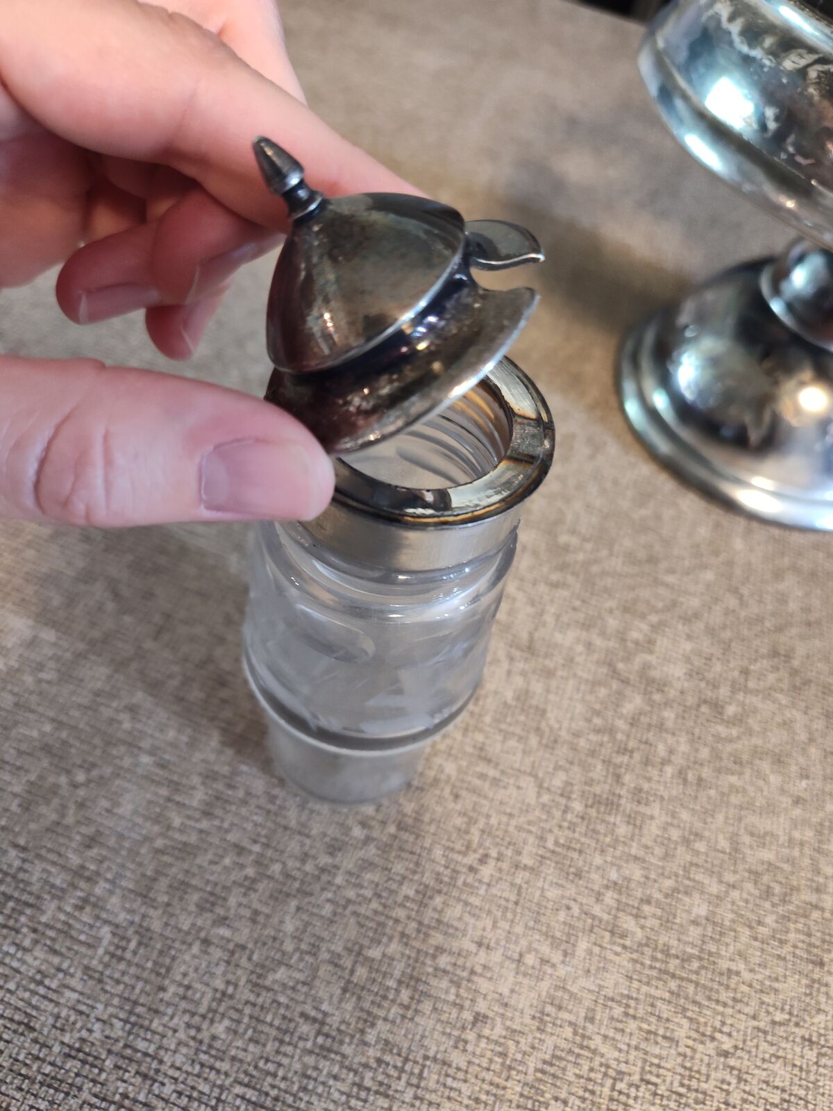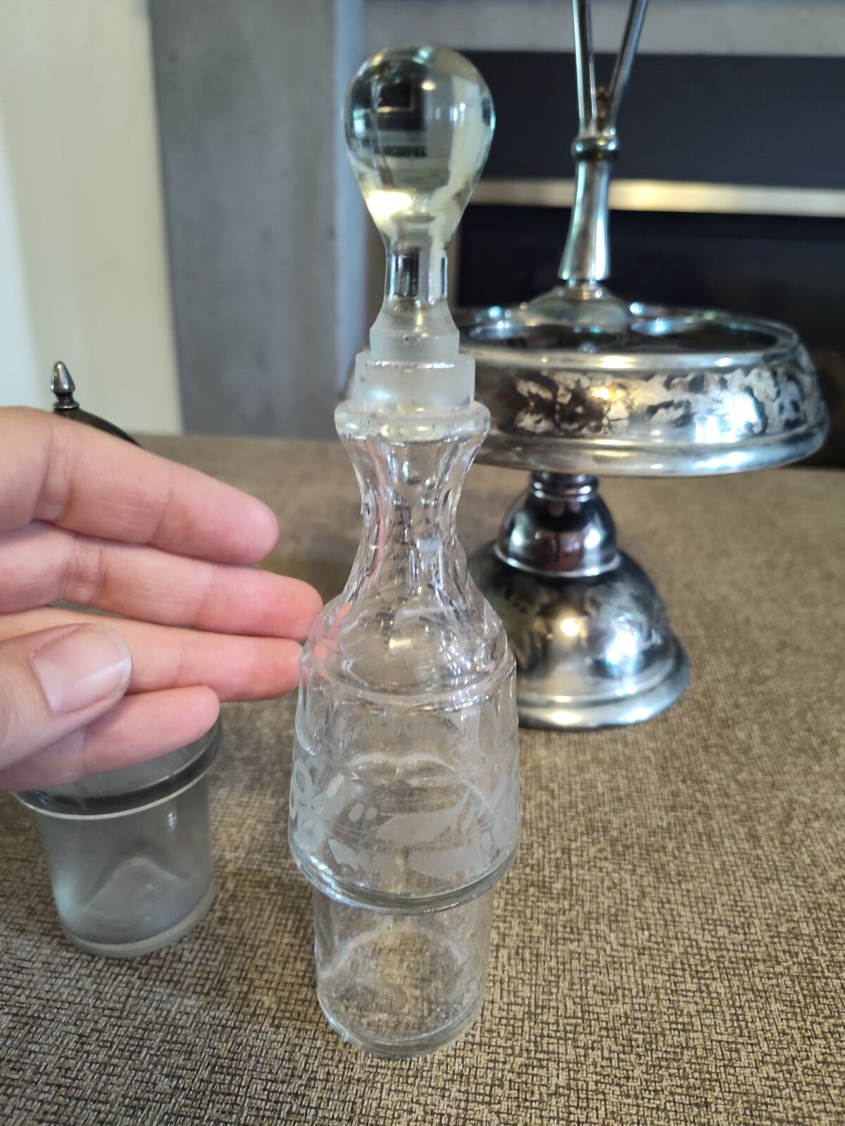 Victorian style design with silverplate detailing. The set includes various glass containers for condiments, each delicately etched for added elegance. Perfect for serving a variety of sauces or seasonings, this antique silverplate piece adds a touch of timeless charm to any dining table or kitchen decor.