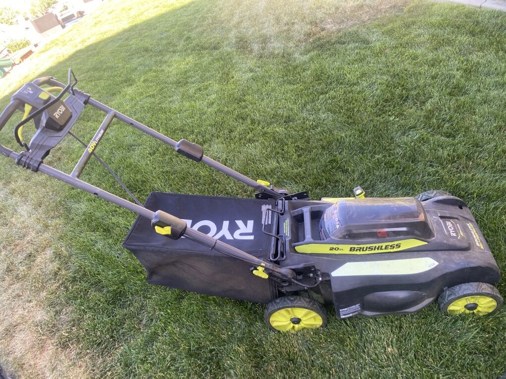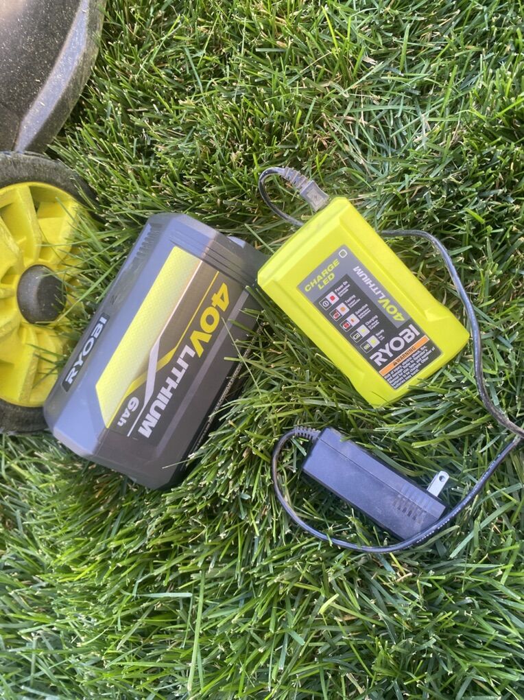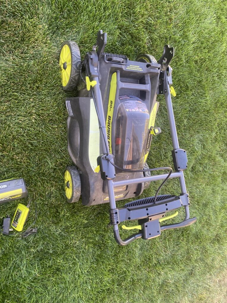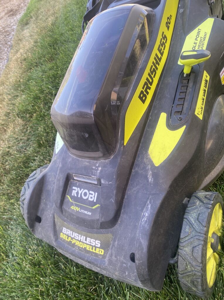VenmoUsed, but still very usable Ryobi 40v self propelled brushless 20” lawn mower. Has easy height adjustment lever, folds down very compact. Comes with bag for clippings, or a plug to mulch. Lightweight and quiet compared to gas mowers. The good: comes with 6ah battery that holds charge great. This battery alone sells for about $140. The bad: I had to replace some loose screws on the mower, but the new ones seem to be holding well. The foam handle grip is starting to tear a bit on the left side. The charger works fine, but takes a long time to charge.