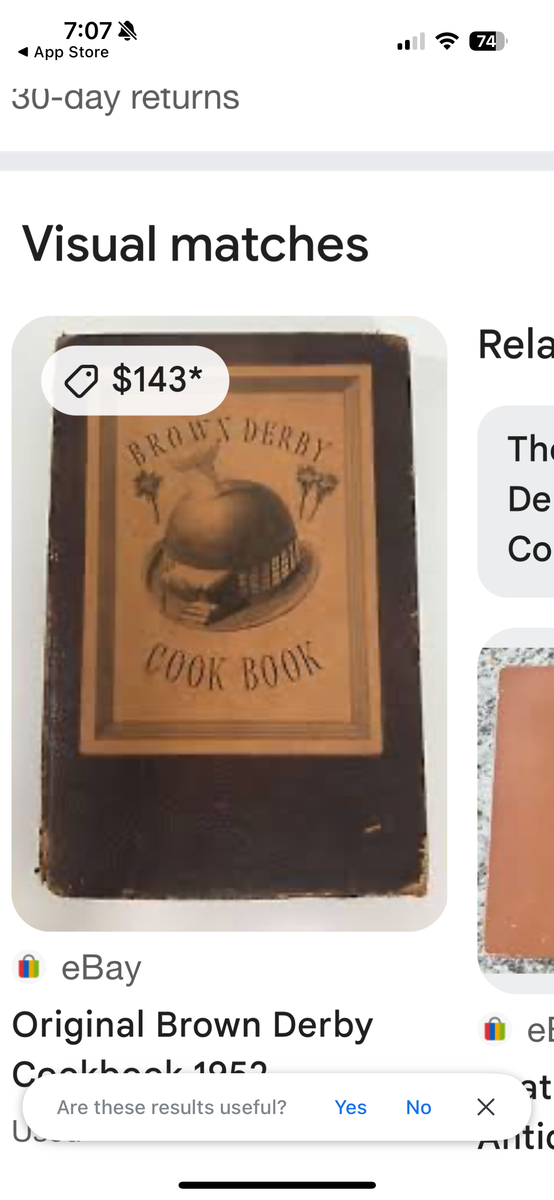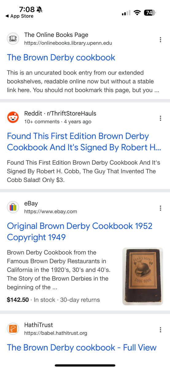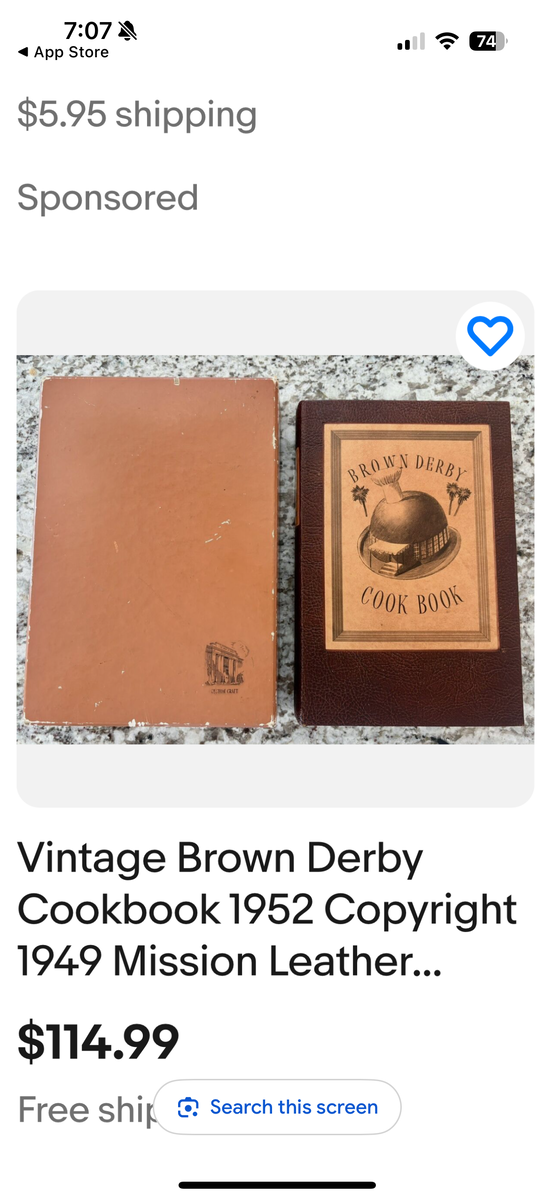 VenmoFamous Vintage Brown Derby Cookbook. Antique cook book The Brown Derby Cookbook, first published in 1949, provides a glimpse into the history and cuisine of the iconic Brown Derby restaurants in Los Angeles, which were famous Hollywood hotspots from the 1920s to the 1980s. The cookbook, compiled by Robert Cobb, a founder of the Brown Derby, and edited by Marjorie Child Husted, features over 650 recipes from the restaurant's various locations. It includes not only recipes for signature dishes like the Cobb salad but also anecdotes, historical details, and insights into the restaurant's role in Hollywood's glamorous past.