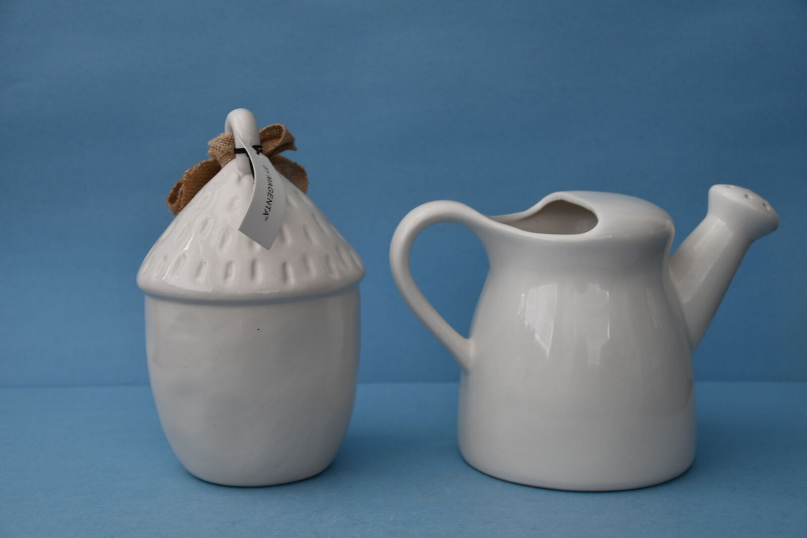 This Set of 2 WHITE CERAMIC DECOR ITEMS are from a smoke free home. The NWT "AUTUMN" BIRDHOUSE is about 9" in height. The "NOURISH" WATERING CAN is about 6.5" in height. THERE ARE NO CHIPS! Questions??? Please ask. We are located in Plain City. Cash only please.