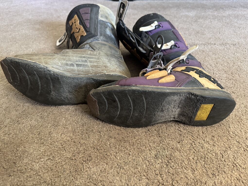 Worn, but in good condition. Not sure the size, I’m guessing they’re a men’s 9 or 10.