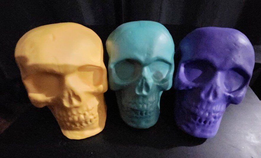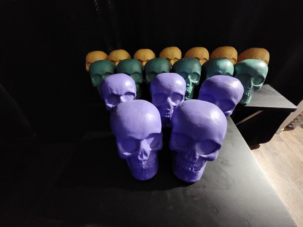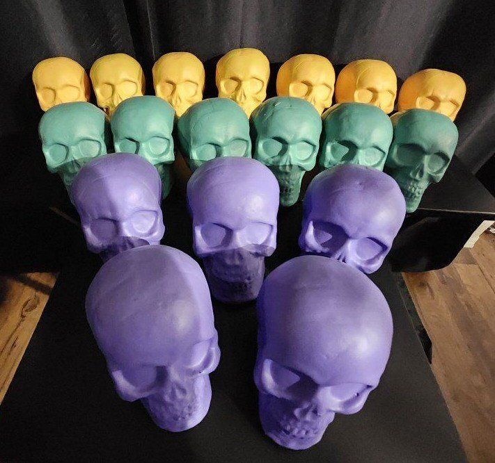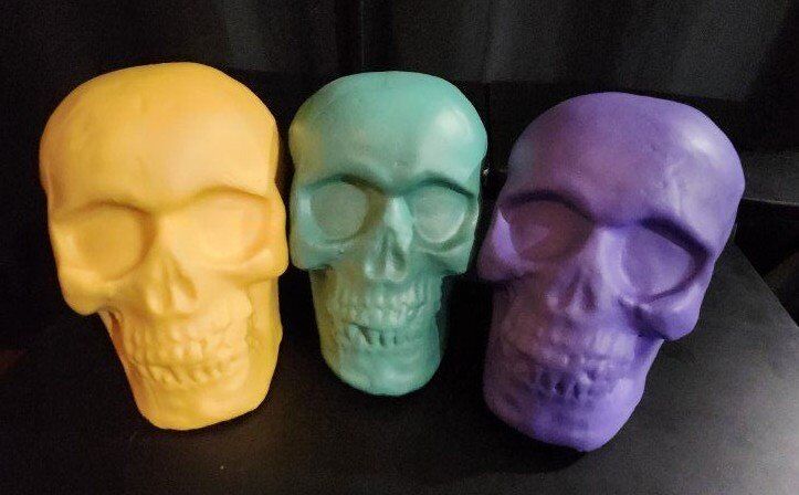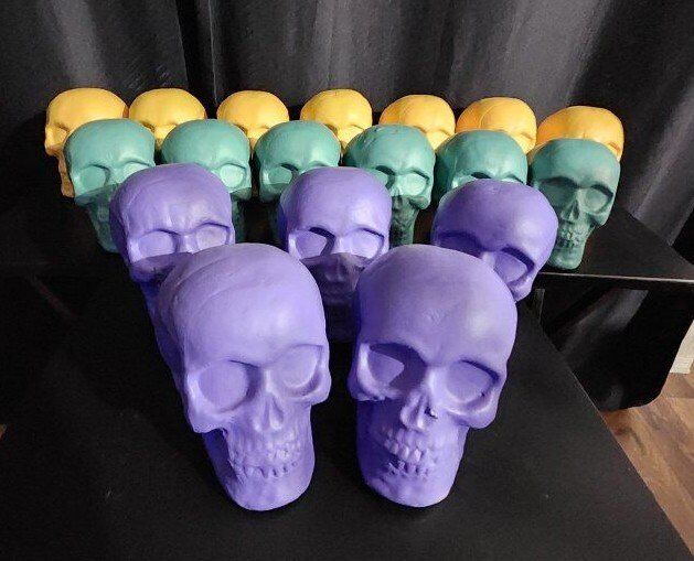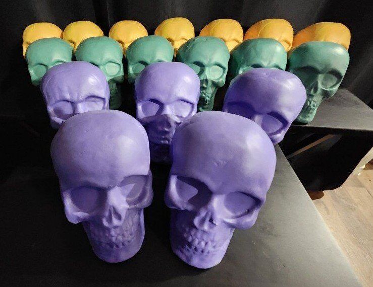 18 Pllastic Skulls with Foam Interior. There are 7 Yellow Skulls, 6 Green Skulls, and 5 Purple Skulls. Measures 5-3/4" Height x 6-1/2" Depth x 4-3/4" Width. $75 for all 18 Skulls, or $5 each.