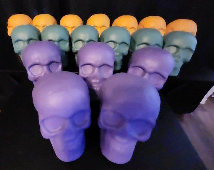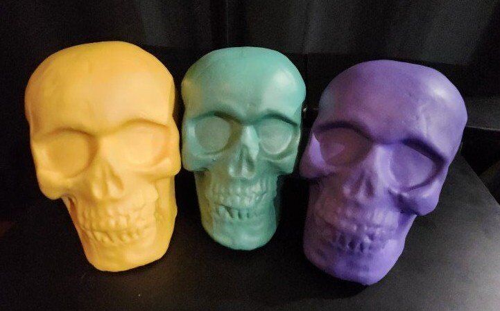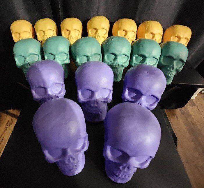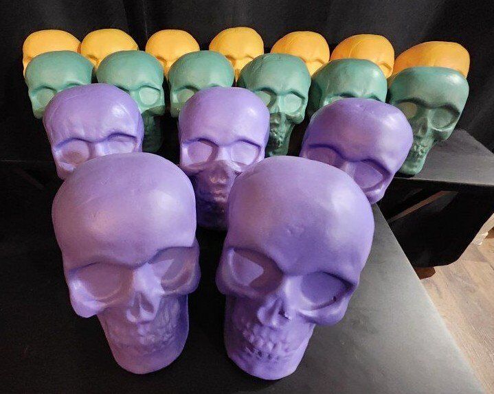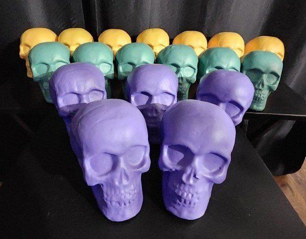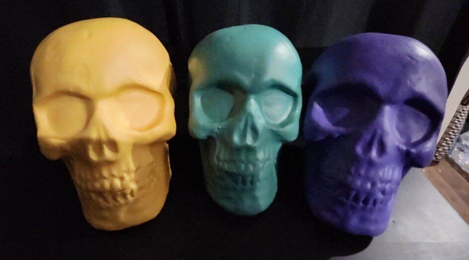 18 plastic skulls with foam interior. There are 7 Yellow Skulls, 6 Green Skulls, and 5 Purple Skulls. Measures 5-3/4" Height x 6-1/2" Depth x 4-3/4" Width. $75 for all 18 Skulls, or $5 each.