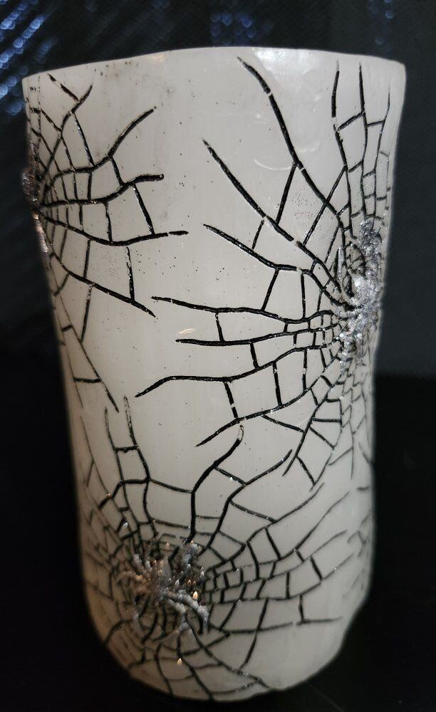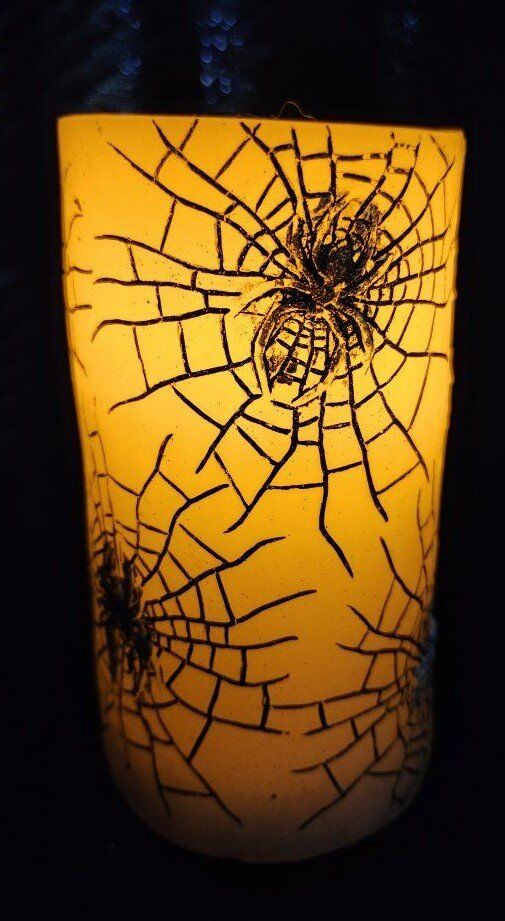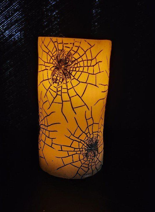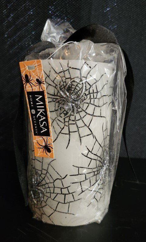 Mikasa Hallween LED Candle. White Candle with Black Spiders and Silver Spiders. Measures 5-1/2" Height x 3-1/2" Depth x 3-1/2" Width. $8 for the LED Halloween Candle.
