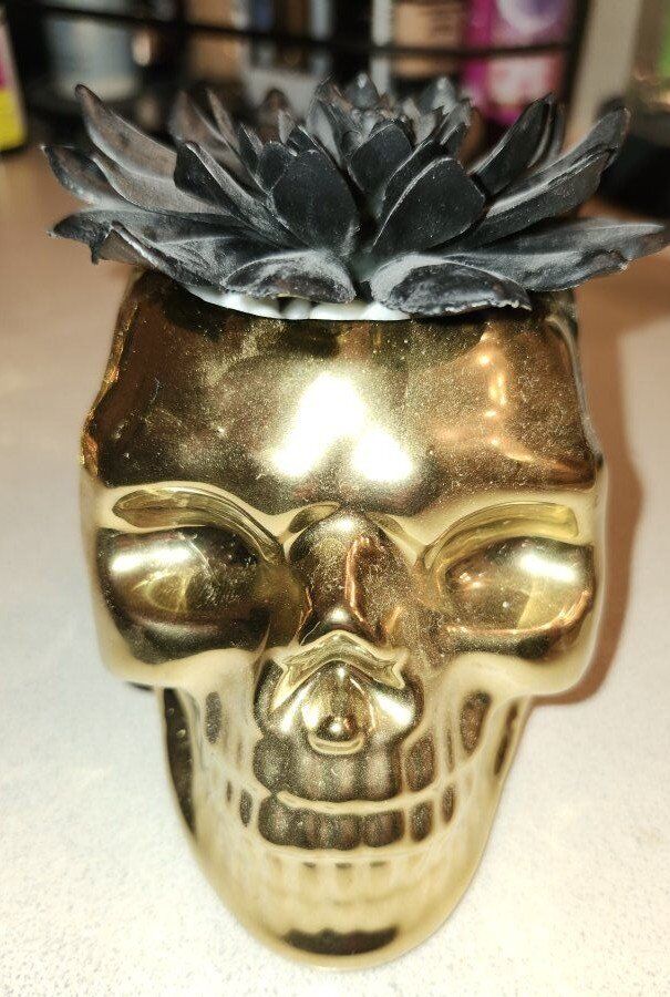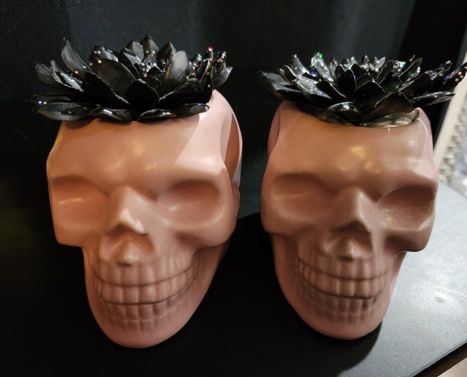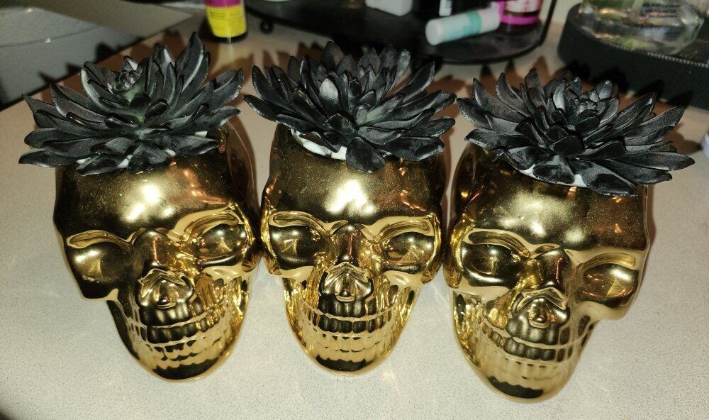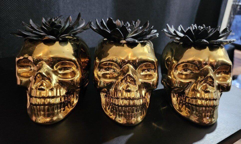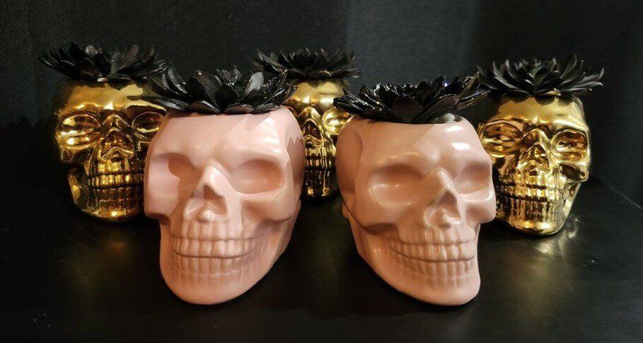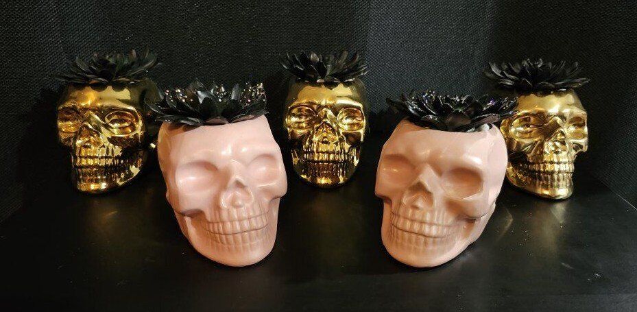 5 Metal Skull Air Plant Hallween Decor There are 3 Gold Skulls and 2 Pink Skulls. Measures 4-1/2" Height x 4-3/3" Depth x 3-1/3 Width. $30 for all 5 or $8 each.