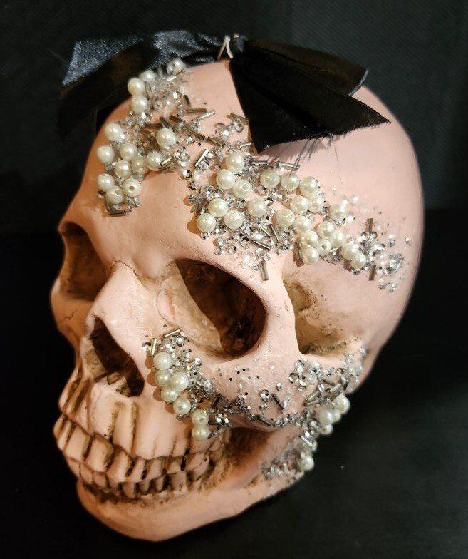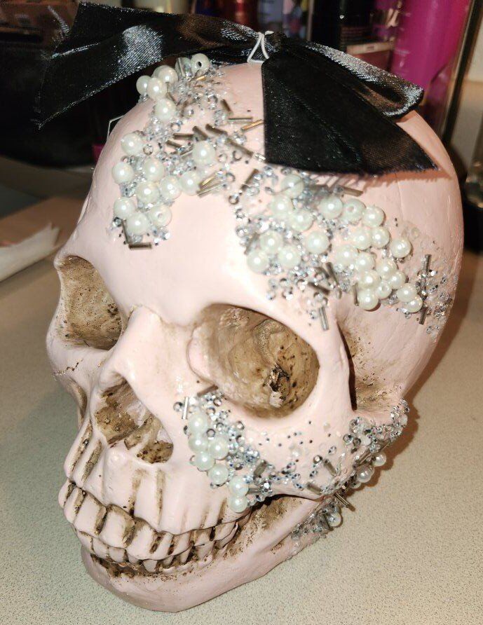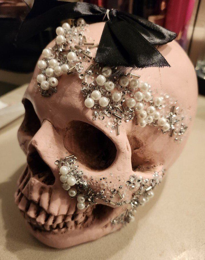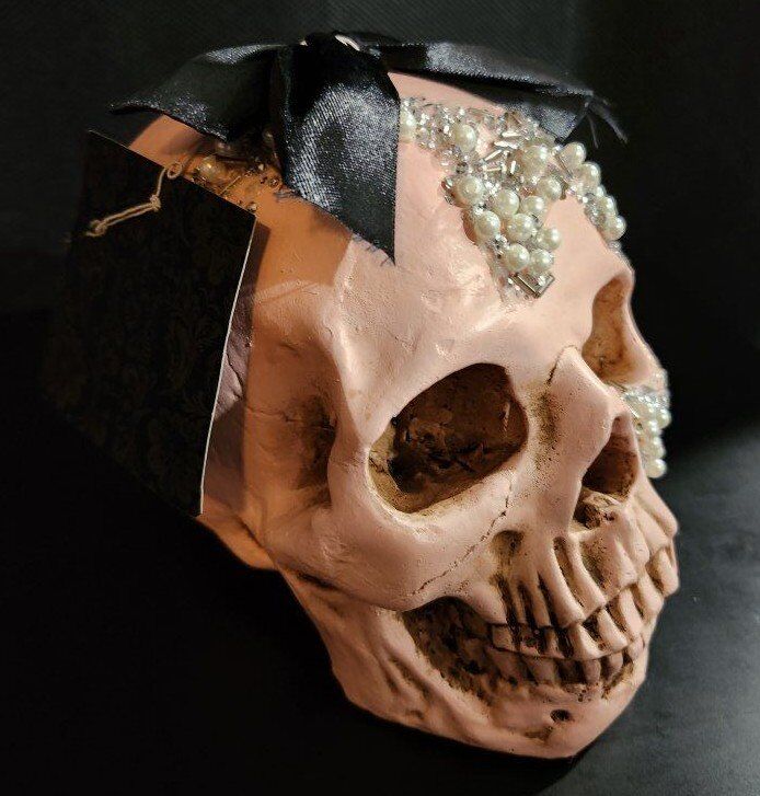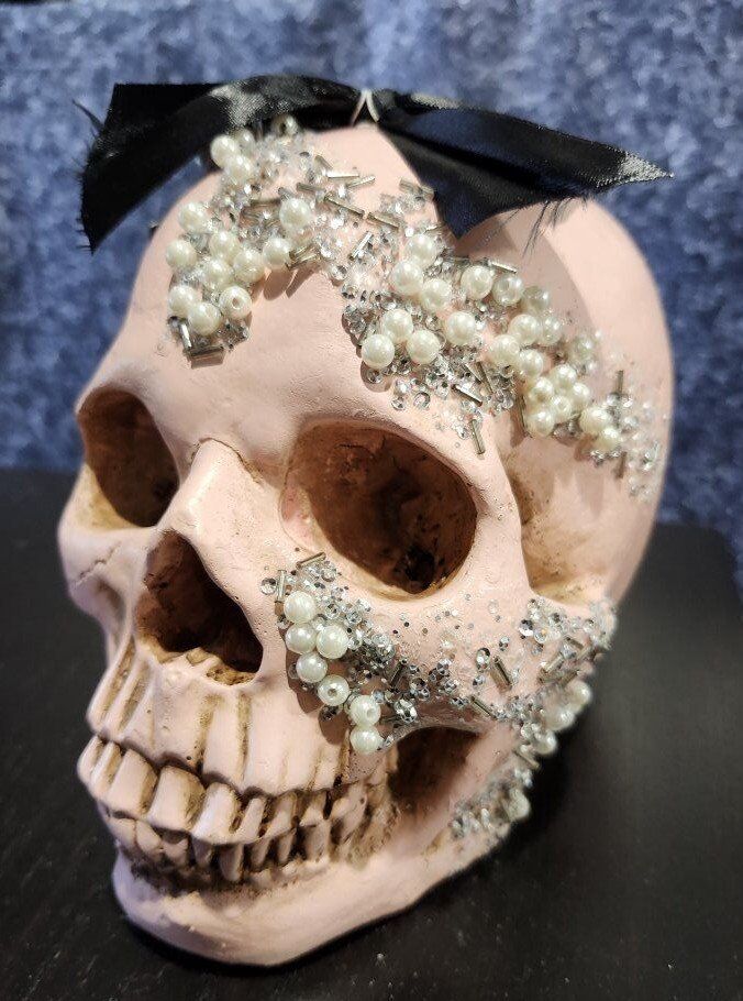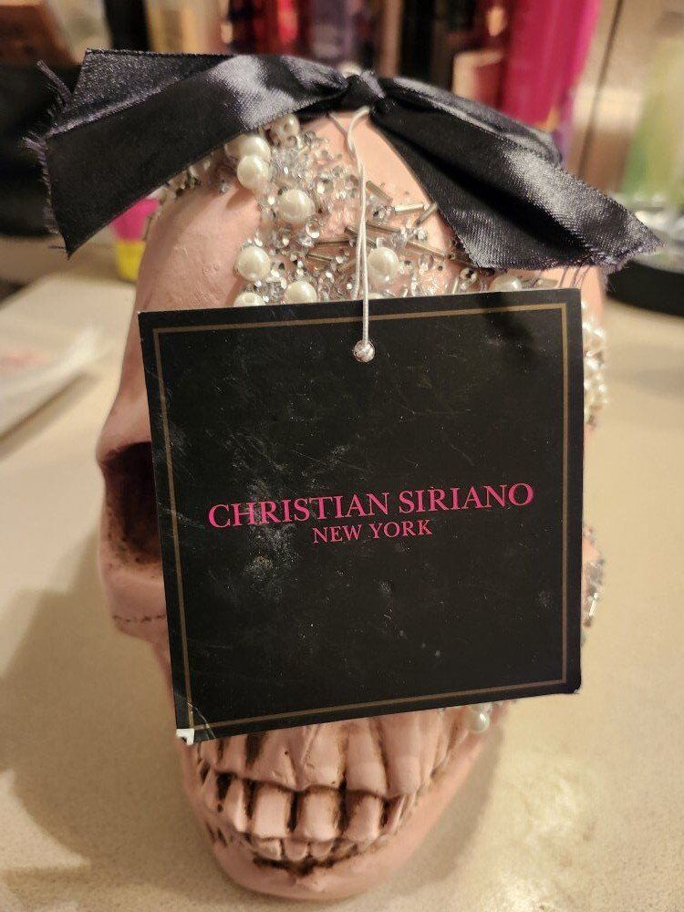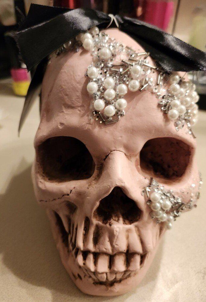 Christian Siriano Pink Halloween Skull Bedazzled with Bow. 7" Height x 8" Depth x 5-1/2" Width $25 for the Skull.