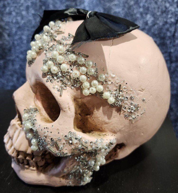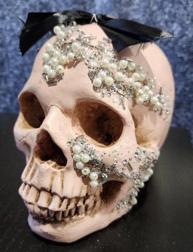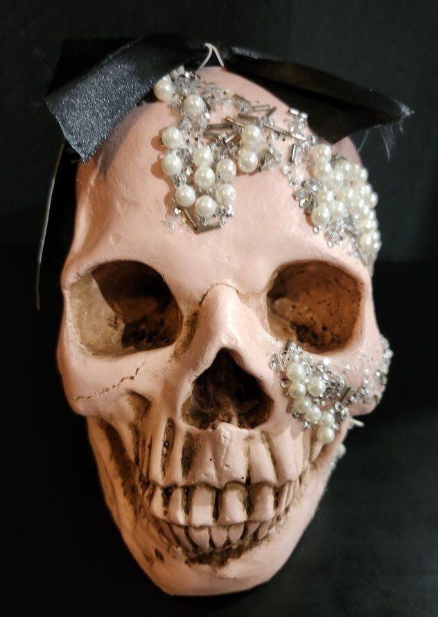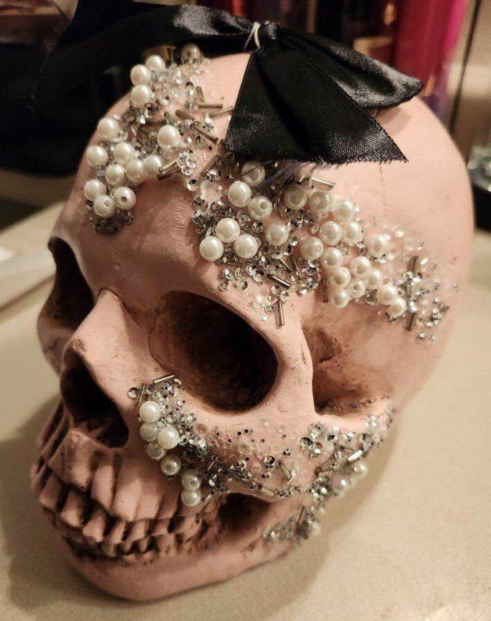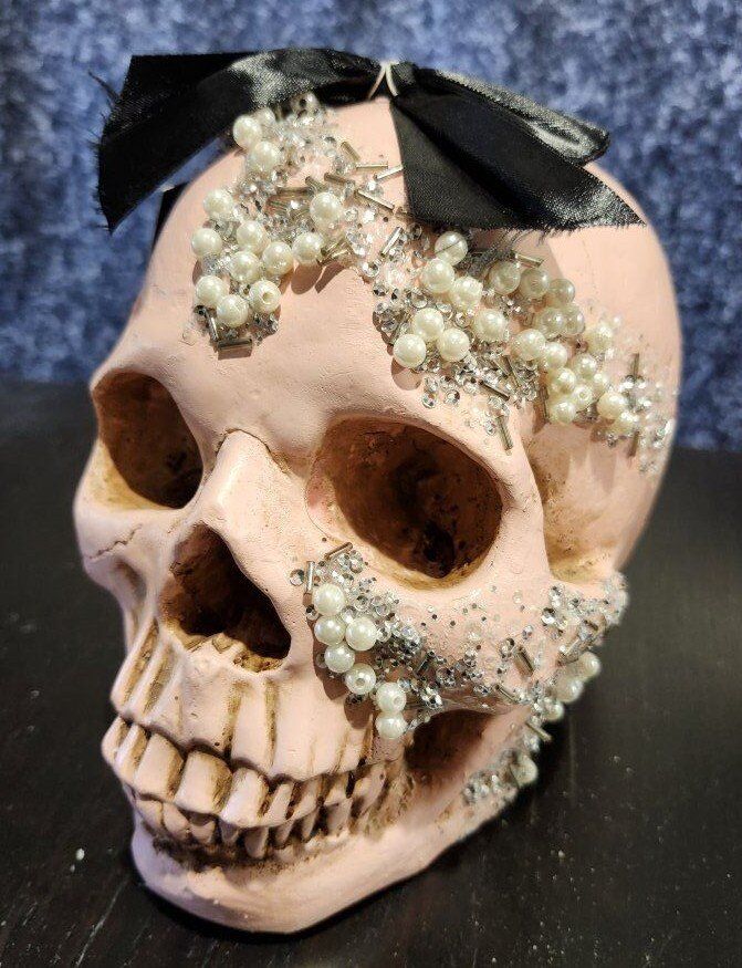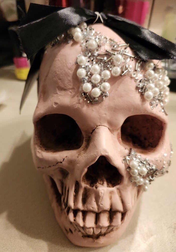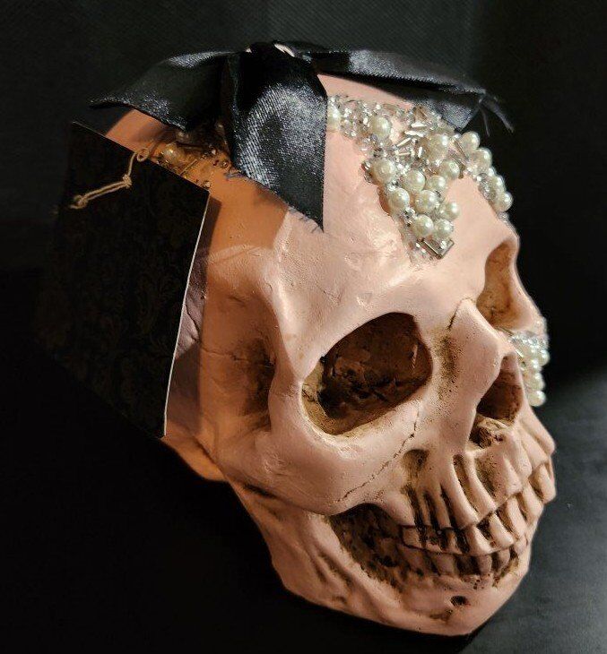 Christian Siriano Pink Halloween Skull Bedazzled with Bow. 7" Height x 8" Depth x 5-1/2" Width $25 for the Skull.