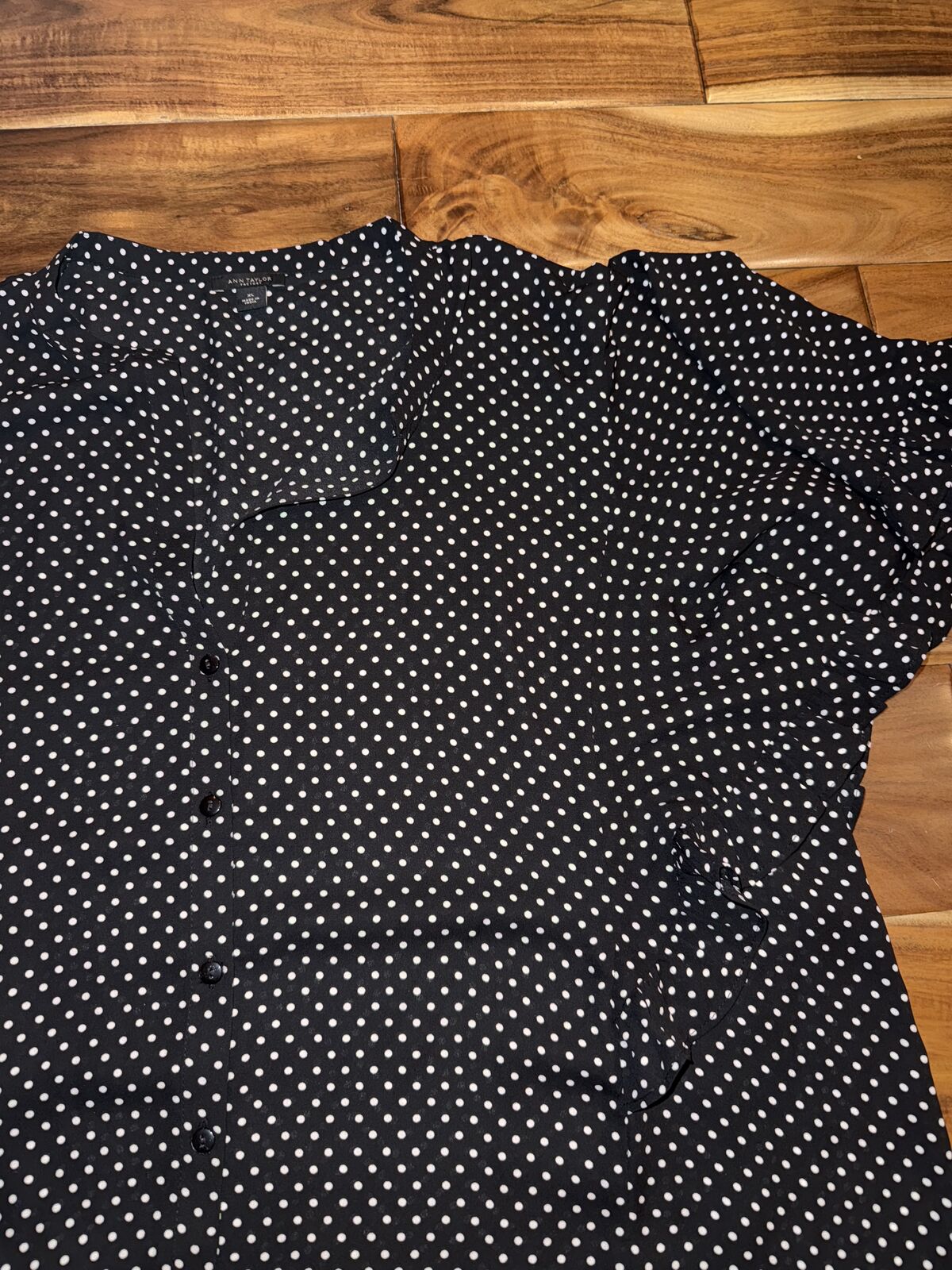 VenmoThis is a black with white polkadot shirt. It has big floaty sleeves. Tried to get a picture of the sleeves. It is a women’s size XL shirt. It is new but washed. Cash or Venmo.