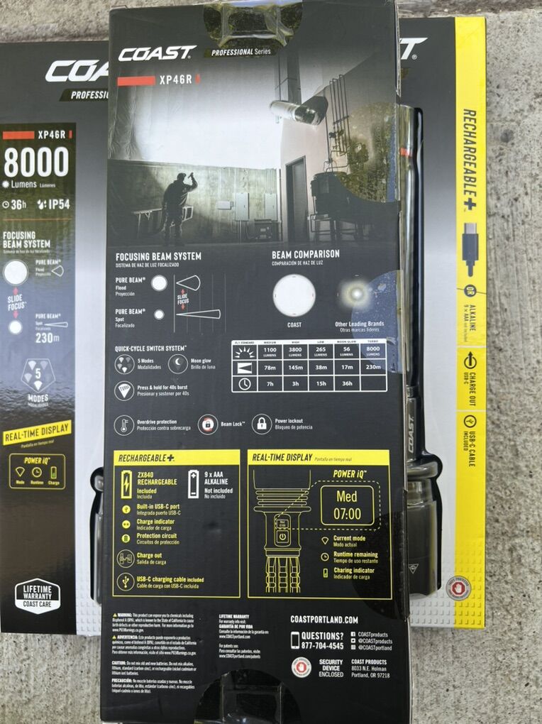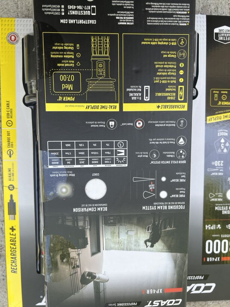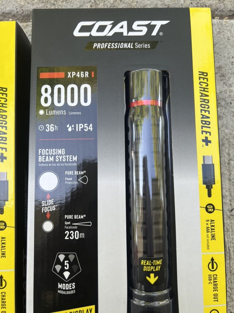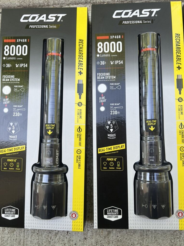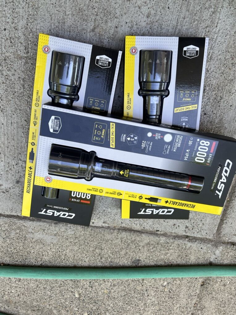 For sale flashlight rechargeable. 8000 lumes very bright at night time. Ideal for camping hunting..security guard etc etc.