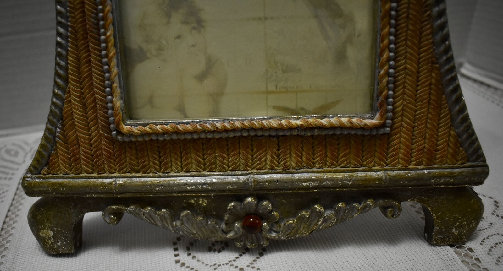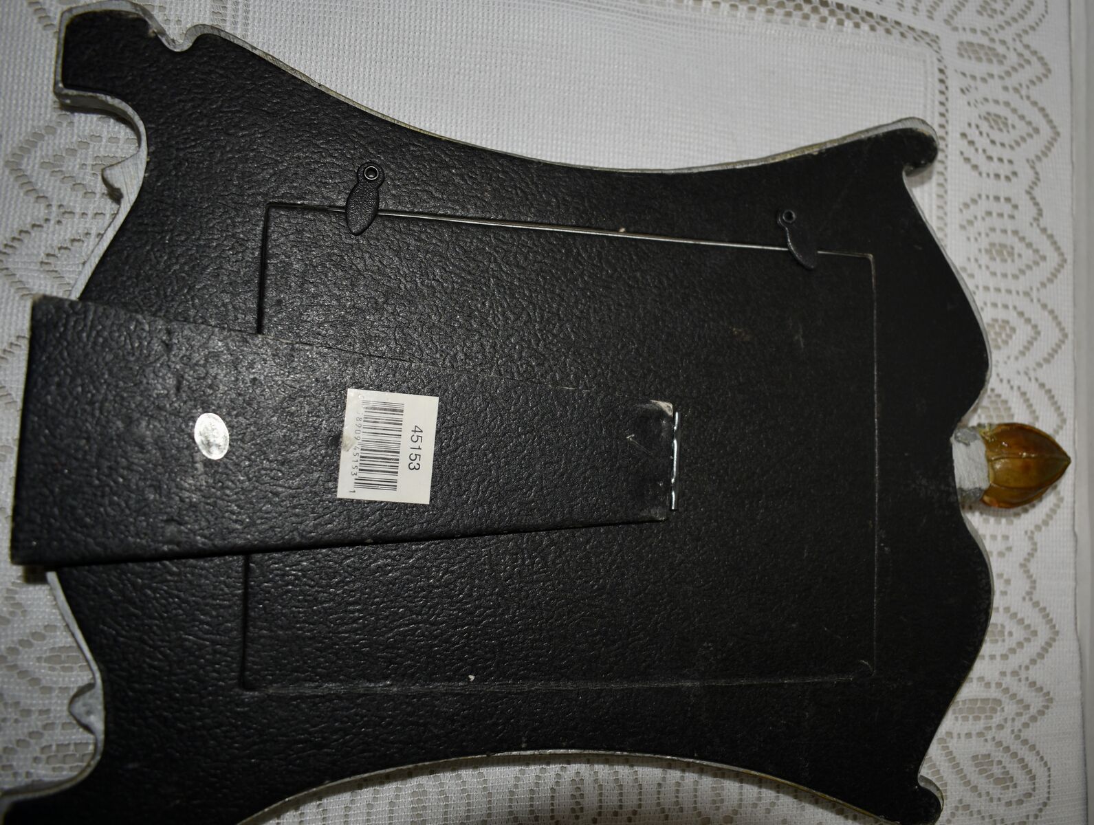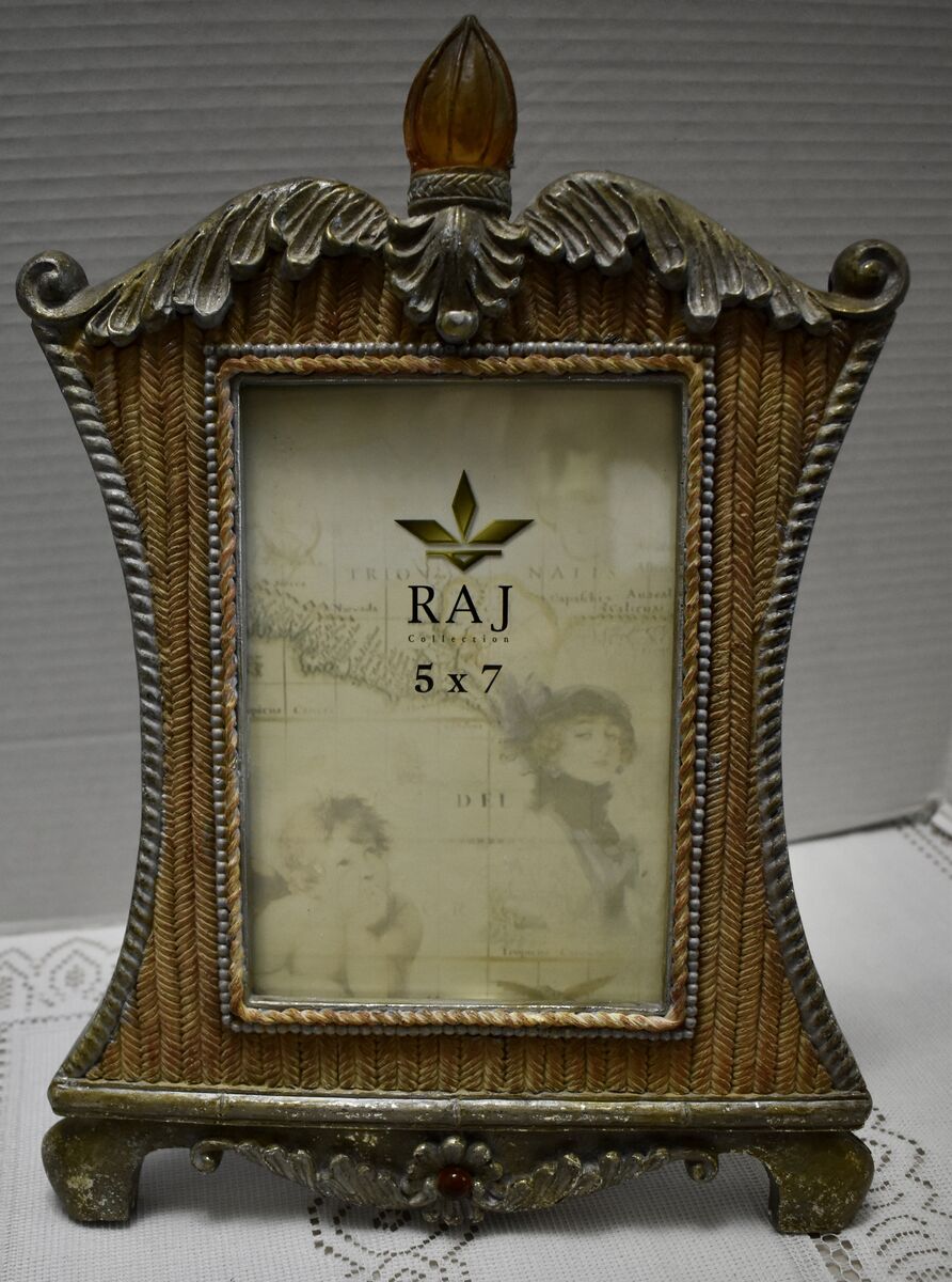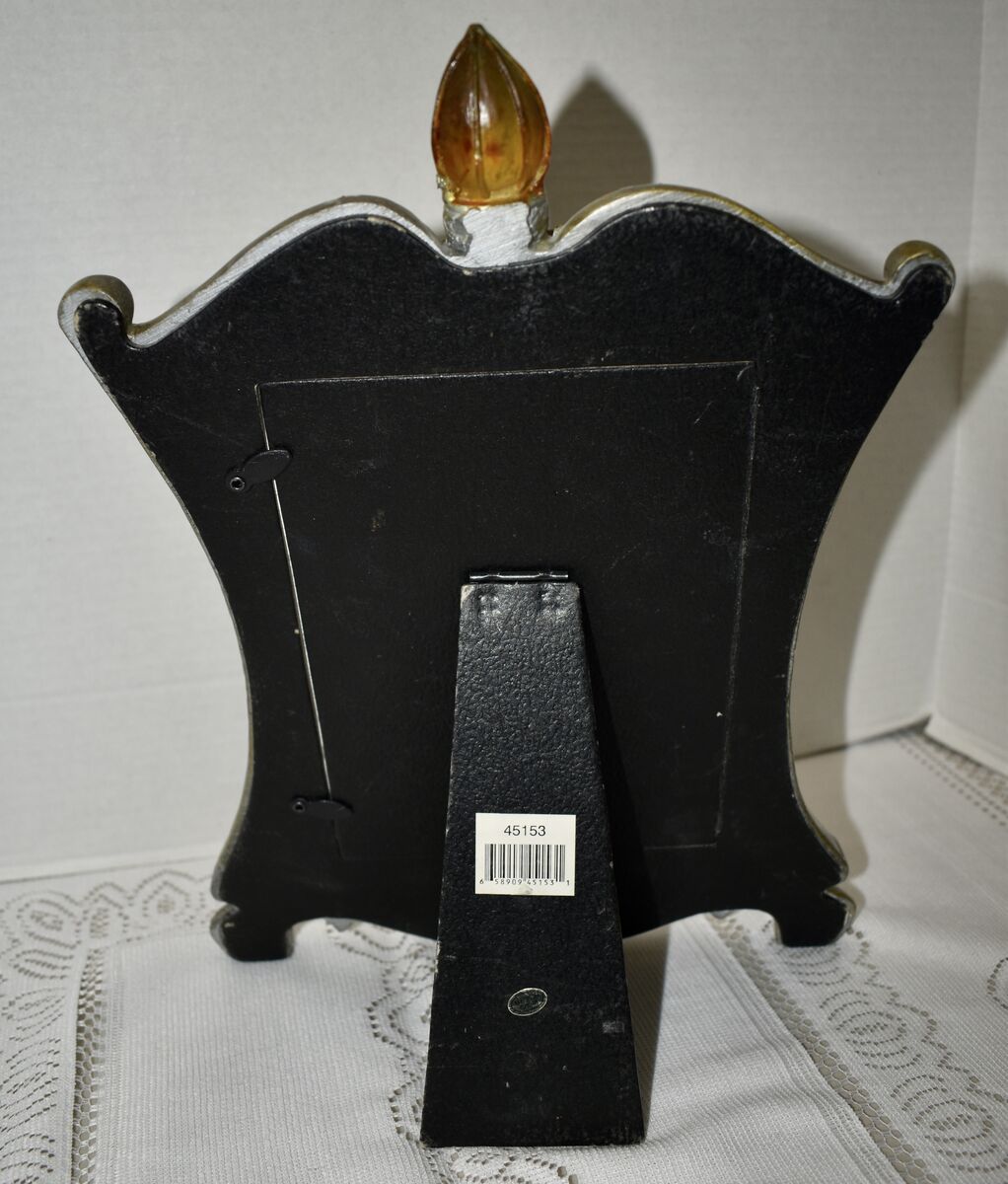 IT MEASURES…It Measures approx. 13 1/4 Inches tall at the tallest part and it is 9 1/2 inches wide at the widest part across. It holds a 5 X 7 inch photo.