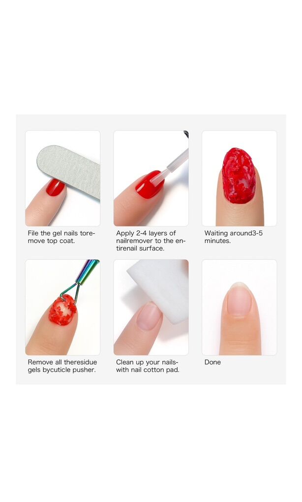 ZelleComplete Gel Polish Removal KitThis professional kit includes a 15ml (0.5 Fl.oz) gel polish remover, nail cotton pads, dual-grit nail file (100/180), double-sided buffer (600/3000), stainless steel cuticle pusher, and scraper. Everything you need for salon-quality results at home—no salon visits required! Quick & Hassle-Free Gel Polish RemovalSkip soaking, foil wraps, and machine scraping. Apply the gel polish remover, wait 2-5 minutes, and gently scrape off gel polish. The included tools ensure smooth removal without damaging nails,perfect for quick at-home sessions. Acetone-Free & Nail-Safe FormulaThis gel nail polish remover uses specialized solvents to dissolve polish efficiently without acetone. protecting natural nails from damage. Low odor ensures comfortable and effective removal. Pro-Level Results in 3 Steps1. File the topcoat. 2. Apply remover. 3. Scrape gently. The polishing buffer smooths edges, and the stainless tools ensure durability. Perfect for beginners and pros alike.