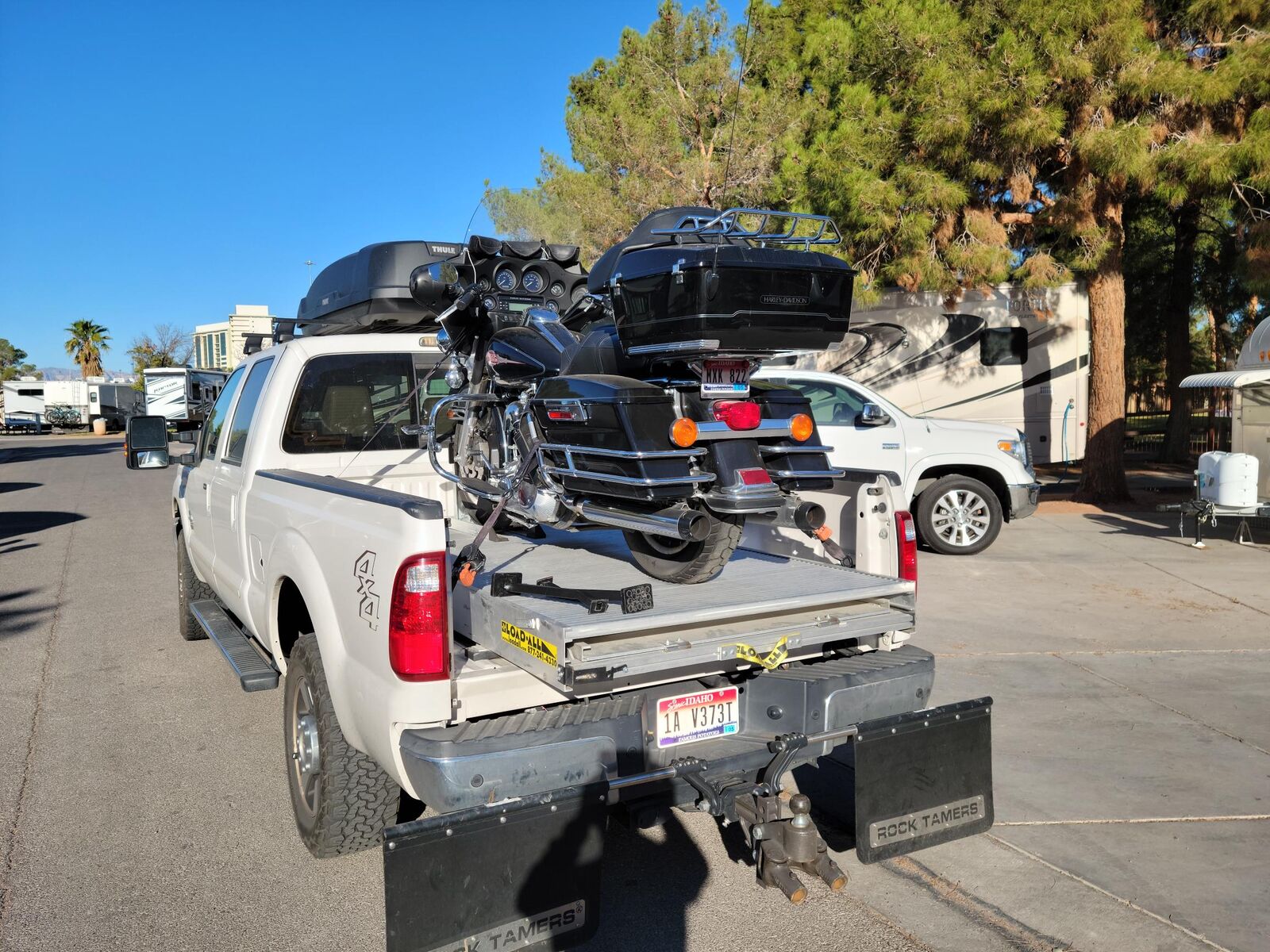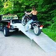 Easily load full dress Harley, snowmobils, golf carts... anything with this ramp. Fits 6'8" bed. Does not touch tail gate. Can Pull trailers behind truck with no problem when extended. When not in use it folds up front and slides into bed so you can close the bed tail gate. Comes with custom tie downs and front wheel chock. Sells for $3895.00 on LoadAll web page. You can have it for $1000.00. Everywhere I go, people ask How did you get that bike in the back of your truck? I get standing ovations when people see me load my bike.