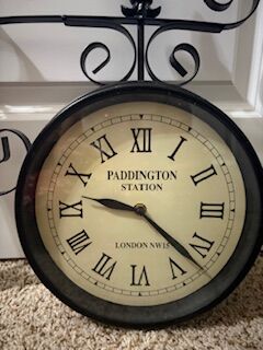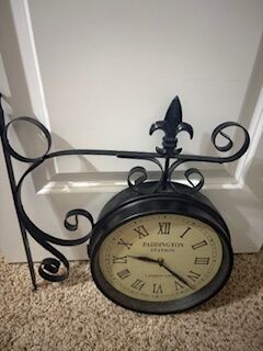 ZelleOld town English clock. Never used. It is battery operated using one AA battery. The clock needs toscrew into the wall. The circumfrance of the clock face is about 31 inches and it will sit out from the wall about 16 inches. This is made of metal to very sturdy. I bought it for $55.