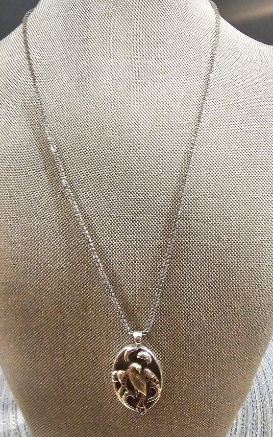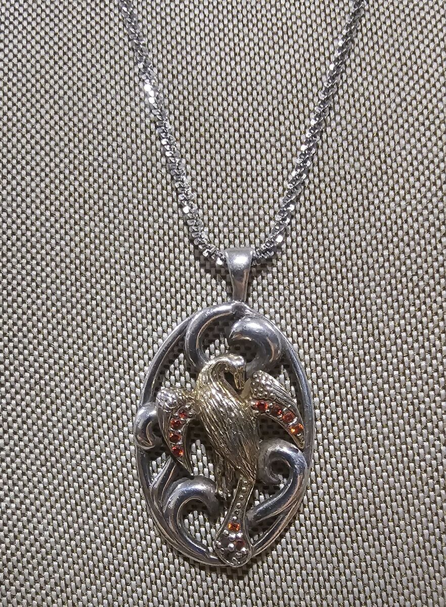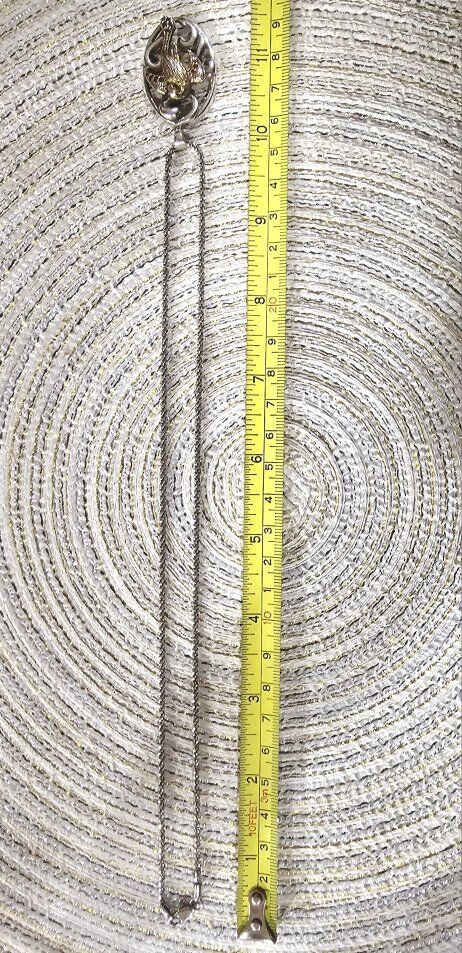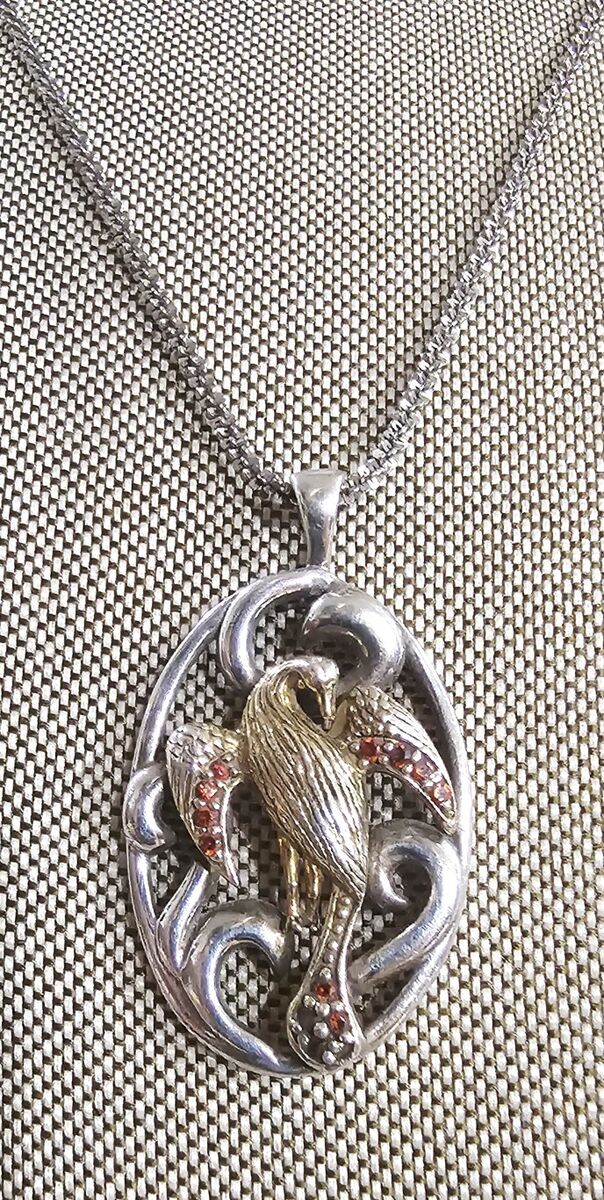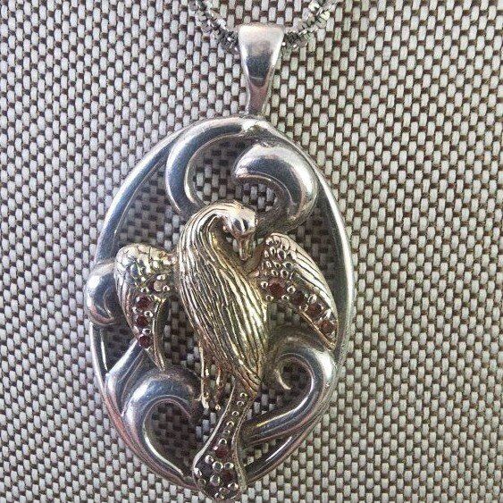 Oval shaped STERLING SILVER 2" fancy scrolled cut-outs surrounding a VERY DETAILED gold vermeil bird, with Garnet accents on the wings and elongated tail. Such an ELEGANT statement piece!!