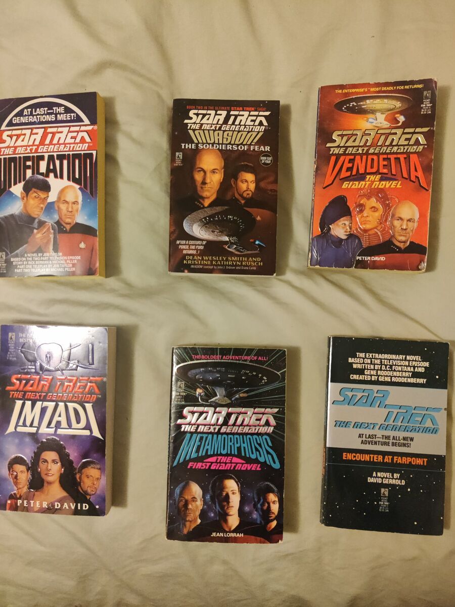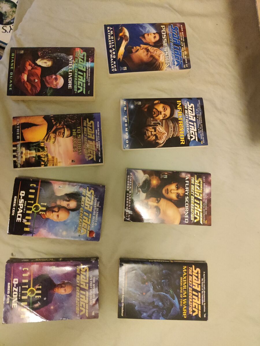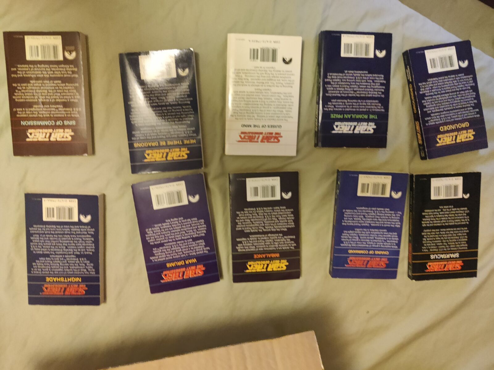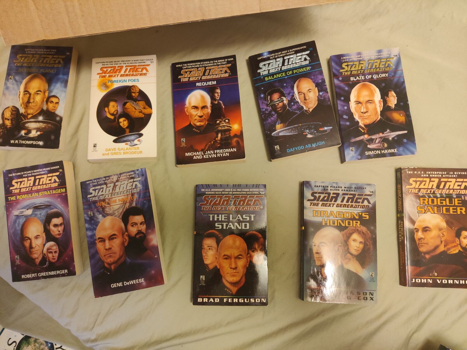 VenmoLOT OF 47 OF STAR TREK THE NEXT GENERATION PAPERBACKS. BOOKS 1-40 ARE ALL THERE IN ORDER FRON THE BEGINNING. ( I REALIZE BOOK 1 IS IN A DIFFERENT PICTURE, I MESSED UP TAKING THE PICTURES BUT IT IS THERE AND IN ONE OF THE PICTURES. ) ALSO BOOKS #'S 42,43,45,46,47,48,62 . PLUS THE ENCYCLOPEDIA BIG REFERENCE GUIDE EVERYTHING YOU SEE IN THE PICTURE. ALSO THE AUDIO BOOKS ON TAPE OF ONE OF THE STORIES ( PICTURE REALLY BLURRY ) ALL OF THEM ARE PAPERBACK BOOKS AND ALL OF THEM ARE IN EXCELLENT CONDITION. SPINES 100% INTACT, NO PAGES MISSING OR WRITTEN ON IN ANY OF THE BOOKS.