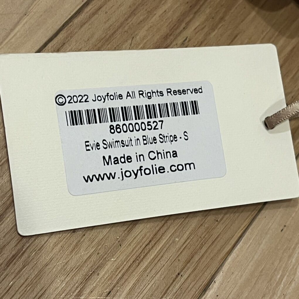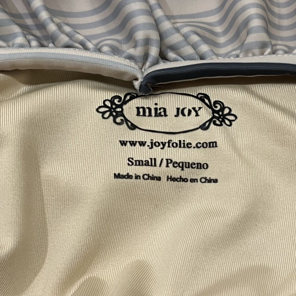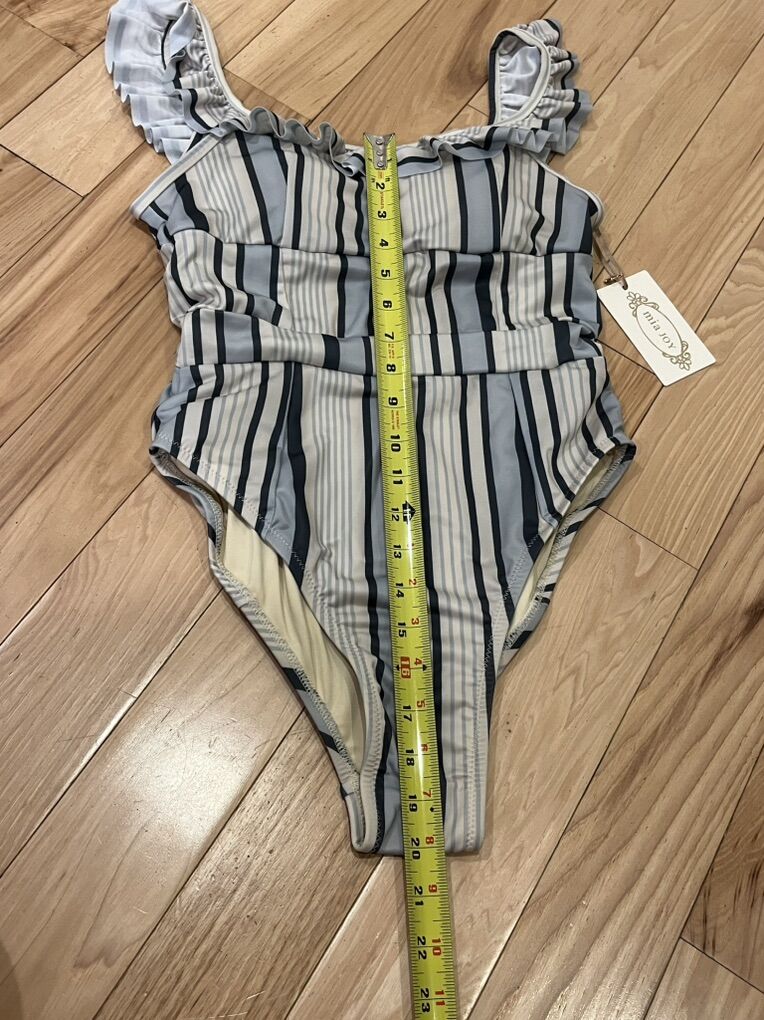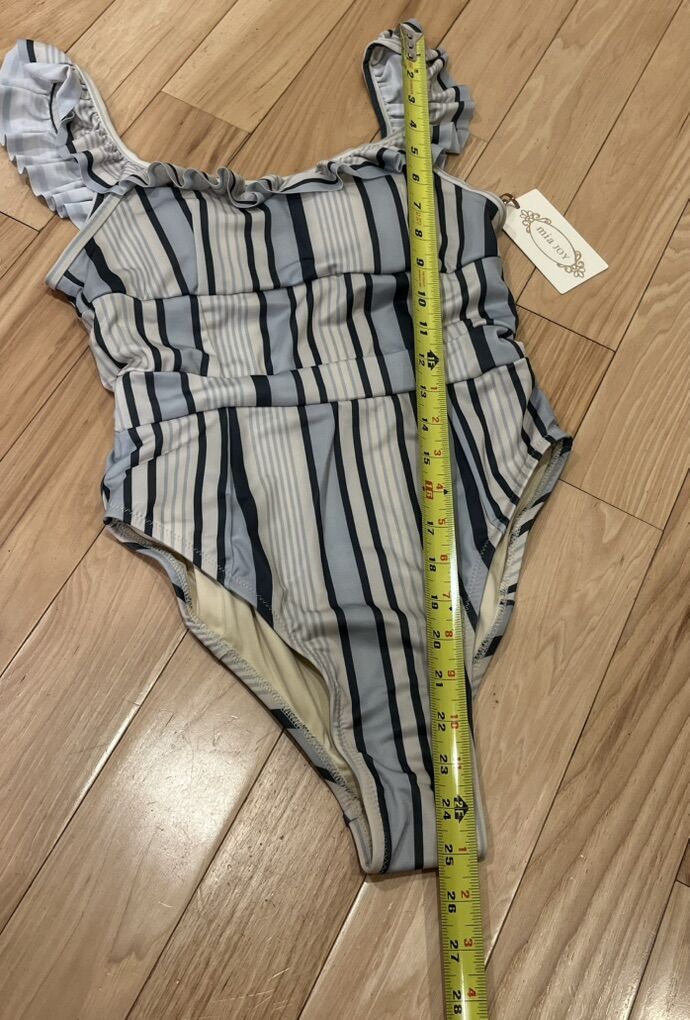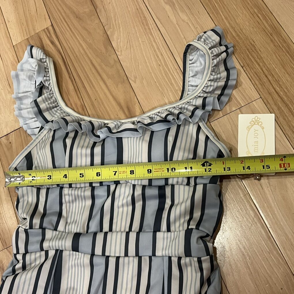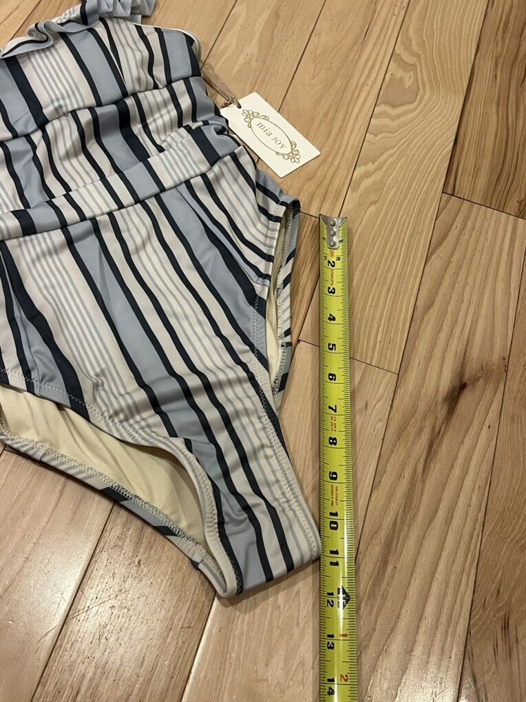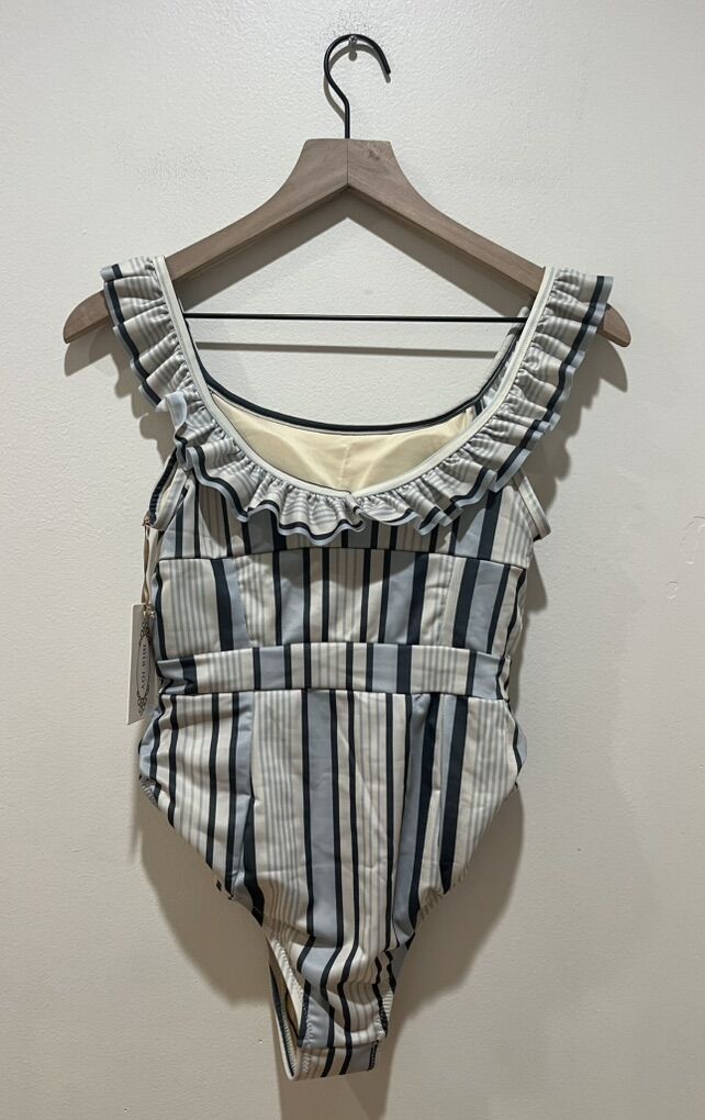 Mia Joy NWT Evie Blue and Beige Vertical Stripes One Piece Swimsuit - Women’s Size Small - with ruffled shoulder straps and removable cup padding - brand new with tags. C025