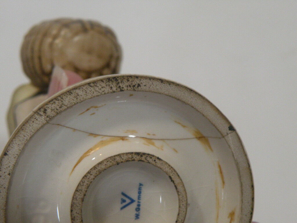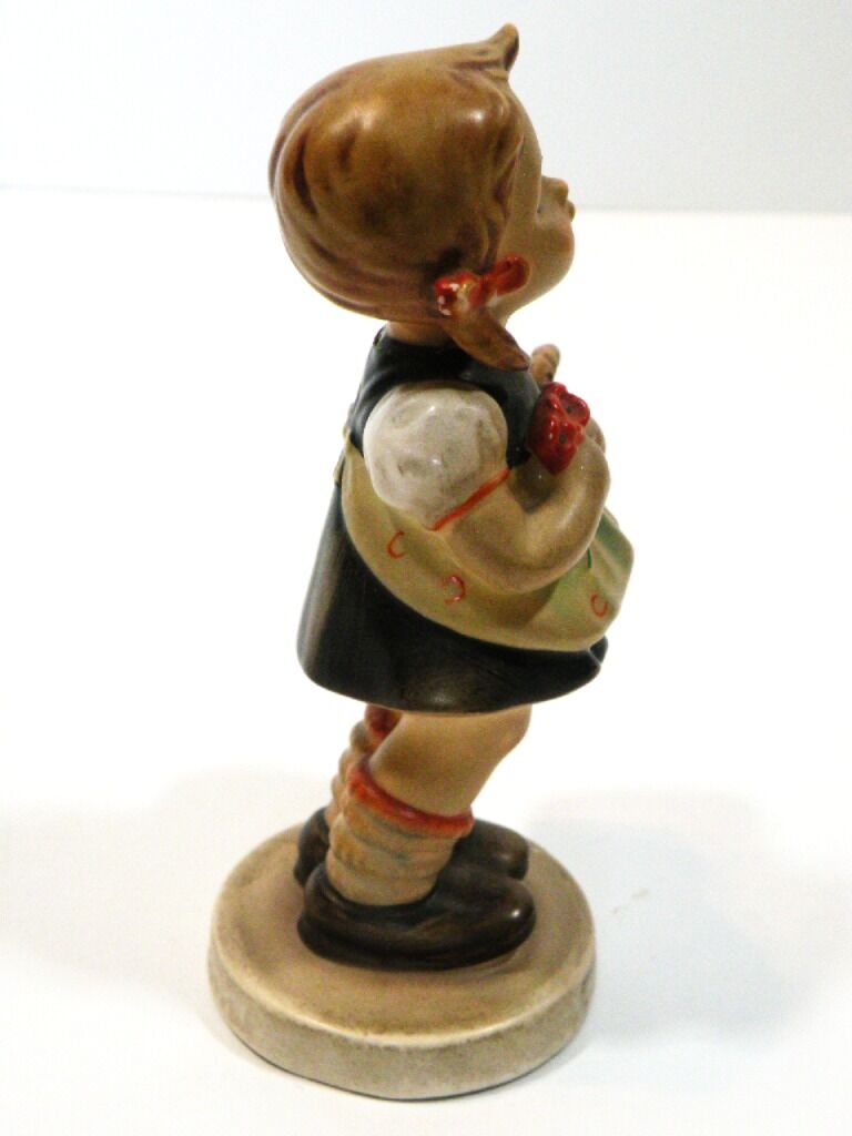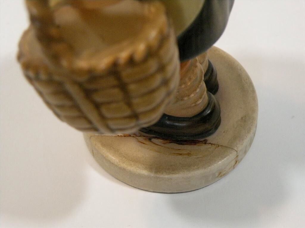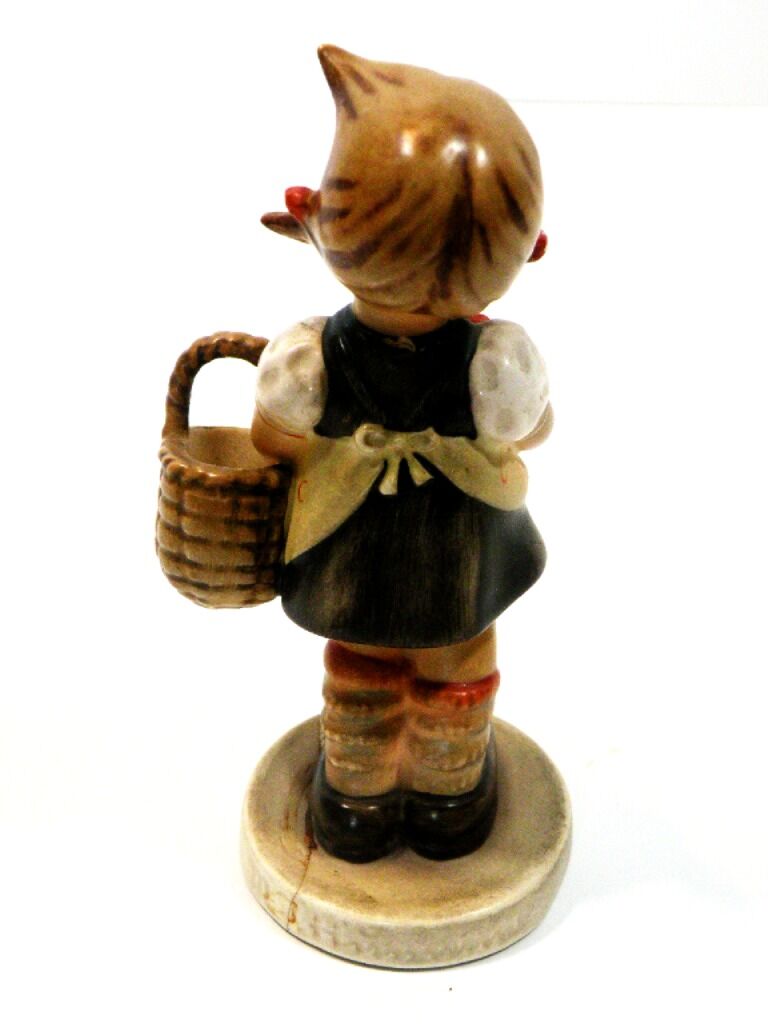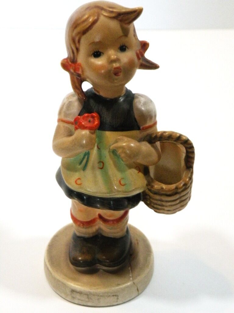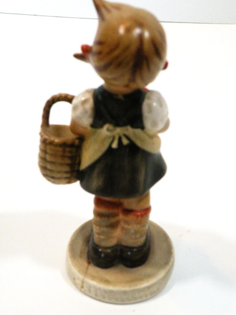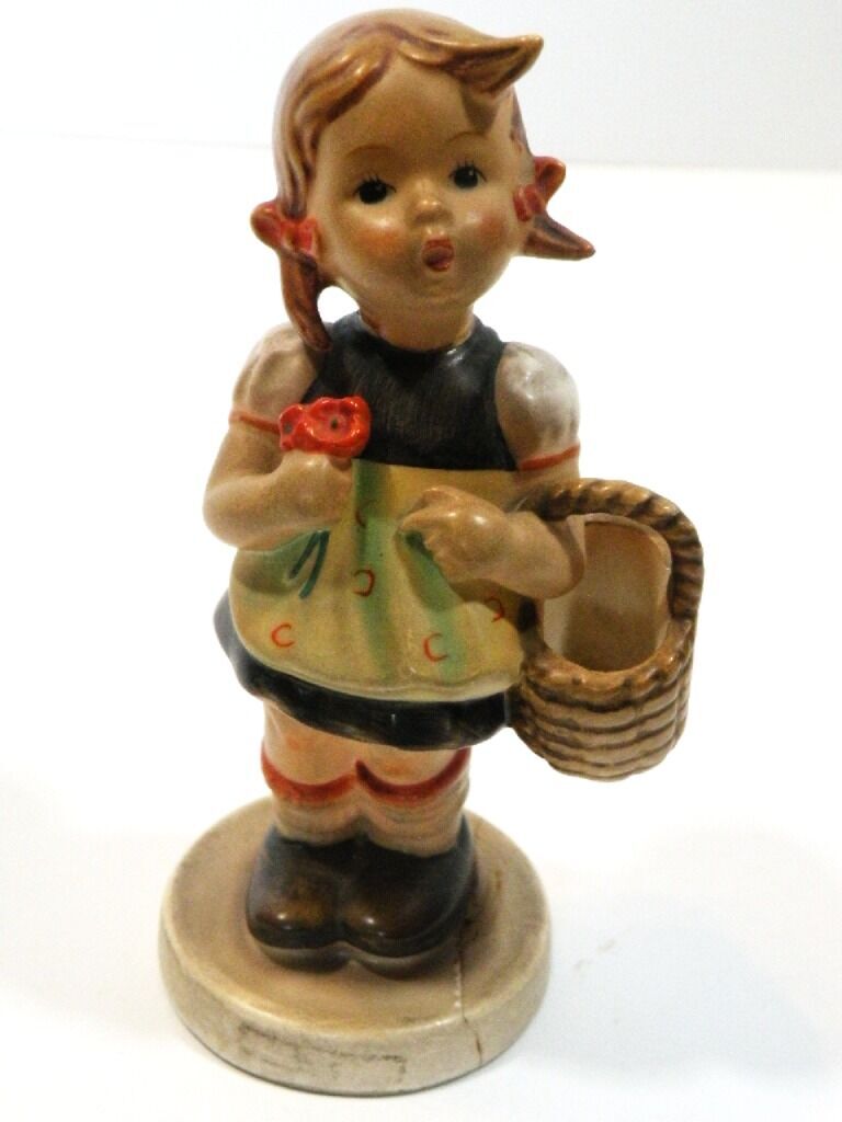 This is a rare hummel figurine of a young girl w flower in one hand and basket on the arm of the other one. The figure itself is larger in statue than the other figurines. The colors are a liitle deeper and the features are quite pronounced. She is a delight and will add character to any collection. These have been in my home since the 1950"s and carefully displayed in a curio cabinet and were brought back from Germany by my mother. It is in great condition except for a minor repair on the base which happened when brought over from Germany in the 1950"s. It has the original markings of the Hummel Dynasty. Etched with original signature of M. I. Hummel. She is adorable.