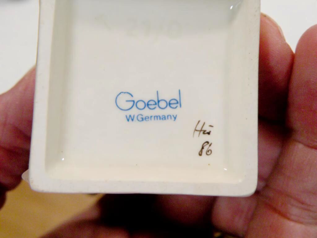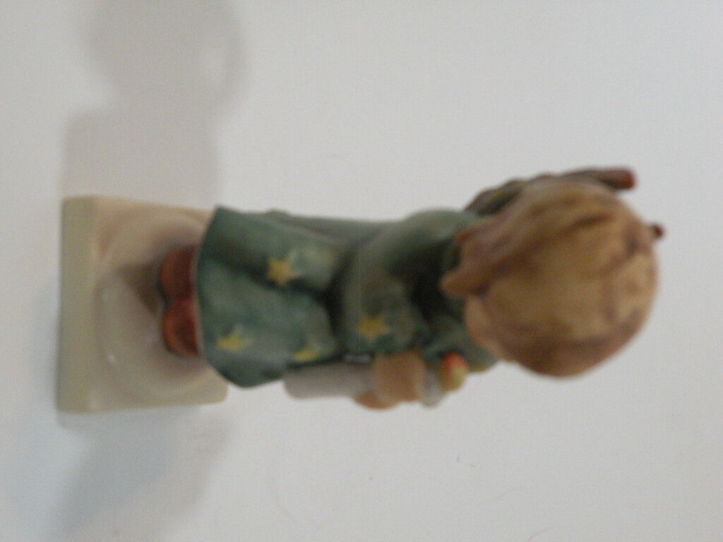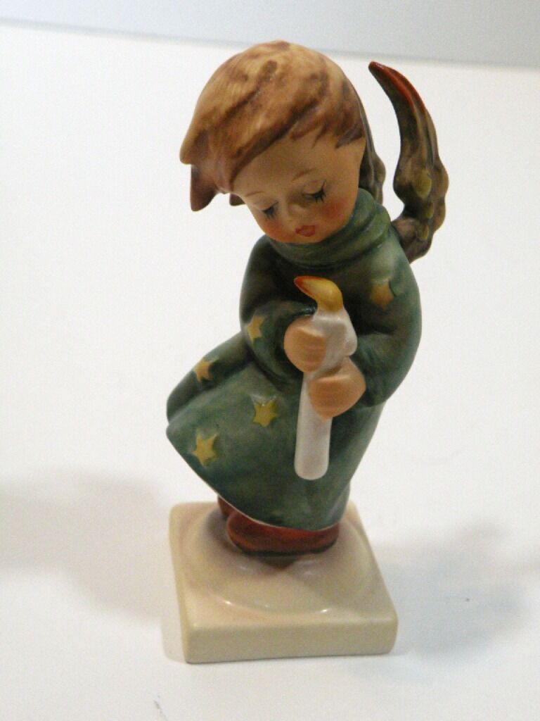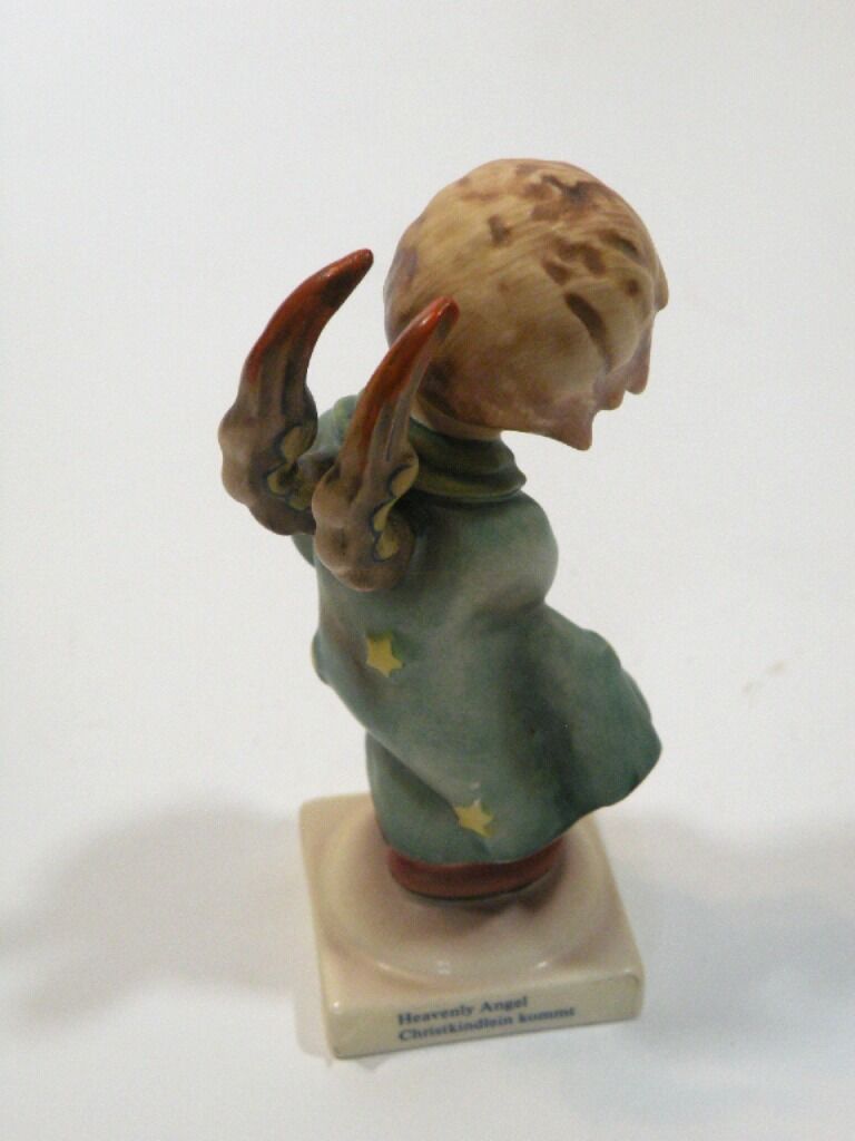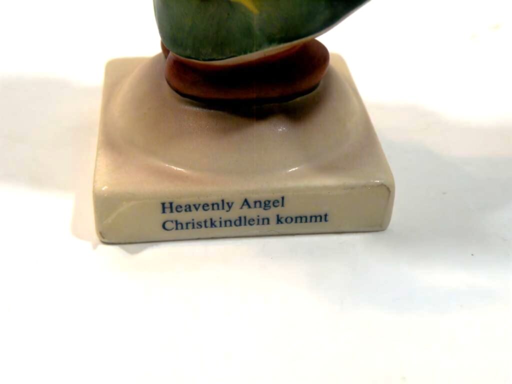 One of the Heavenly Angels. This one is holding a candle and his head is bowed and his eyes closed. He is on a base imprinted with Heavenly Angel Christkinlein Kommt. On the bottom Is Goebel W Germany. It looks like he is praying or bowing before the Father. This is an absolute gem and hard to find with words imprinted on the base and not on a sticker. It will add joy and a sense of peace to any collection or stands alone as a heavenly reminder.