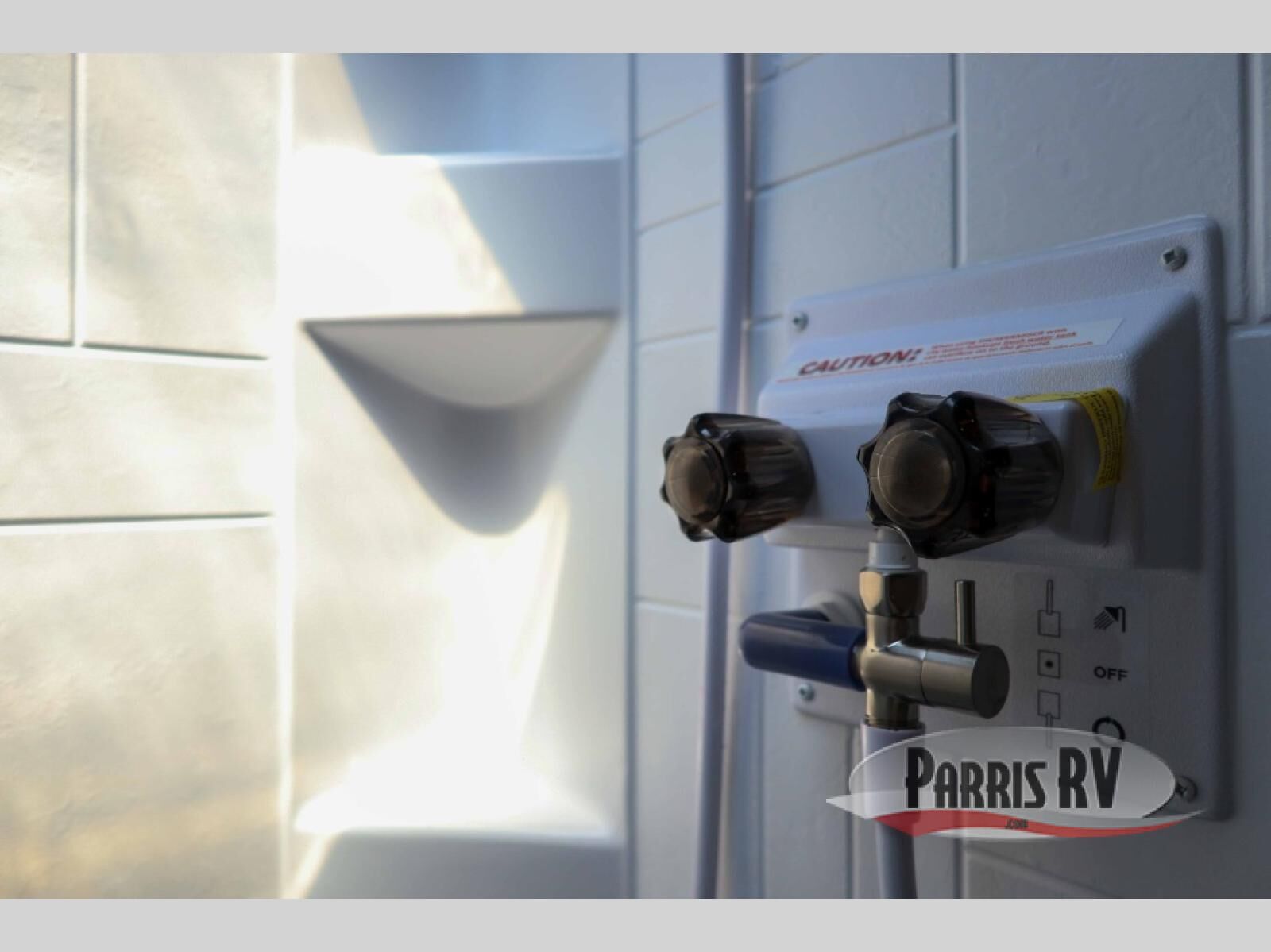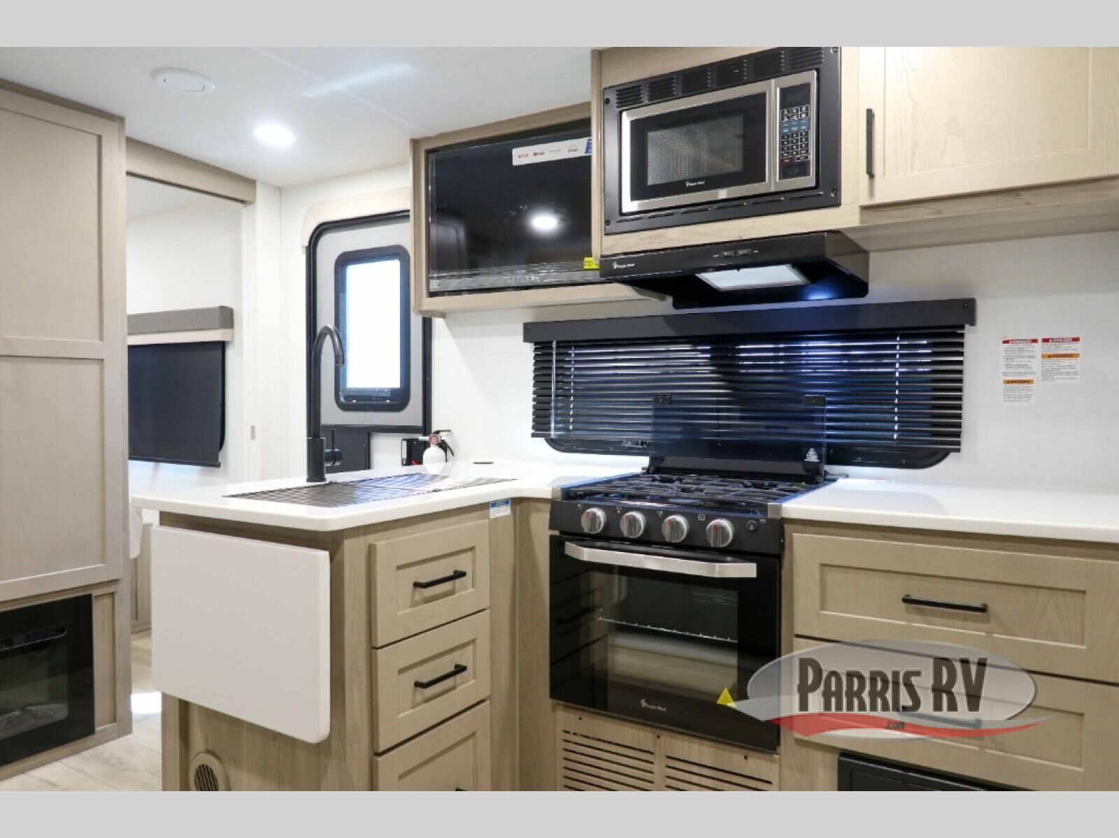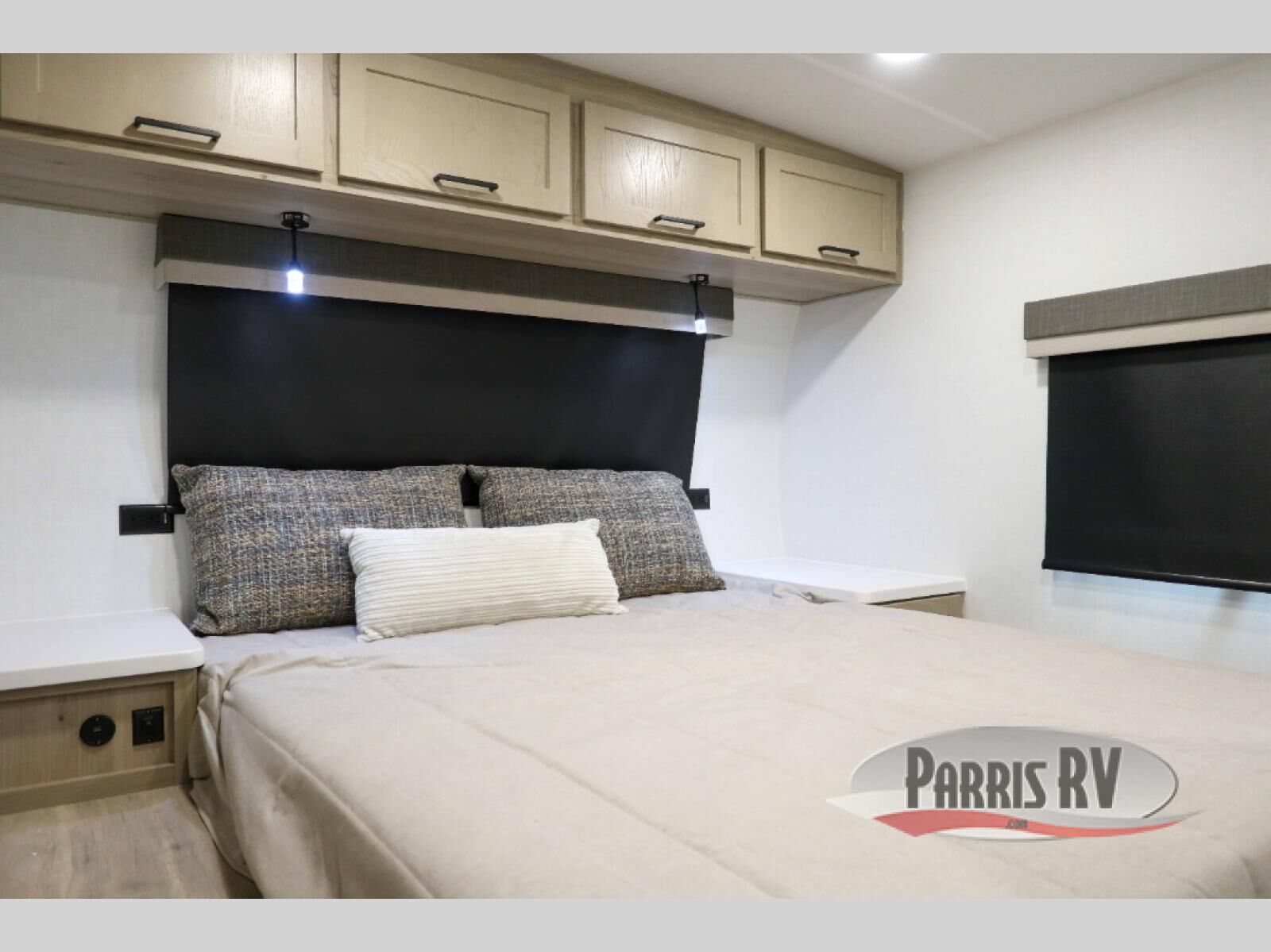 This is the perfect travel trailer for two people looking for comfortable camping trips! You will have your own RV queen bed to sleep on in the front private bedroom, and an optional TV can be added if you enjoy the morning news in bed. Breakfast can be made on the three burner cooktop, or head outdoors to cook on the outside kitchen. The theater seating with a table will provide a place to relax and dine together, and the spacious full rear bath will allow you to clean up before you head out for the day. This model includes plenty of storage space, including two pantries, a wardrobe slide out in the bedroom, plus a drop-frame pass-through storage for larger camp gear!
