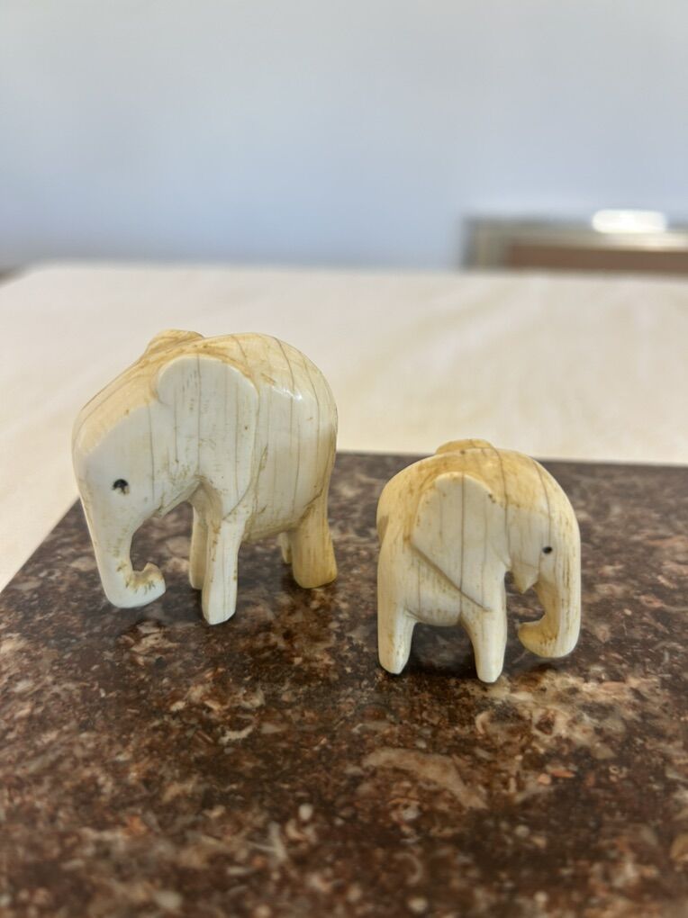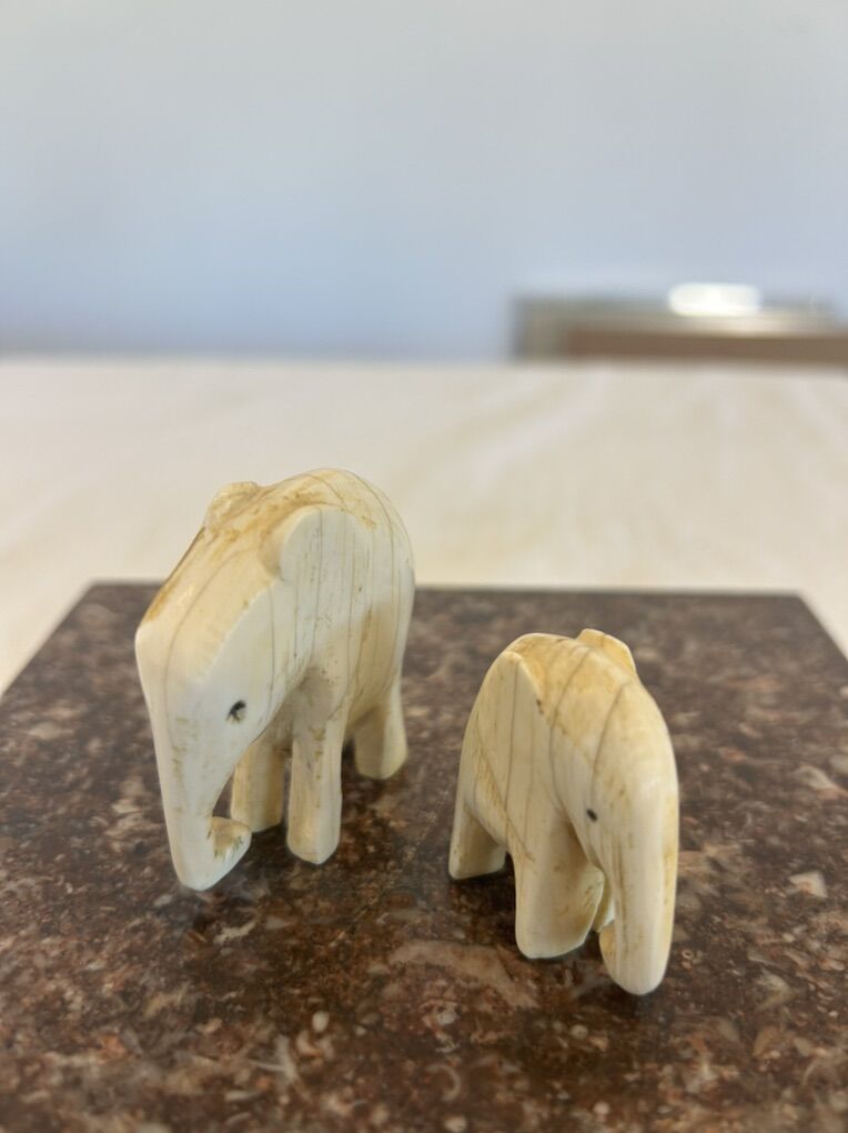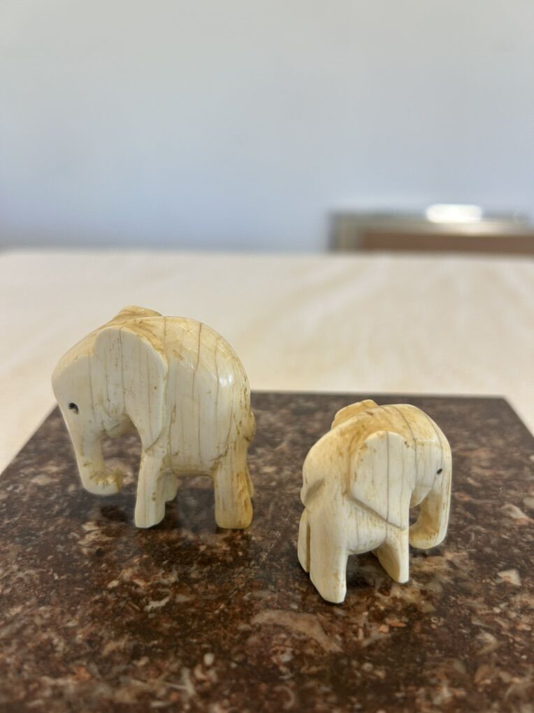 ZelleTwo hand-carved elephant figurines, likely intended as decorative pieces. They appear to be made from a light-colored, possibly organic, material with visible grain or striations.