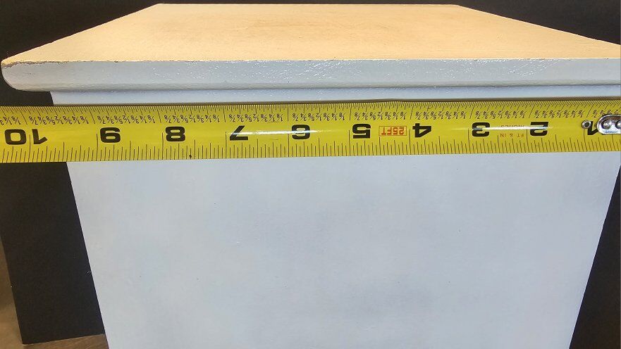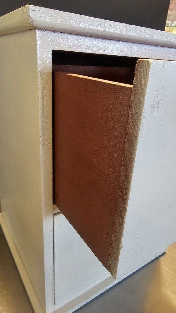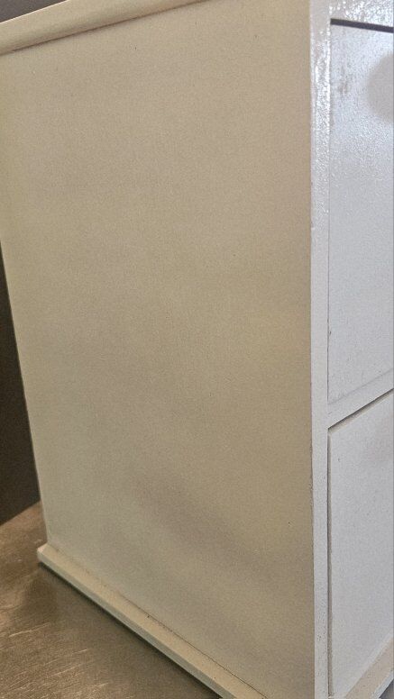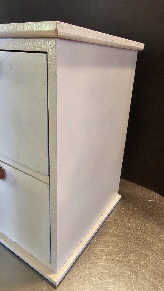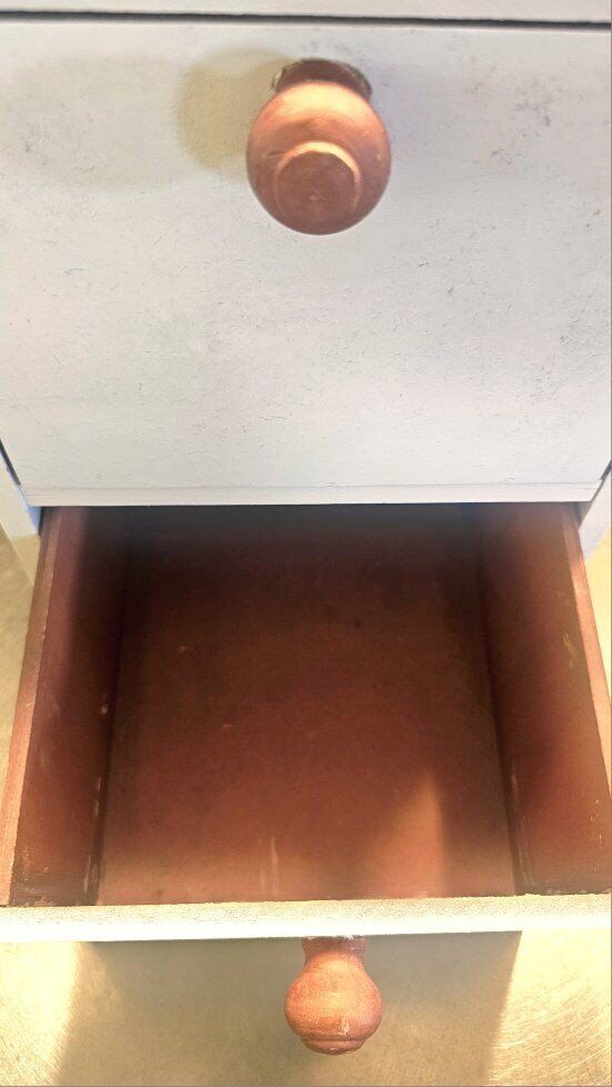 White counter top, DEEP 2 drawer cabinet. This is a heavier cabinet so it stands without tipping easily and could hold a bunch of your 'stuff'! The drawers are red inside as are the pull knobs.