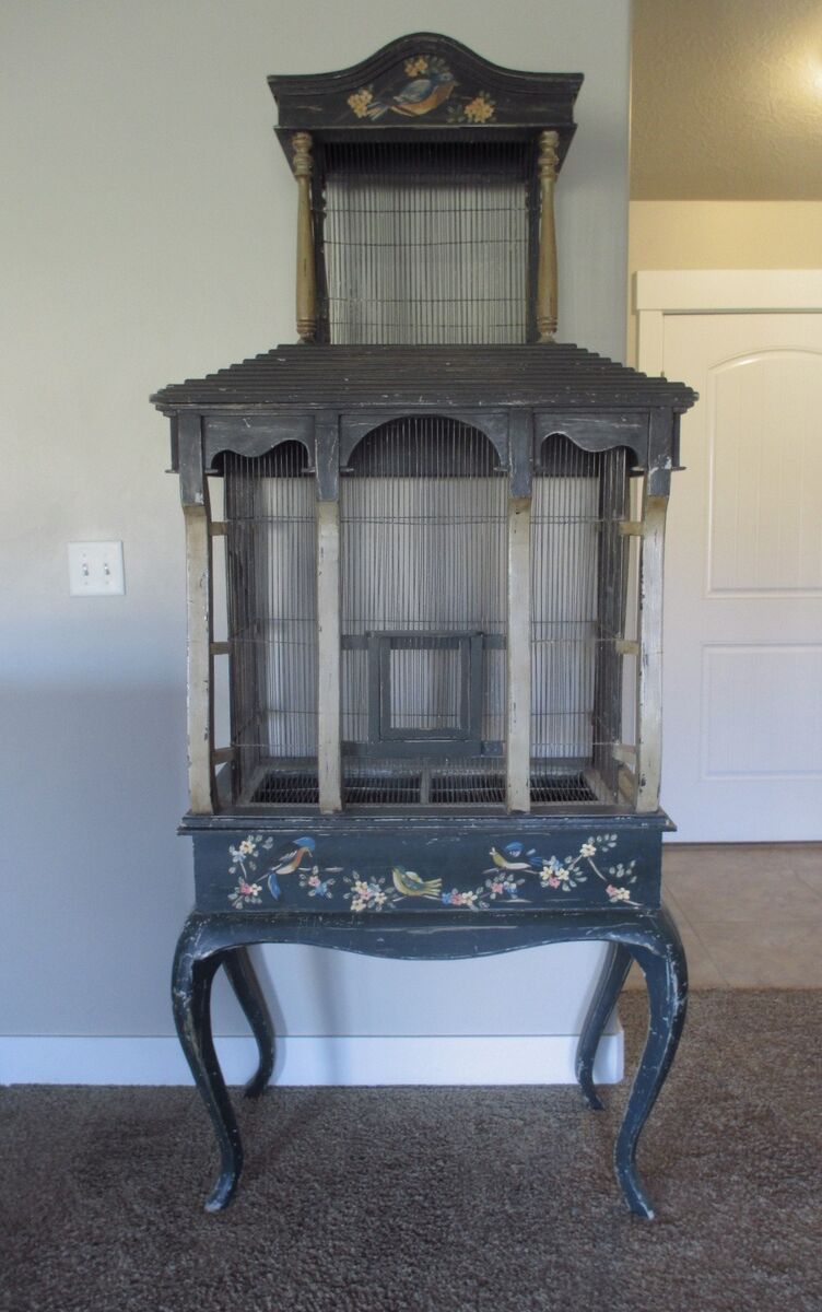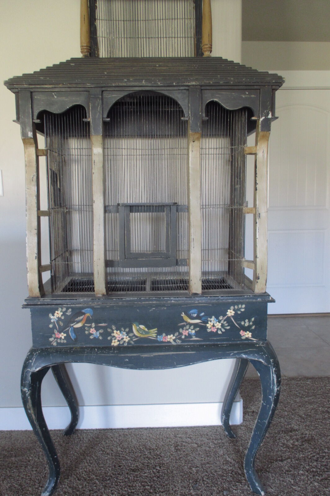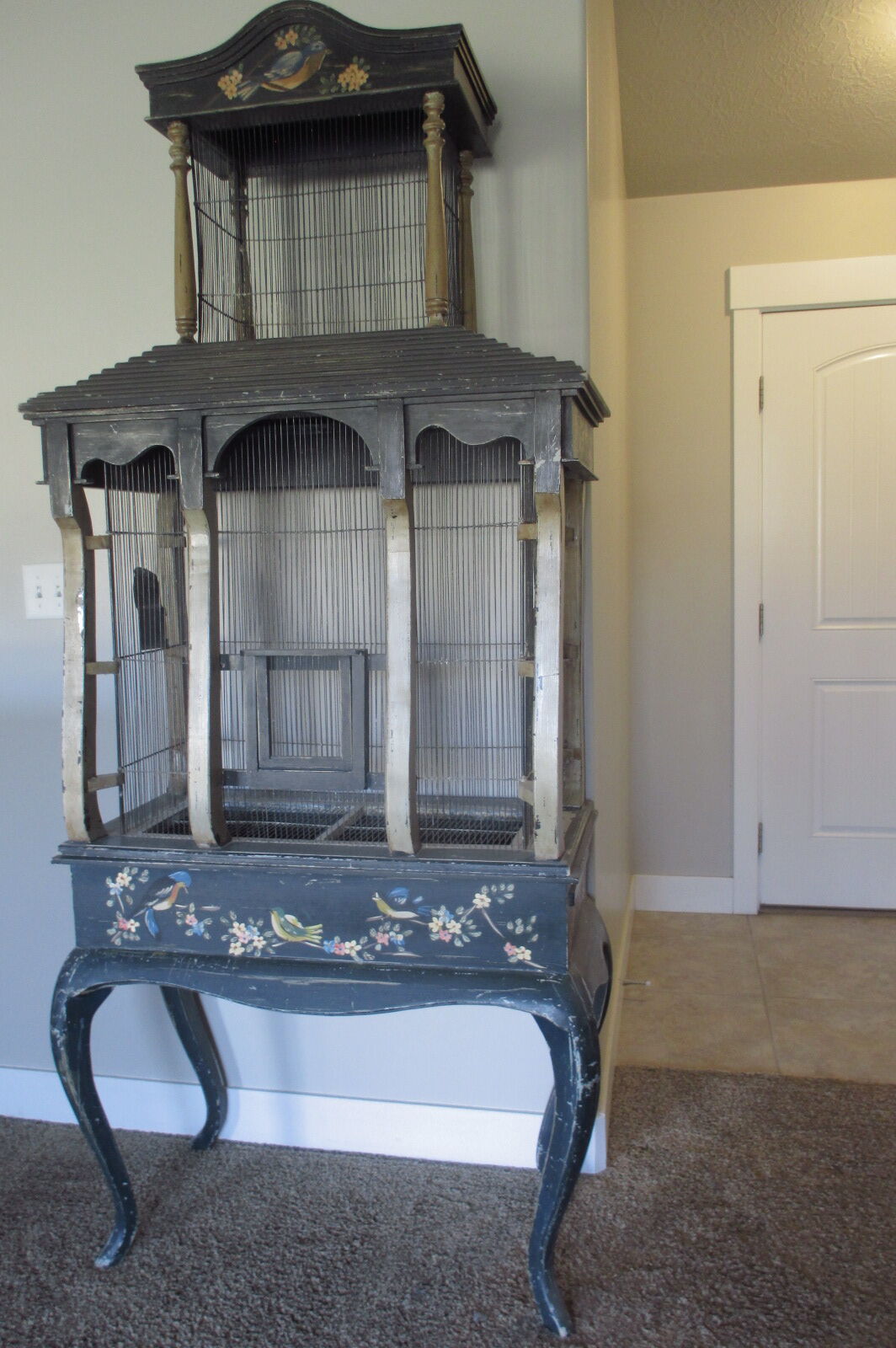 VenmoQuality sturdy wood construction, 3 very large tiers, base, middle, & top piece. Original deep green with colorful hand painted birds gracing all sides. Adds charm & character to home, & makes a beautiful mansion for pet birds. Wood front door, seed & water slide up compartments, bottom pull out tray for easy access cleaning. Beautiful clean vintage condition, not perfect or new, shows natural wear & aging as expected for a vintage bird cage, nothing broken or missing, exact age & origin unknown, But believed to be approx 40 yrs old, possibly from Argentina. **Much more colorful than in photos, pics dont really do justice to this unique bird cage
