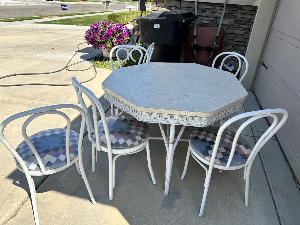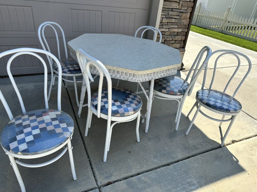 VenmoSet of 6 Bentwood chair and 1 vintage wicker table with Formica top