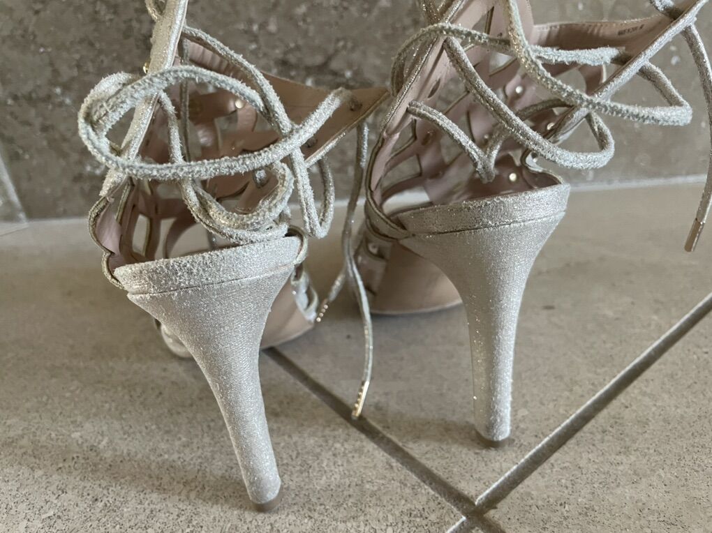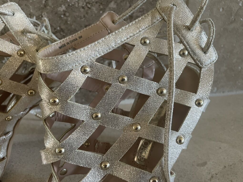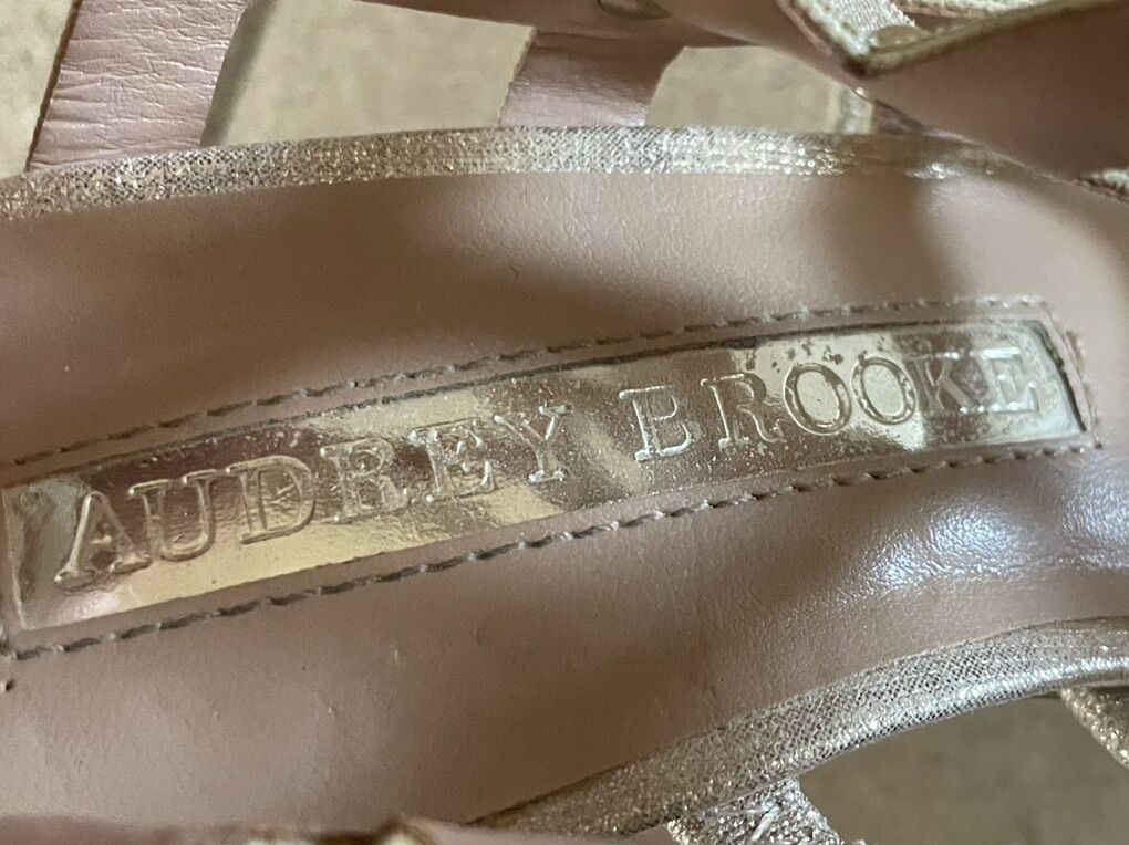 I have a beautiful pair of Audrey Brooke heels that are a sparkly rose gold or champagne color. They are a size 6. They have little metal studs where the straps cross. They look almost new but have a little wear on the bottom of the souls. The heels are high (almost 4 inches). See my other ads for jewelry, artwork, home decor and more.
