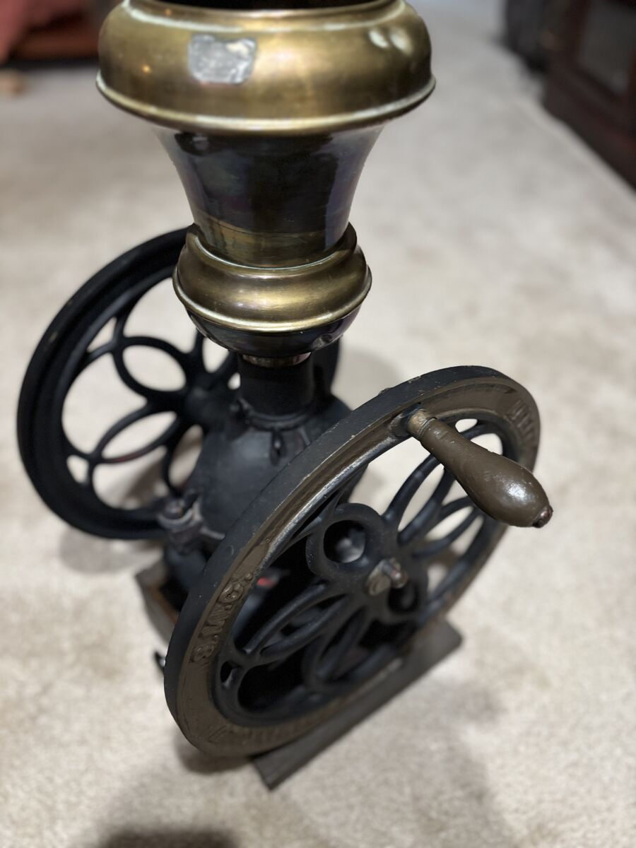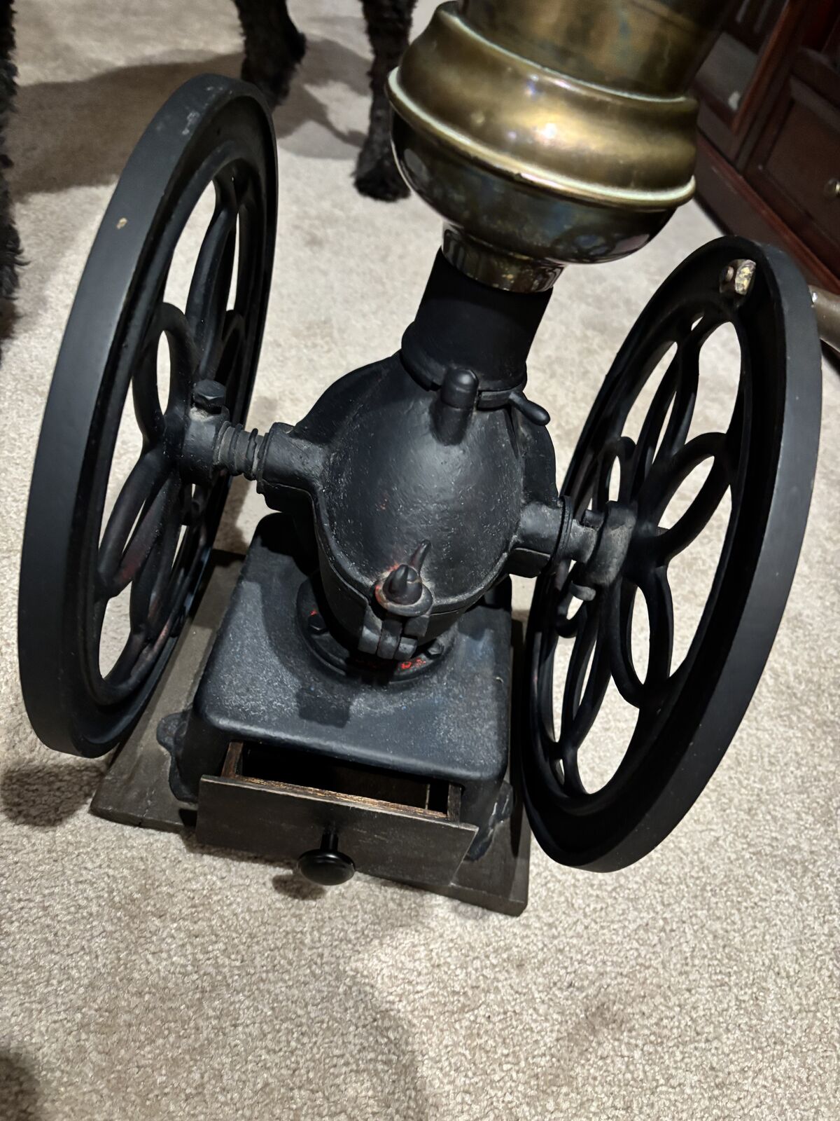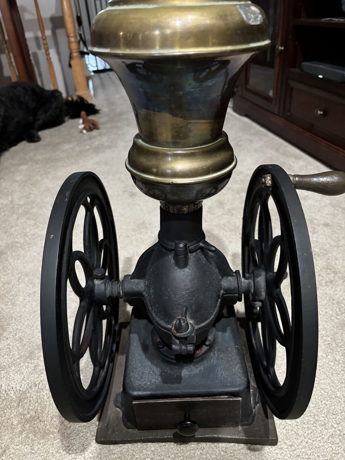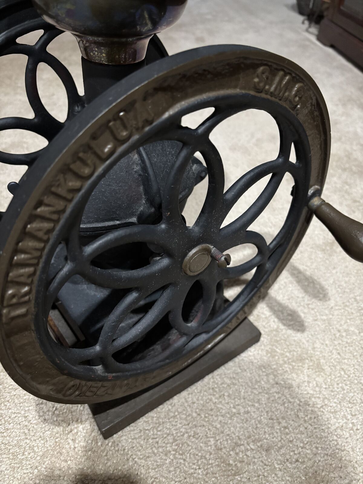 VenmoAntique Coffee Grinder. Unknown Origin - Markings: Tramankula/Akeita/Eyotzeko/S.M.C. (Basque, French, Japenese/Hawaiian?). Nice piece - has a broken lug hidden by tie down washer & bolt...brass hopper has a few minor indentations & missing one wooden handle. Catch drawer intact in great condition. Great display piece for business or home!