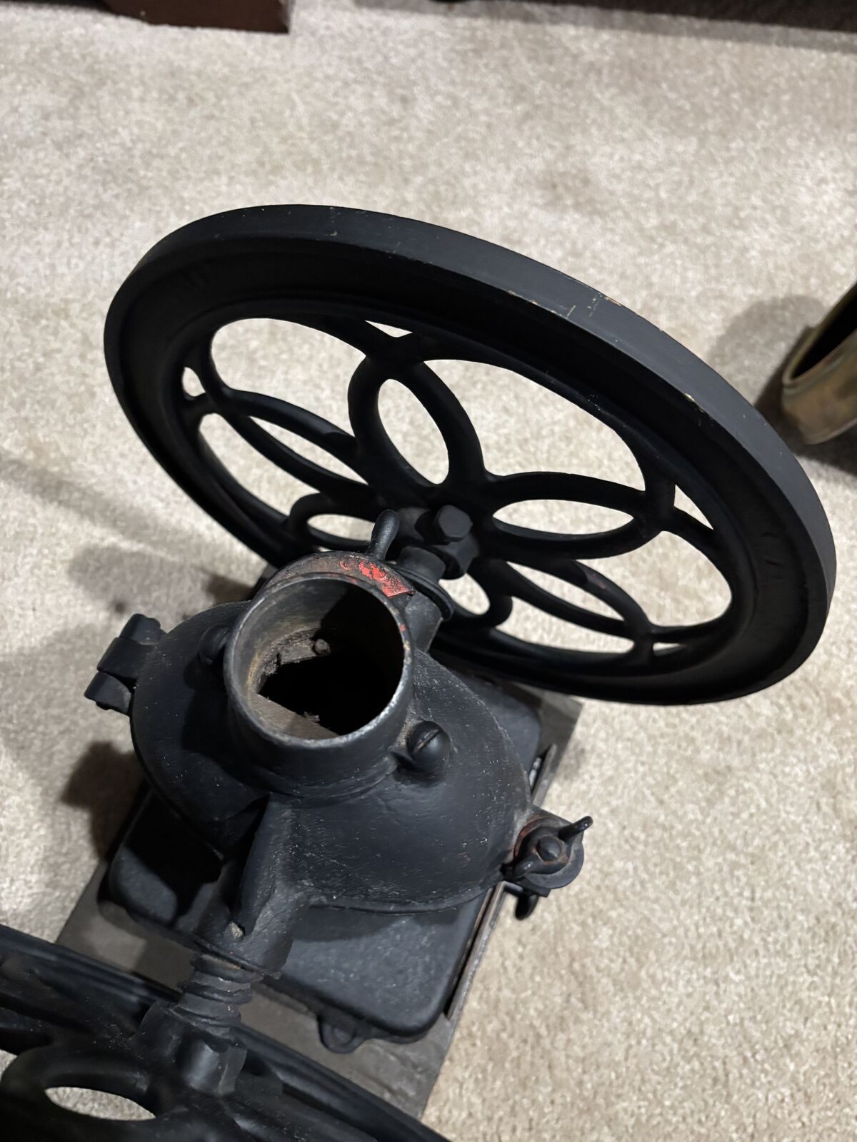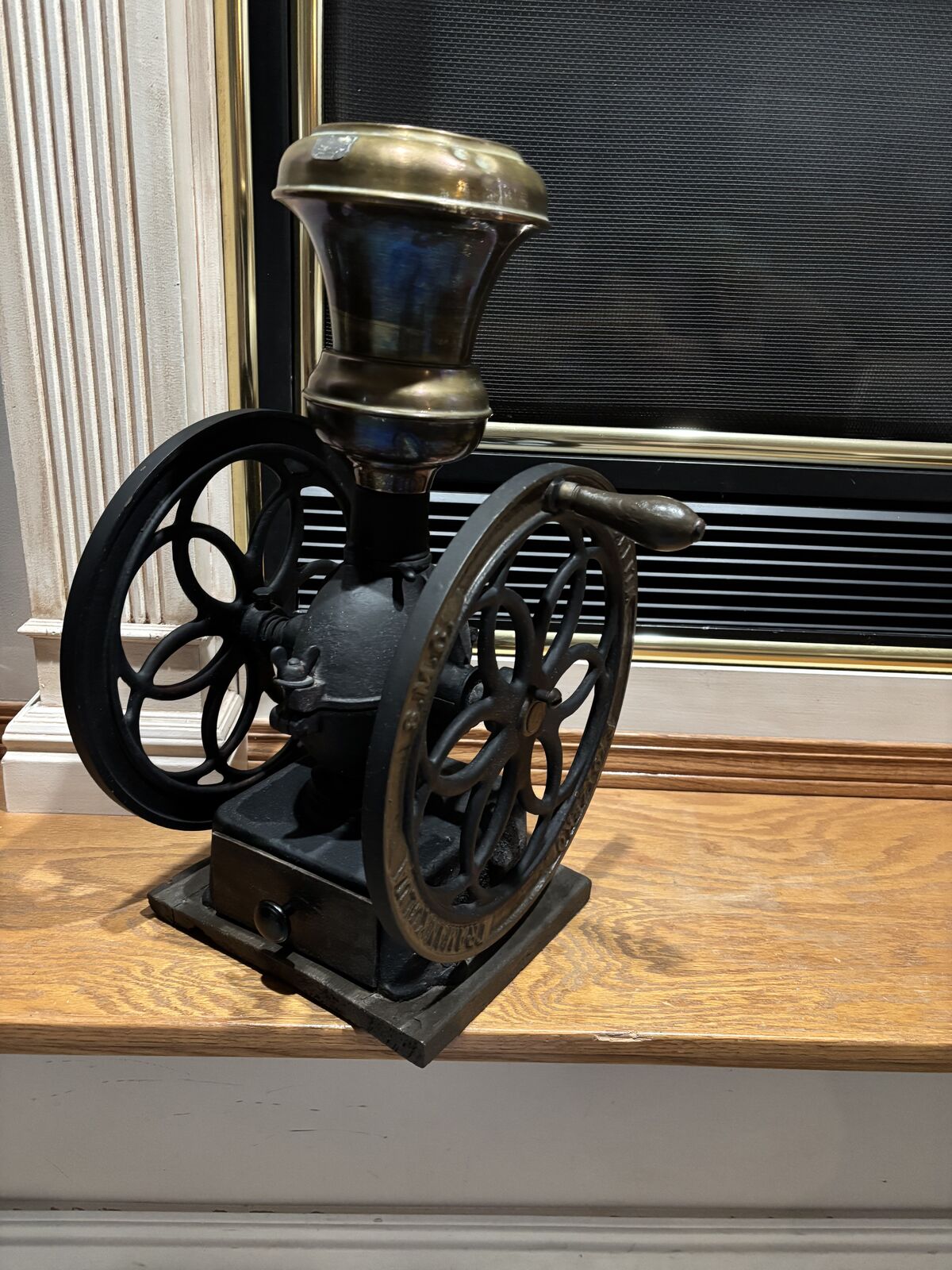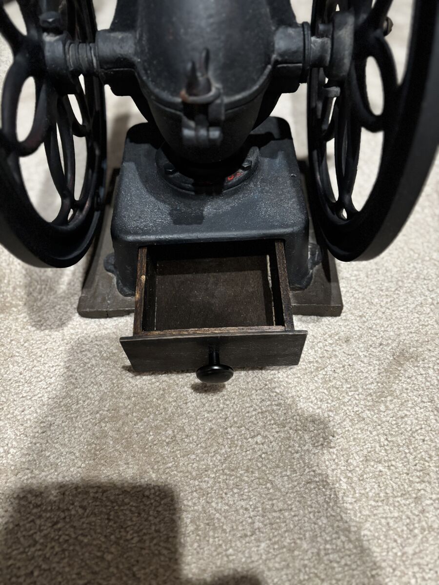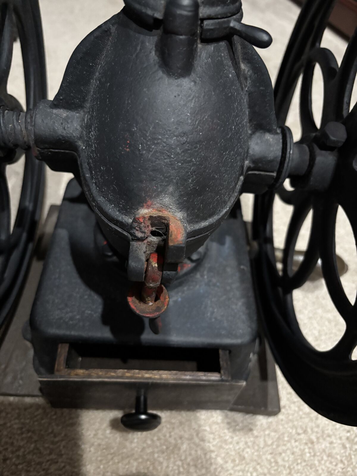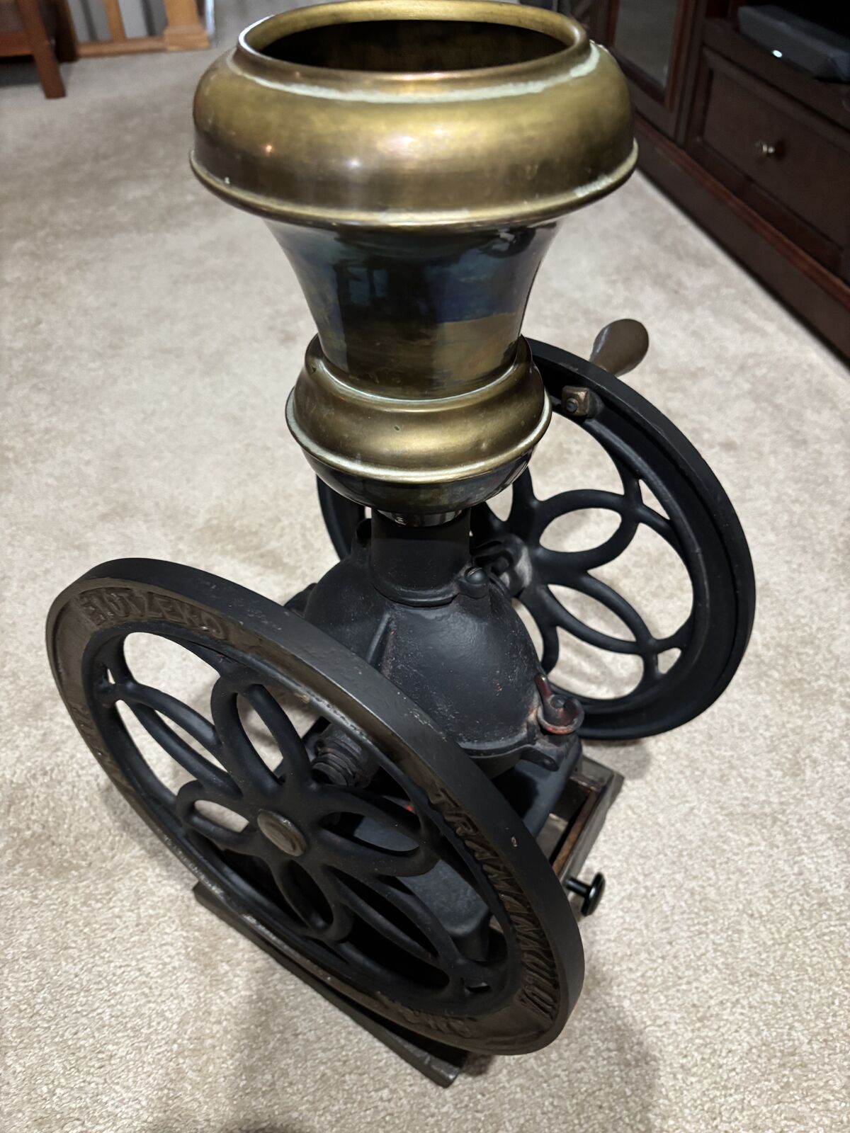 VenmoAntique Coffee Grinder. Unknown Origin - Markings: Tramankula/Akeita/Eyotzeko/S.M.C. (Basque, French, Japenese/Hawaiian?). Nice piece - has a broken lug hidden by tie down washer & bolt...brass hopper has a few minor indentations & missing one wooden handle. Catch drawer intact in great condition. Great display piece for business or home!