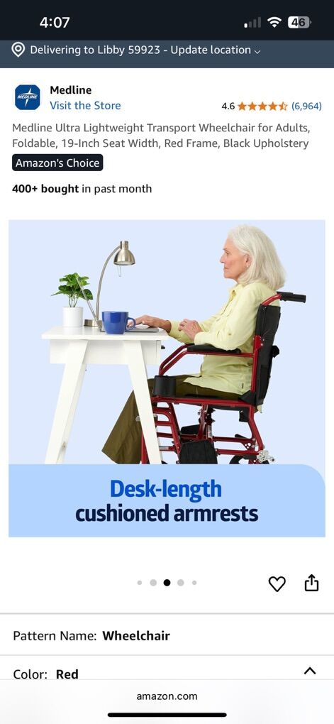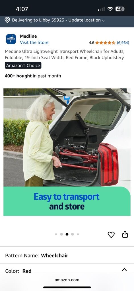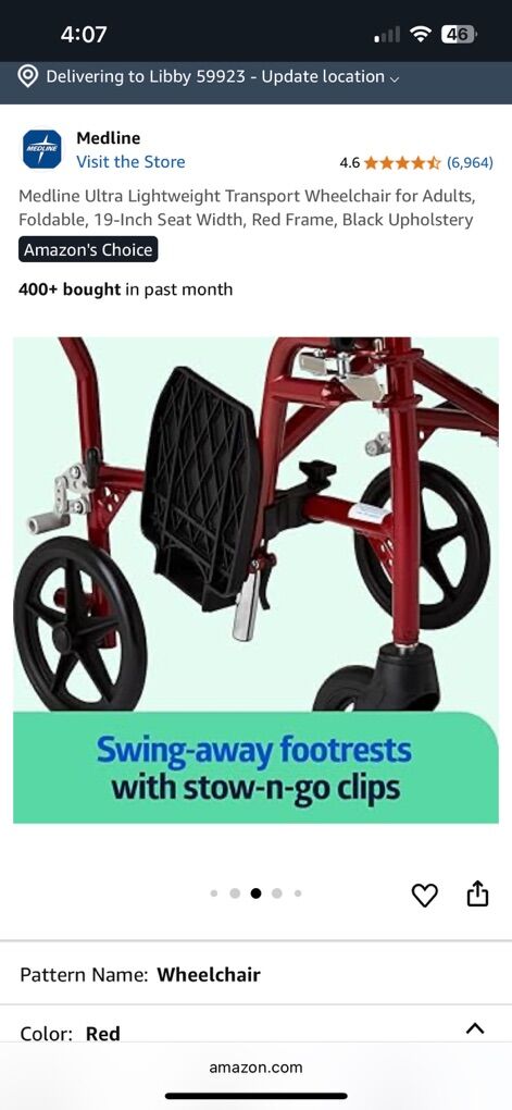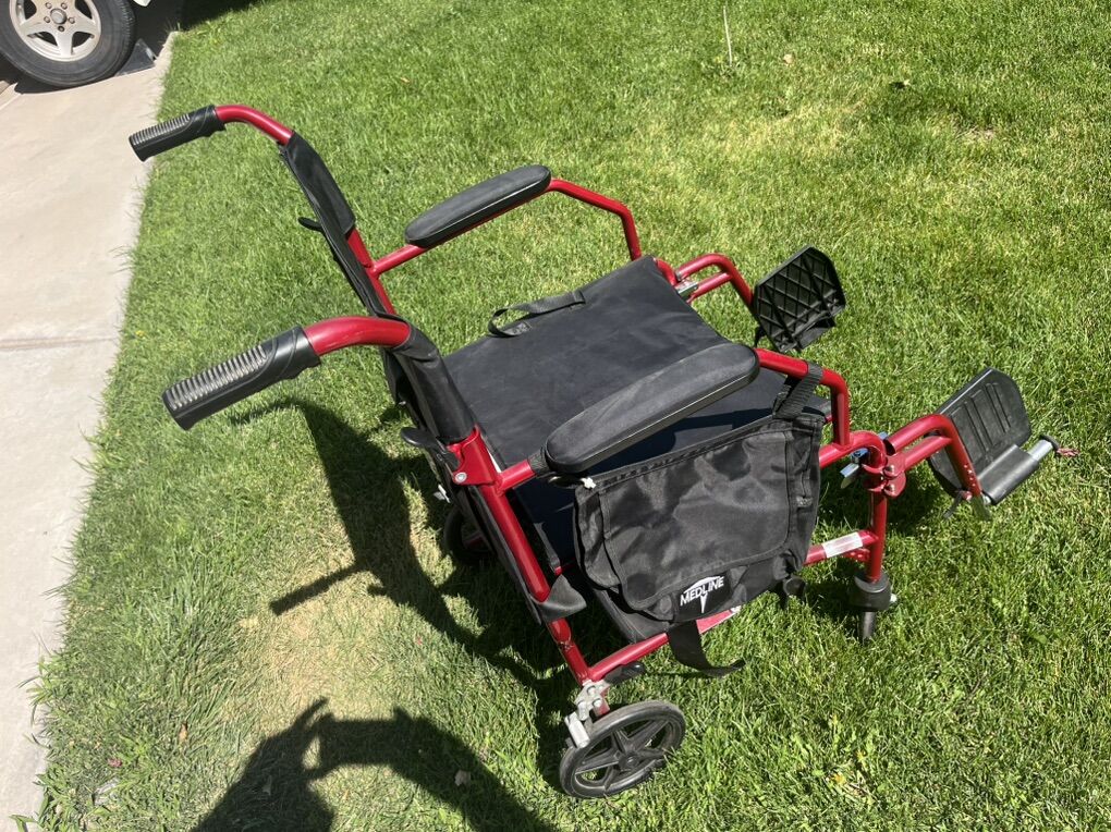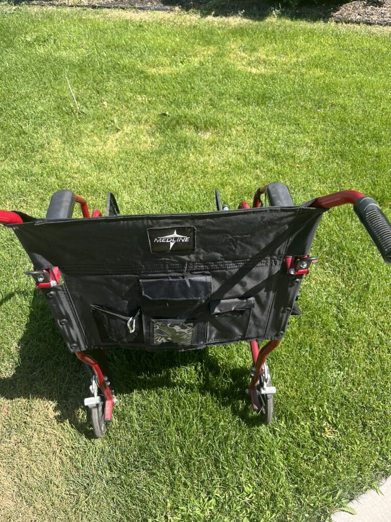 Medline Ultra Lightweight Transport Wheelchair for Adults, Foldable, 19-Inch Seat Width, Red Frame, Black Upholstery