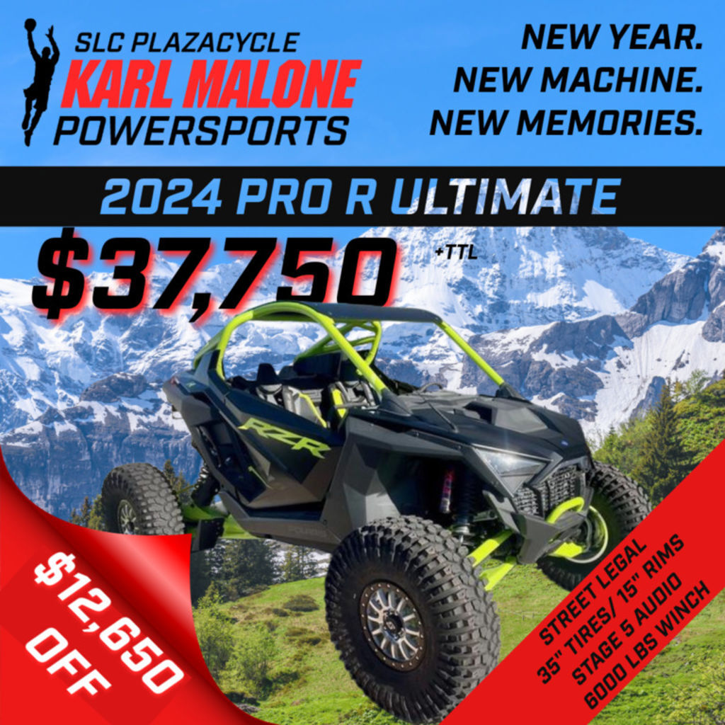STREET LEGAL KIT, STAGE 5 AUDIO UPGRADE, MIRRORS, 35" ROXXZILLA TIRES, 6000 LBS WINCH, 15" SANO RIMS OVER $12500 OFF! STREET LEGAL KIT, STAGE 5 AUDIO UPGRADE, MIRRORS, 35" ROXXZILLA TIRES, 6000 LBS WINCH, 15" SANO RIMS Call or text Karl Malone Powersports SLC at 801-972-8725 for quick, hassle-free out-the-door pricing! With top brands including Polaris, Can-Am, Yamaha, Honda, Kawasaki, CF Moto, and more, we have everything you need to get out and ride this season. New 2024 Polaris RZR Pro R Ultimate Side by Side UTV For Sale In Salt Lake City, UT This New 2024 Polaris RZR Pro R Ultimate Side by Side UTV is for sale at Karl Malone Powersports SLC conveniently located in Salt Lake City, Utah. Our knowledgeable team is eager to assist you, so don’t hesitate to contact us today to schedule an appointment. If this isn't the exact Polaris Side by Side UTV you're looking for don't hesitate to go back and revise your search. We're sure to have the perfect Side by Side UTV for you in our showroom in Utah. We invite you to visit us at Utah’s premier Polaris dealer for new and pre-owned Side by Side UTVs for sale. Let us help you find the ideal Side by Side UTV to take home today! Karl Malone Powersports SLC Address: 1379 W 3300 S, Salt Lake City, UT 84119 Phone: (801) 972-8725 2024 Polaris RZR Pro R Ultimate NEXT LEVEL IN WIDE OPEN PERFORMANCE REVOLUTIONARY POWER. INCREDIBLE STRENGTH. Built with the biggest factory side-by-side engine ever, the RZR Pro R is the choice for the most demanding drivers. Features may include: POWER RZR Pro R is a powerful new breed of 2- or 4-seat side-by-side. It has got the largest factory engine ever dropped into a performance side-by-side and an exceptional capacity to power custom accessories. STRENGTH RZR pioneered the sport of side-by-side performance. No side-by-side has covered more miles of dune and desert terrain and no brand has more history. Game Changer Rewriting the rules of side-by-side performance isn't just making one thing better, it’s about challenging everything. Innovation starts here. CONTROL Outrageous power demands exceptional control. RZR Pro R delivers, with the widest stance, longest wheelbase, strongest suspension and four groundbreaking, new ride and handling modes. DYNAMIX DV HANDLING MODES Advanced suspension designed to create a comfortable ride, even on the most extreme terrain. UNRIVALED COMFORT A RZR Pro R is more than just unmatched capability and unbeatable performance, it's also built with industry-leading technology to enhance your off road adventures. Includes DYNAMIX DV with 4 Selectable Ride Modes RIDE COMMAND Integrated into a 7" Display and Rear Camera RIDE COMMAND+ Technology Rockford Fosgate® Stage 2 Audio FOX X2 Live Valve 3" Shocks Telescoping Steering Wheel & Button Controls Aluminum Roof