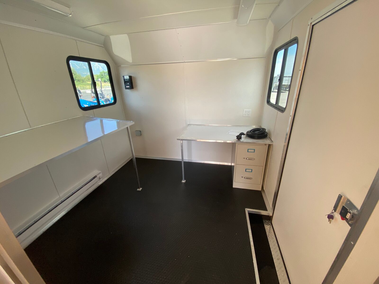 20' Office Trailer 5K Axles Job Site Office and storage space are rolled into one in this steel-framed trailer. The office features paneling, desk with file cabinet, planning table, heating and air conditioning, plus 110-volt lighting - and four windows. The rear bay area is ready for storage.